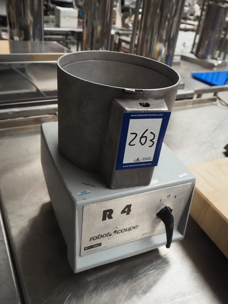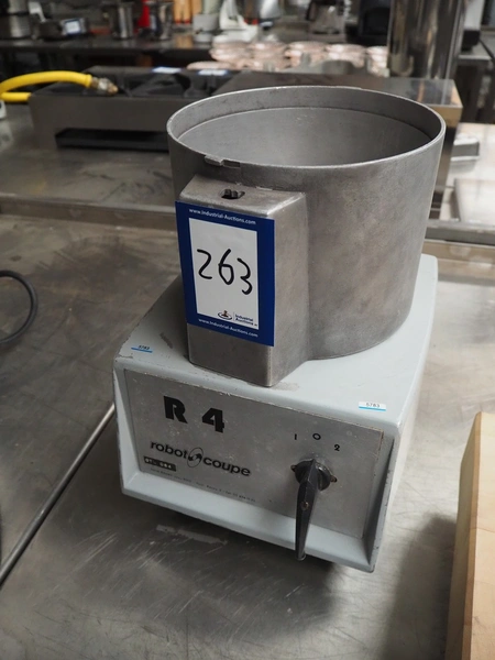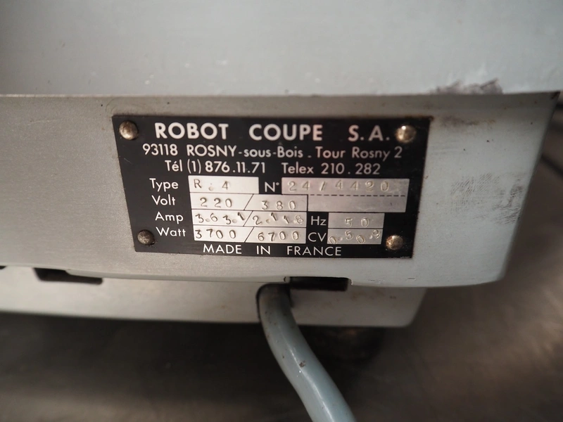 Robot Coupe slicer, type: R.4, serial number: 24/4420, 220/380 V, 50 Hz, 3.6 A, 6700 W, dimensions: 330 mm x 270 mm x 370 mm.