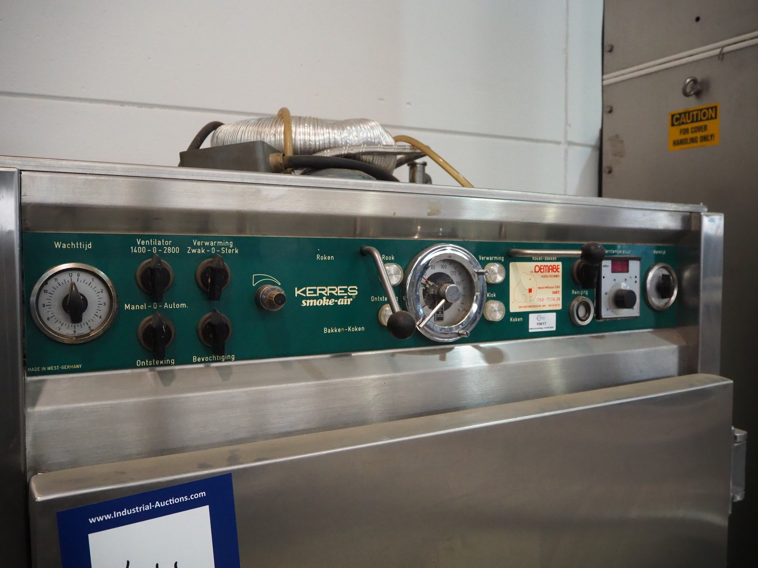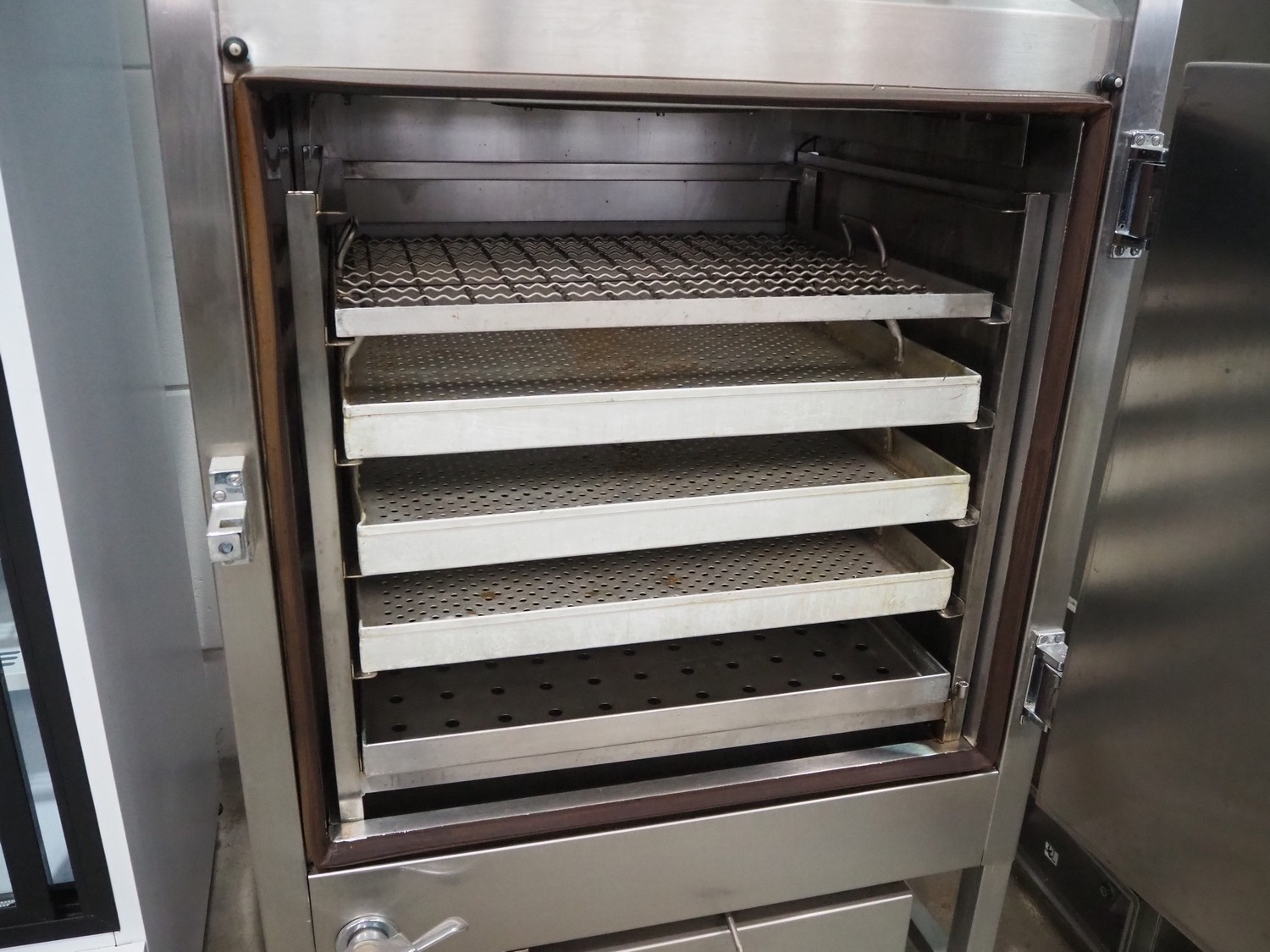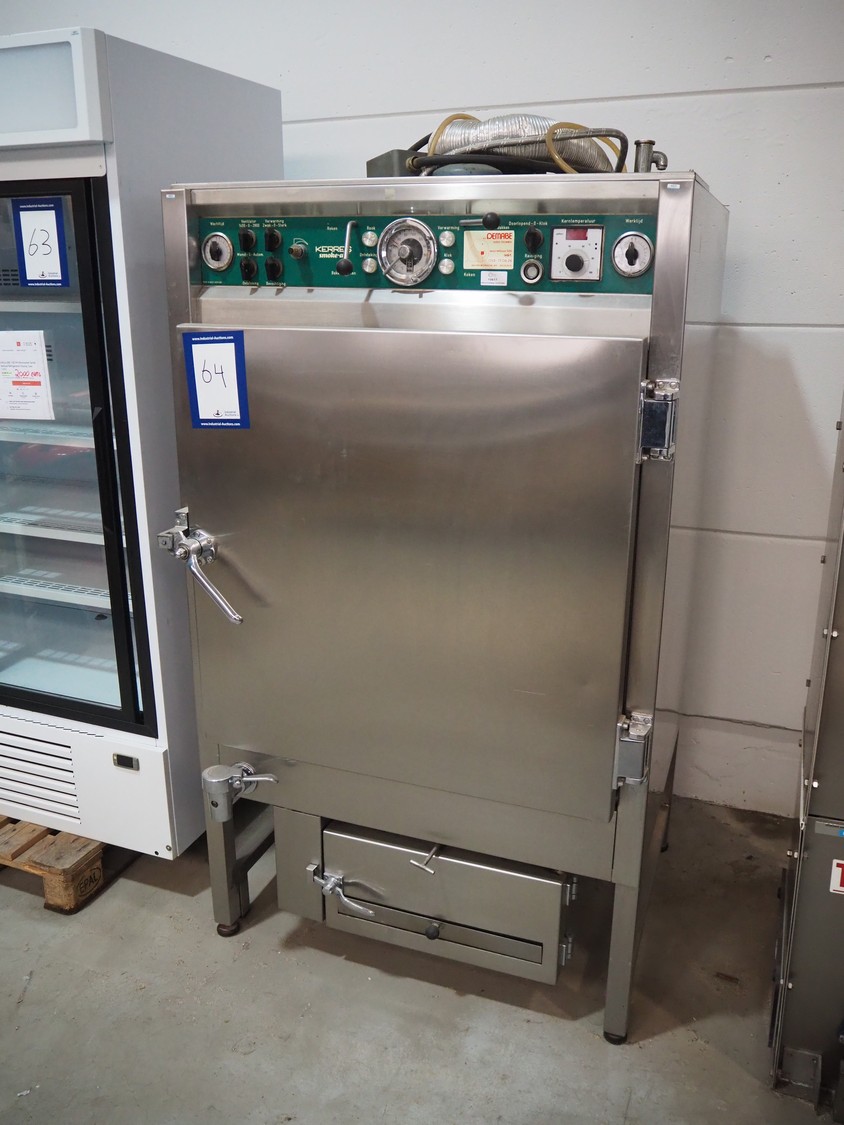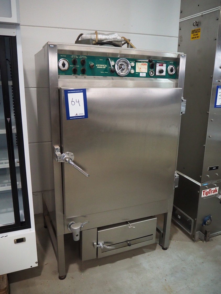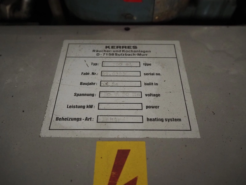 Kerres smoking, cooking and frying chamber with smoke generator for wood chips, type: 0S 700 o1, serial number: 09.0323, year of construction: 09.89, 380 V, 50 Hz, 6 floors, dimensions floor: (6x) 700 mm x 800 mm, total dimensions: 1060 mm x 920 mm x 1800 mm.