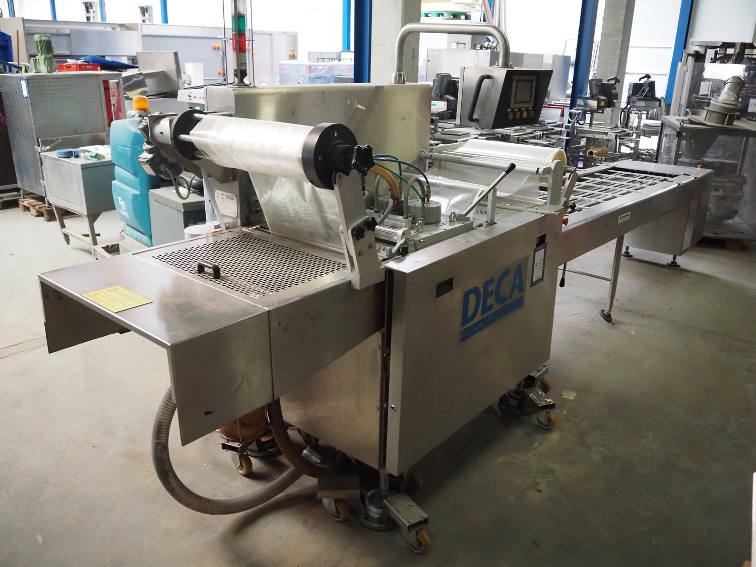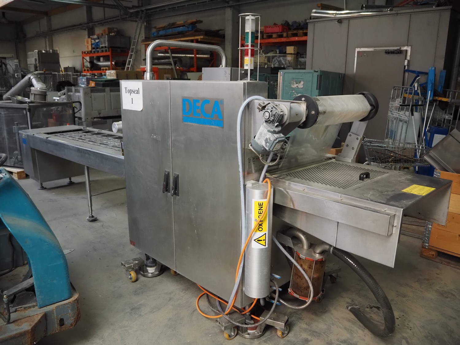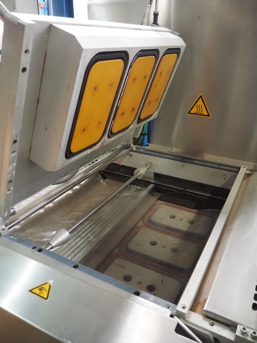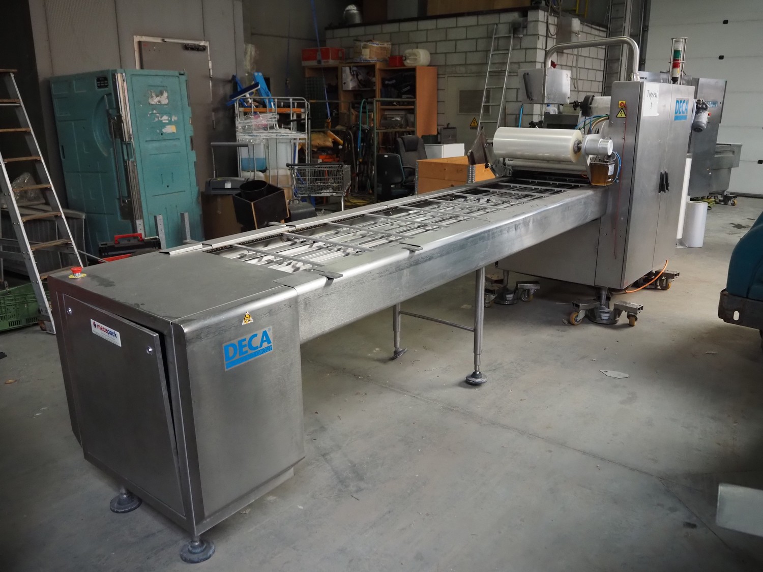 Meca Plastic traysealer, type: 2005, number: 5745, year of construction: 2004, film width: 560 mm, dimensions dye: (3x) 210 mm x 125 mm, total dimensions: 5700 mm x 1100 mm x 2100 mm. Rollies not included.
