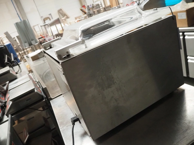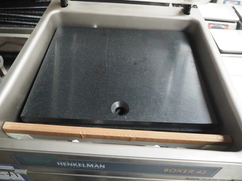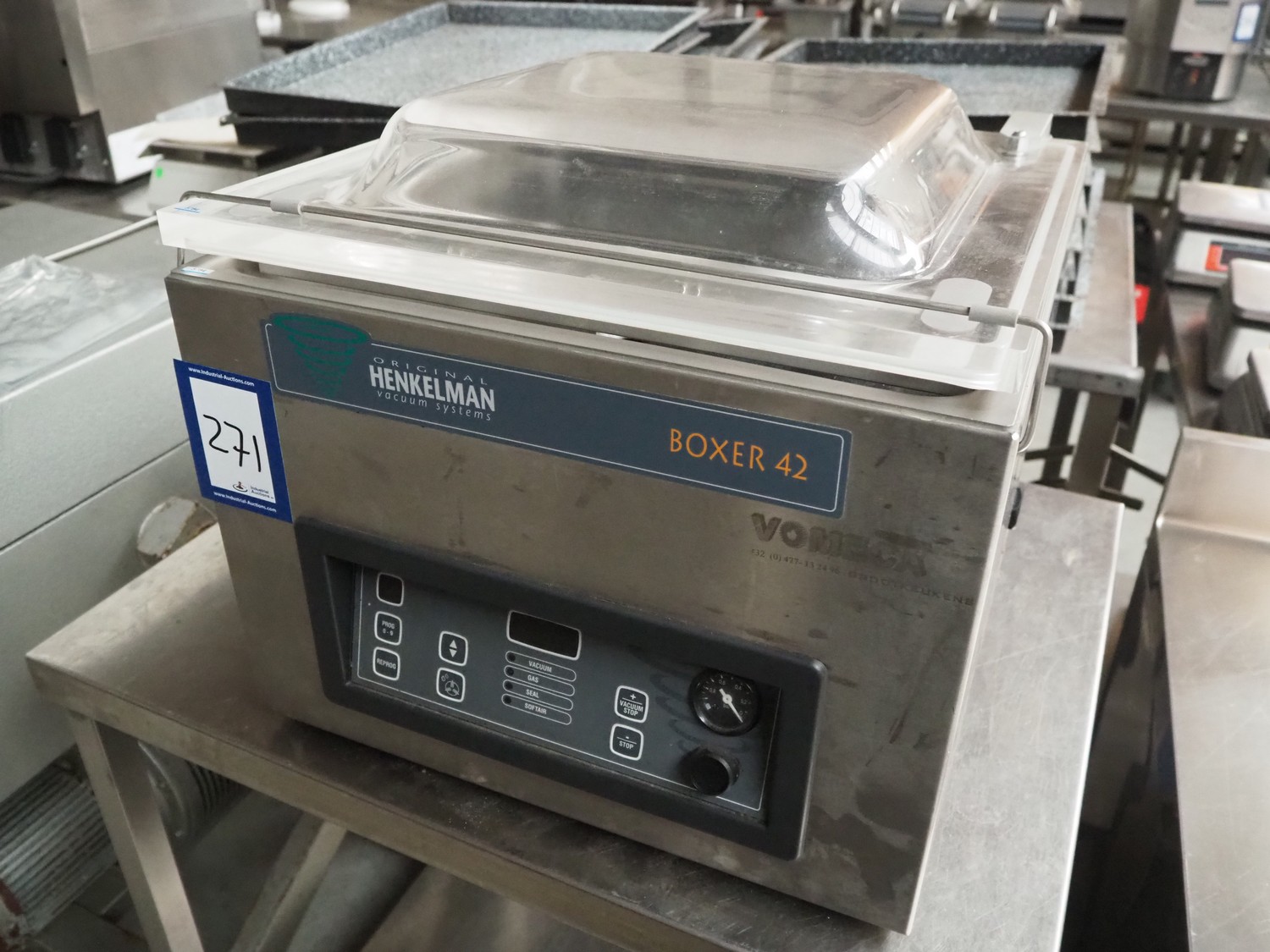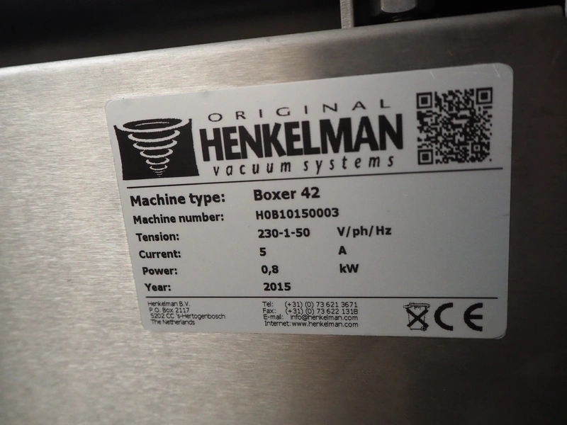 Henkelman vacuum machine, type: Boxer 42, machine number: H0B10150003, year of construction: 2015, 230 V, 1 Ph, 50 Hz, 5 A, 0.8 kW, seal length: 425 mm, dimensions chamber: 420 mm x 370 mm x 70 mm, total dimensions: 520 mm 480 mm x 450 mm.