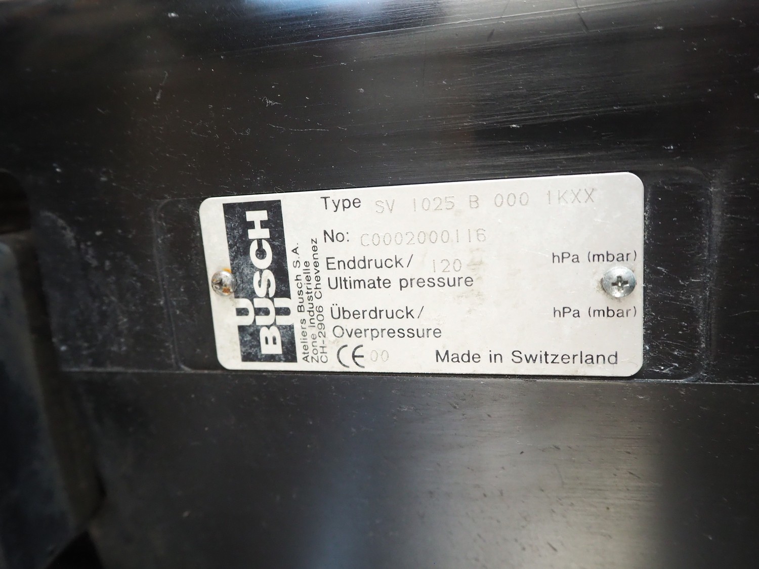 Busch vacuum pump, type: SV 1025 B 000 1 KXX, number: C0002000116, year of construction: 00, capacity: 25 m³ per hour, dimensions: 550 mm x 440 mm x 370 mm.
