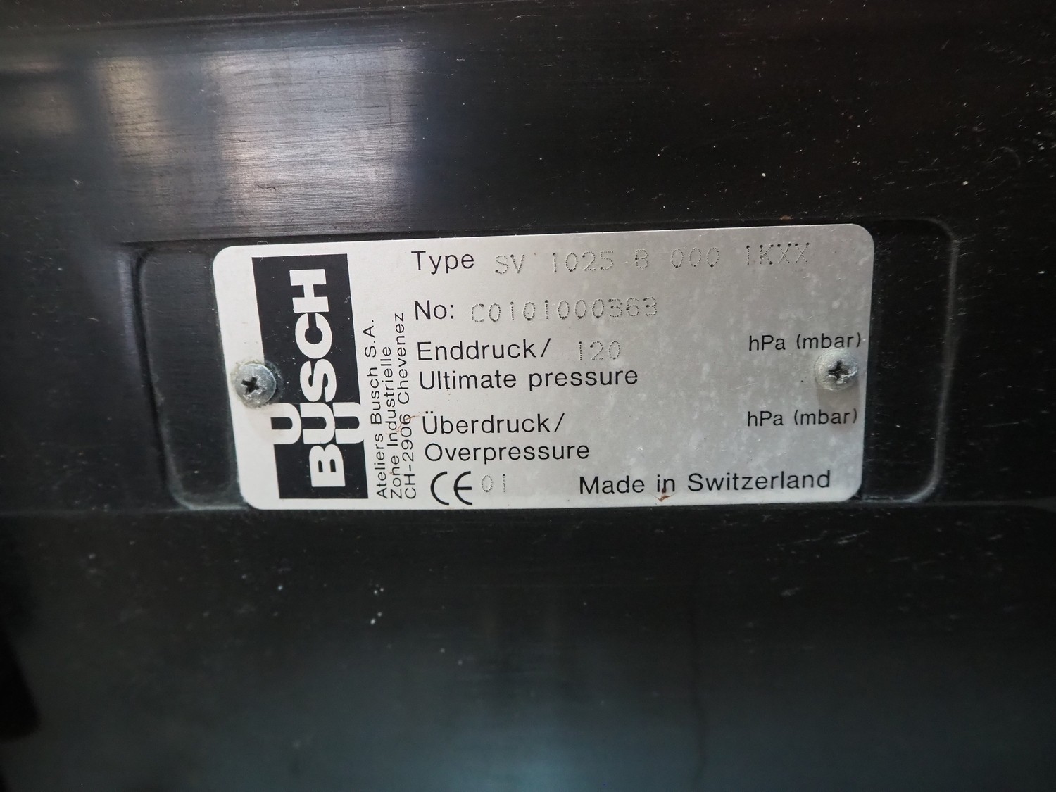 Busch vacuum pump, type: SV 1025 B 000, number: C0101000363, year of construction: 01, capacity: 25 m³ per hour, dimensions: 480 mm x 270 mm x 600 mm.