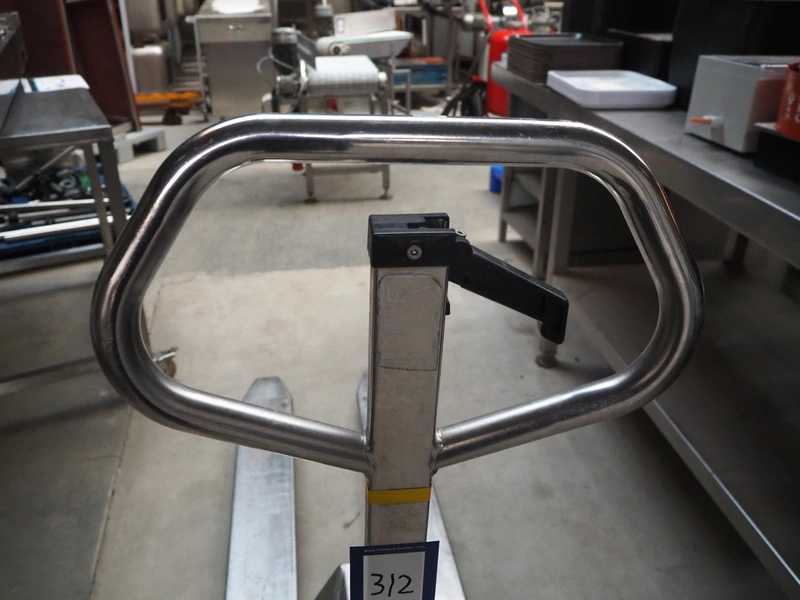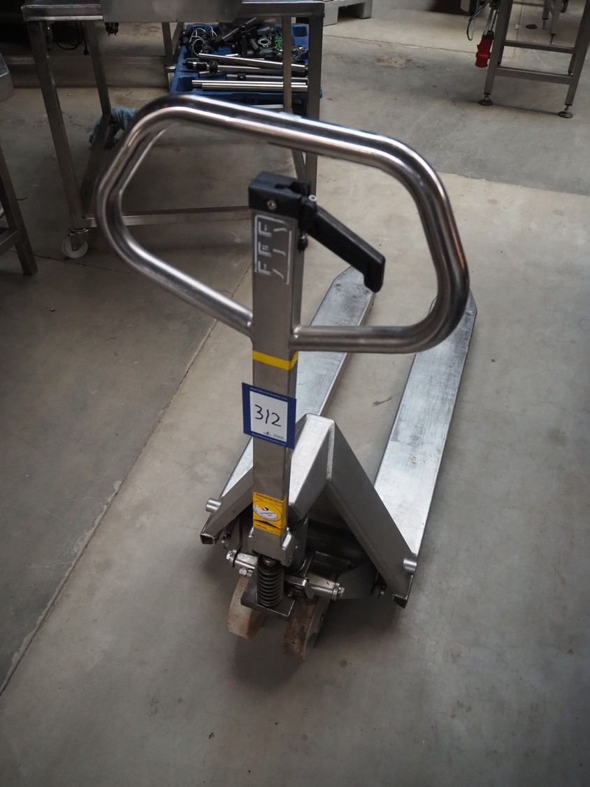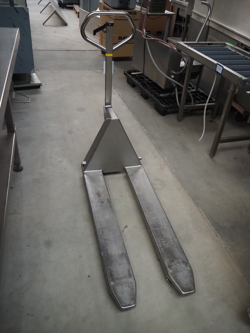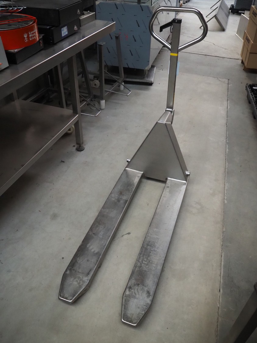 Logitrans s/s pallet lifter, serial number: 083B04064236, year of construction: 2008, capacity: 2000 kg, fork length: 1140 mm, total dimensions: 1600 mm x 520 mm x 1220 mm.