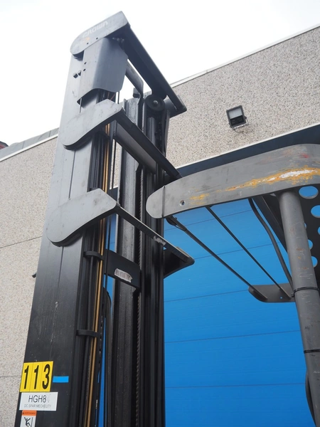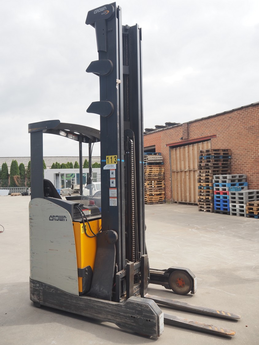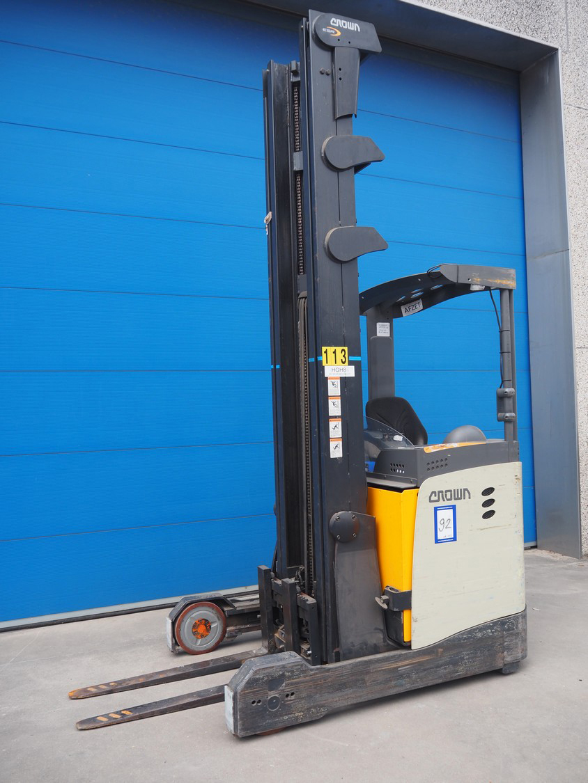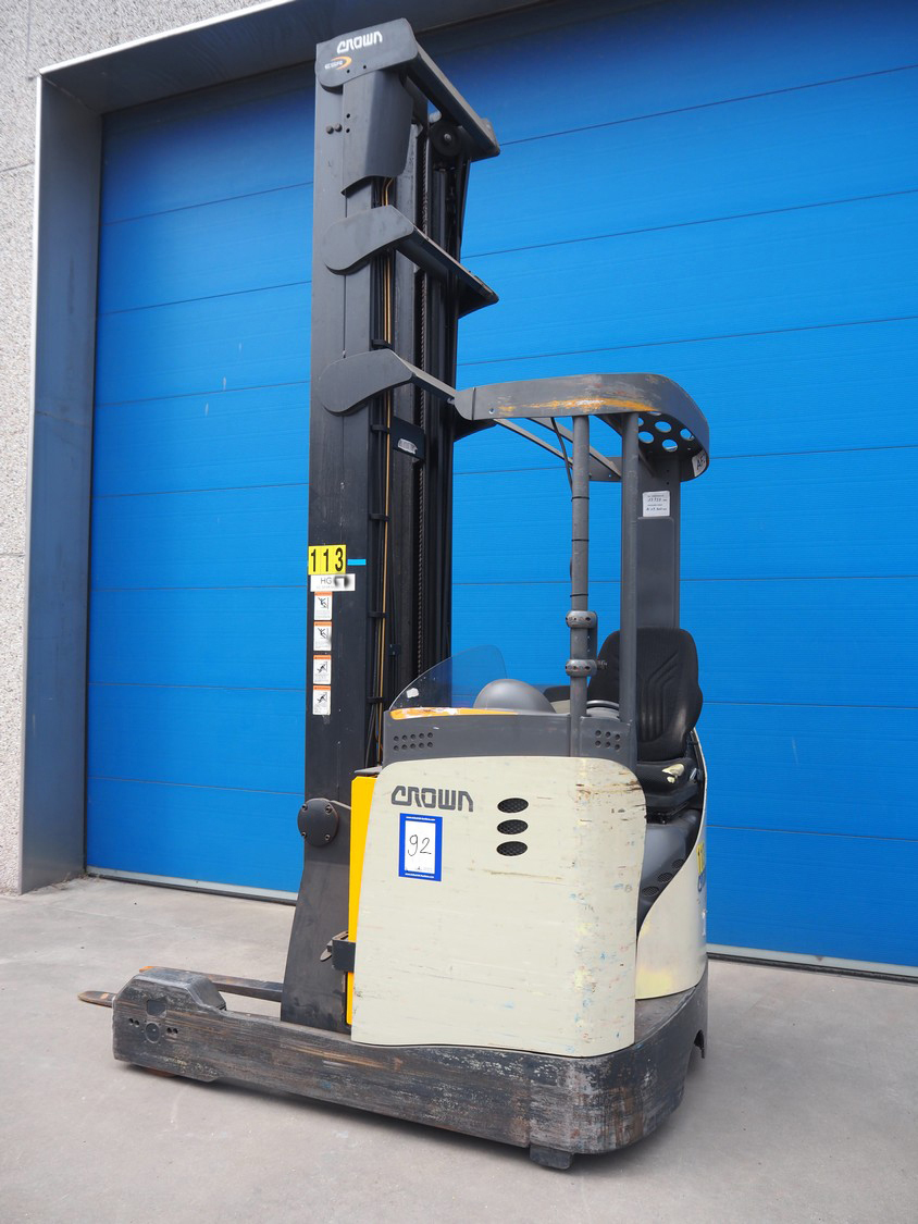 Crown Gabelstapler GmbH & Co. KG reach truck, model number: ESR 5200, serial number: 5A221602, nominal capacity: 1600 kg, retracted mast height: 3690 mm, fork length: 1140 mm, total dimensions: 2600 mm x 1300 mm x 3350 mm. Including Hawker battery charger, 3x400 V, 50 Hz, 10 A.