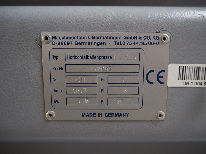 Maschinenfabrik Bermatingen GmbH Co paper press, type: Horizontalballenpresse 60 SLD, serial number: 117883, year of construction: 2014, 400 V, 3 Ph, 50 Hz, 16 A, 7.5 kW, dimensions: 4650 mm x 1950 mm x 2580 mm. Including trolley, trolley dimensions: 1300 mm x 880 mm x 1040 mm.