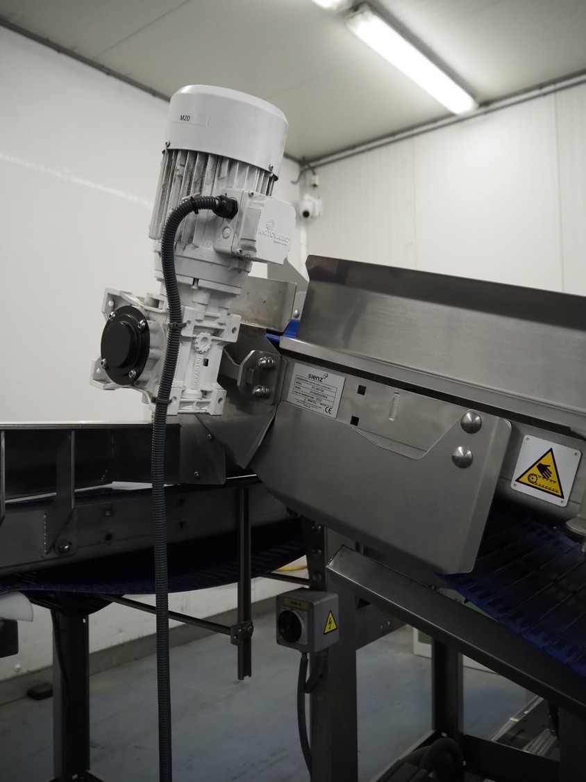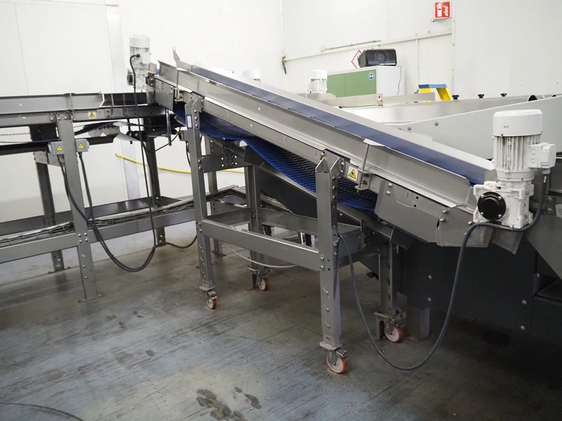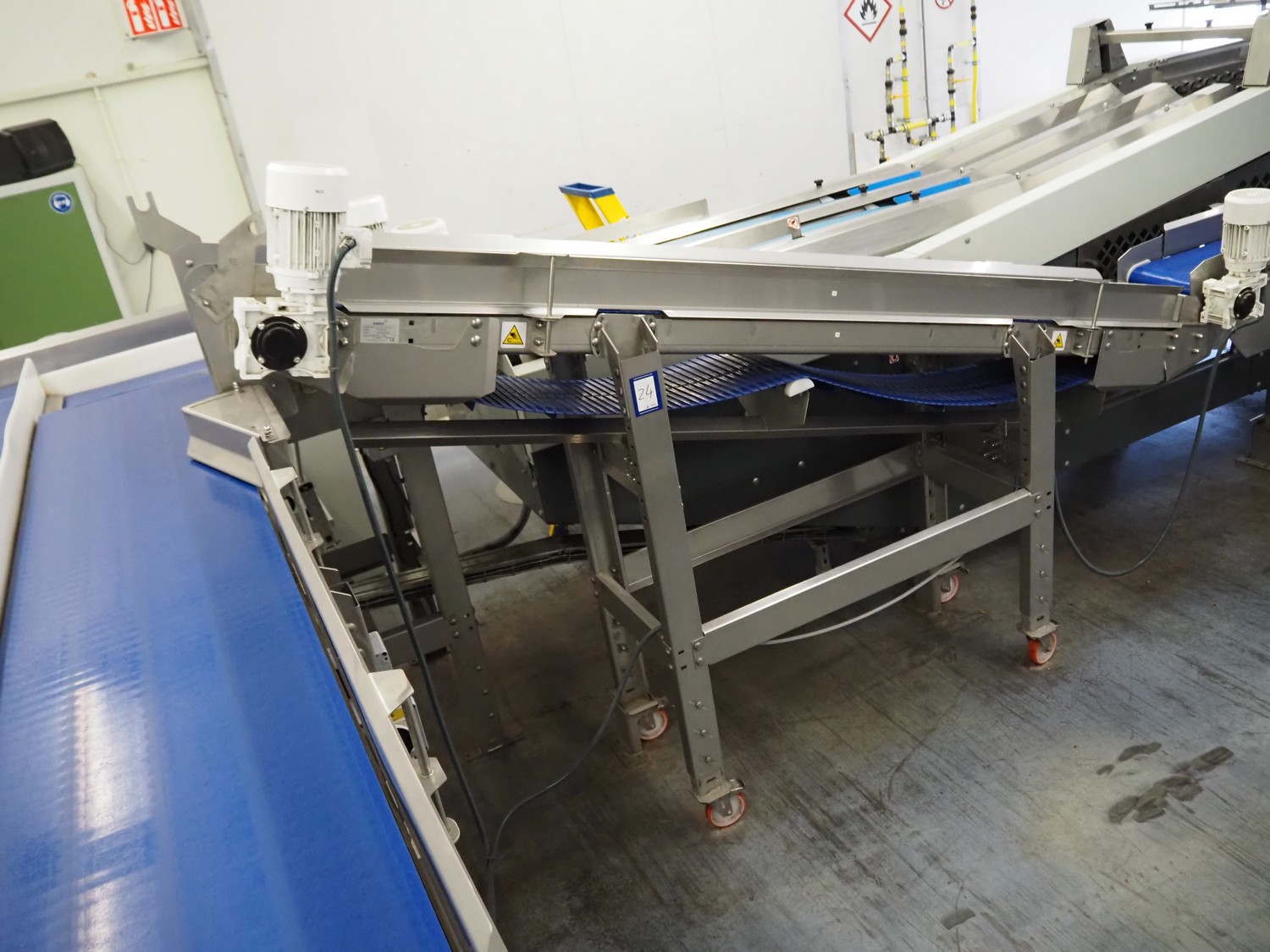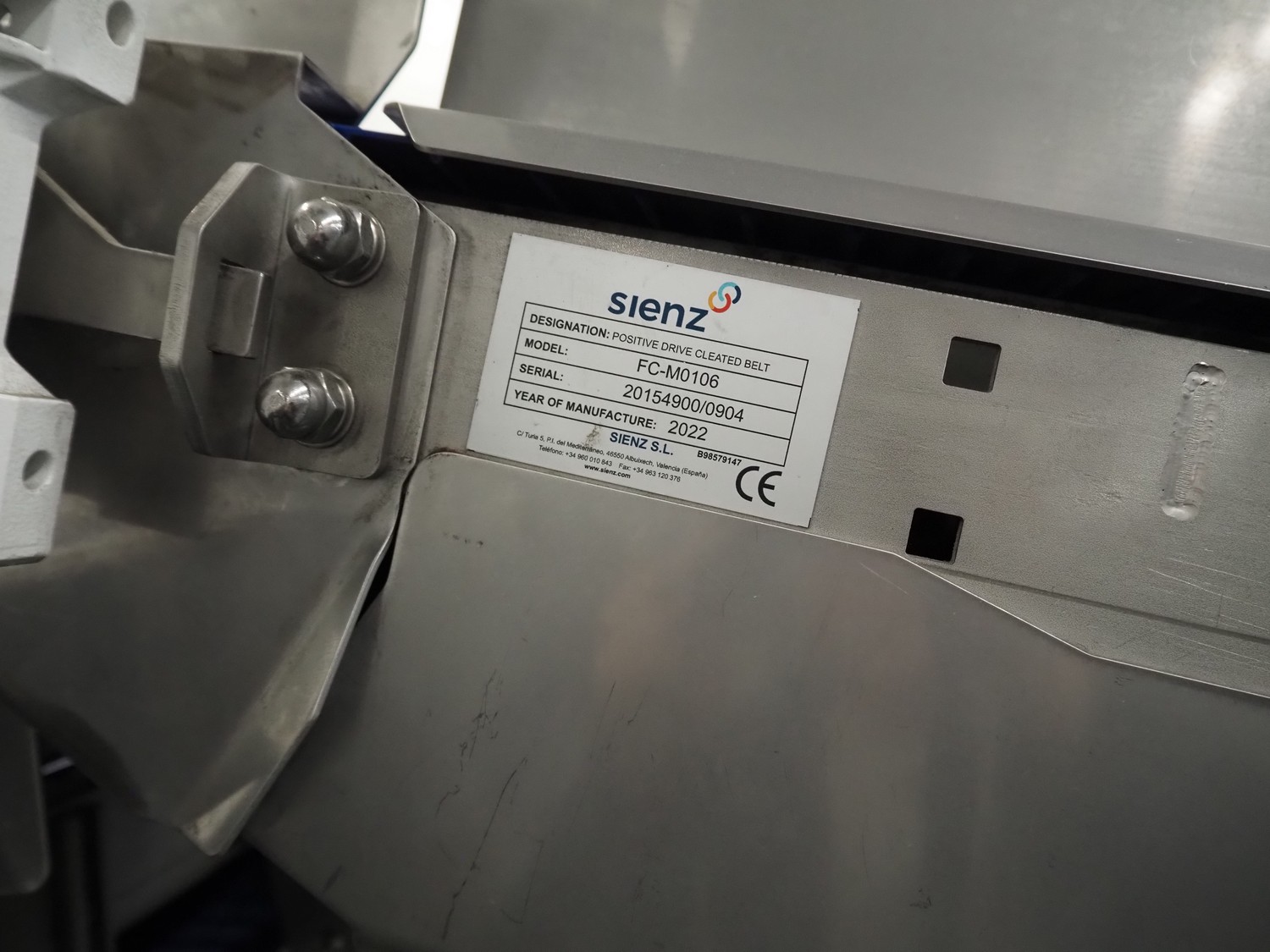 Sienz S.L. mobile elevating belt, model: FC-M0106, serial number: 20154900/0904, year of construction: 2022, plastic belt with dividers, belt width: 300 mm, divider height: 30 mm, distance between dividers: 220 mm, elevating height: 1850 mm, total dimensions: 3100 mm x 600 mm x 2100 mm.