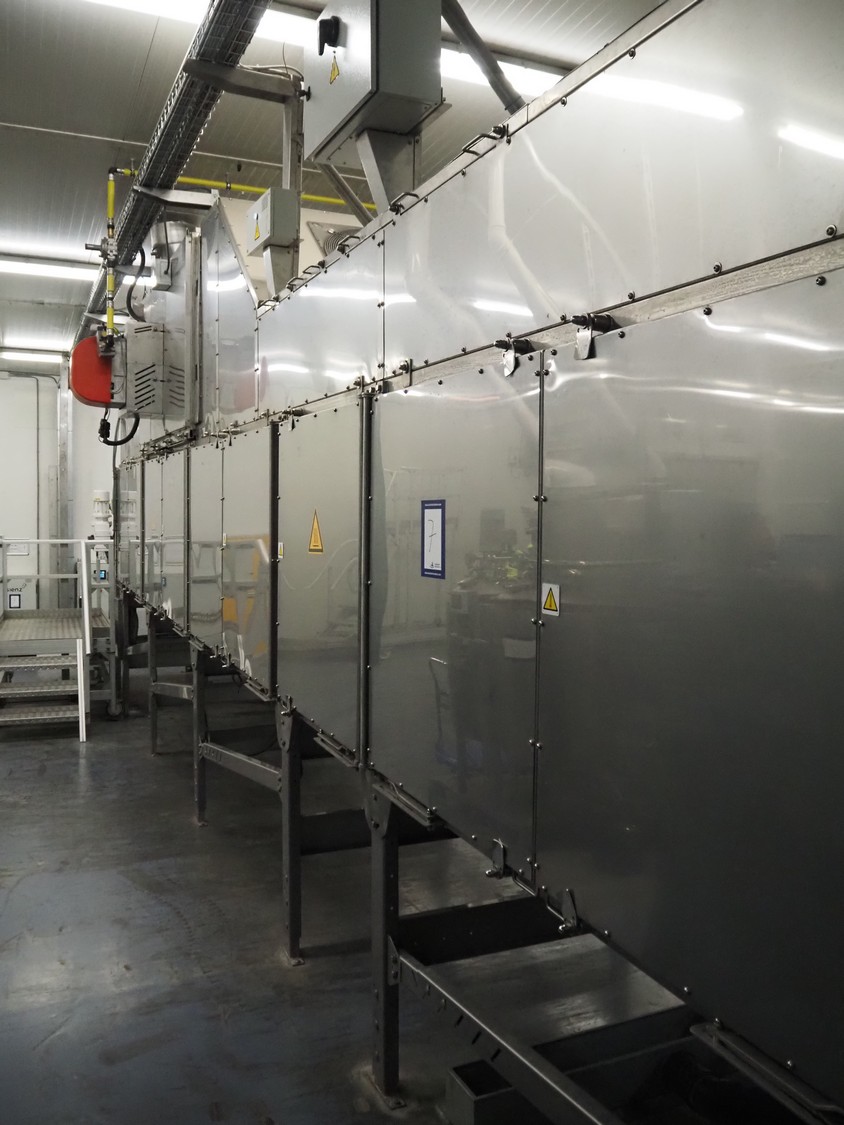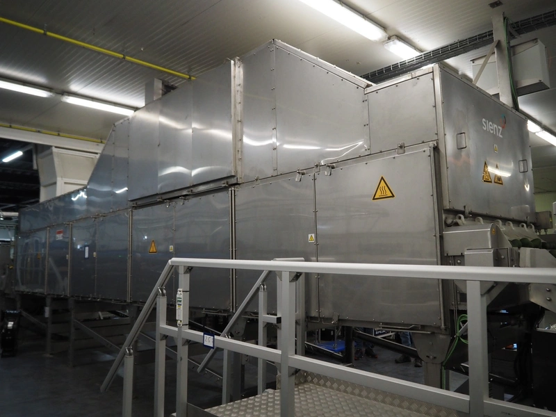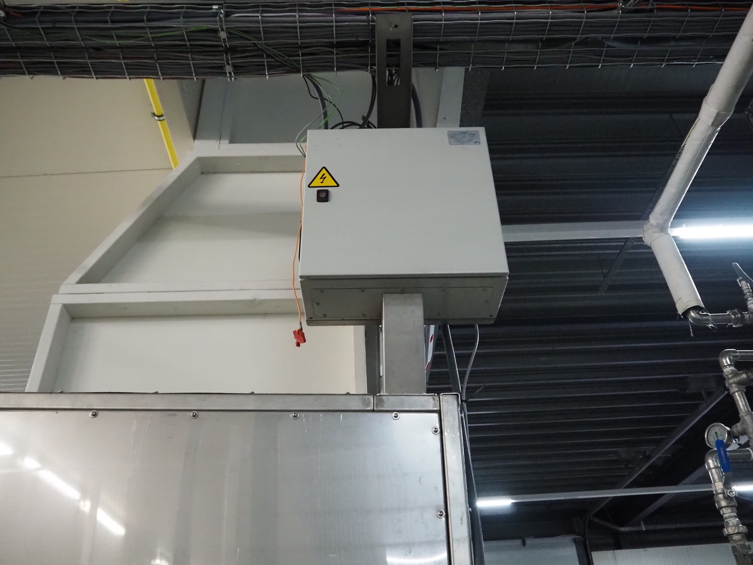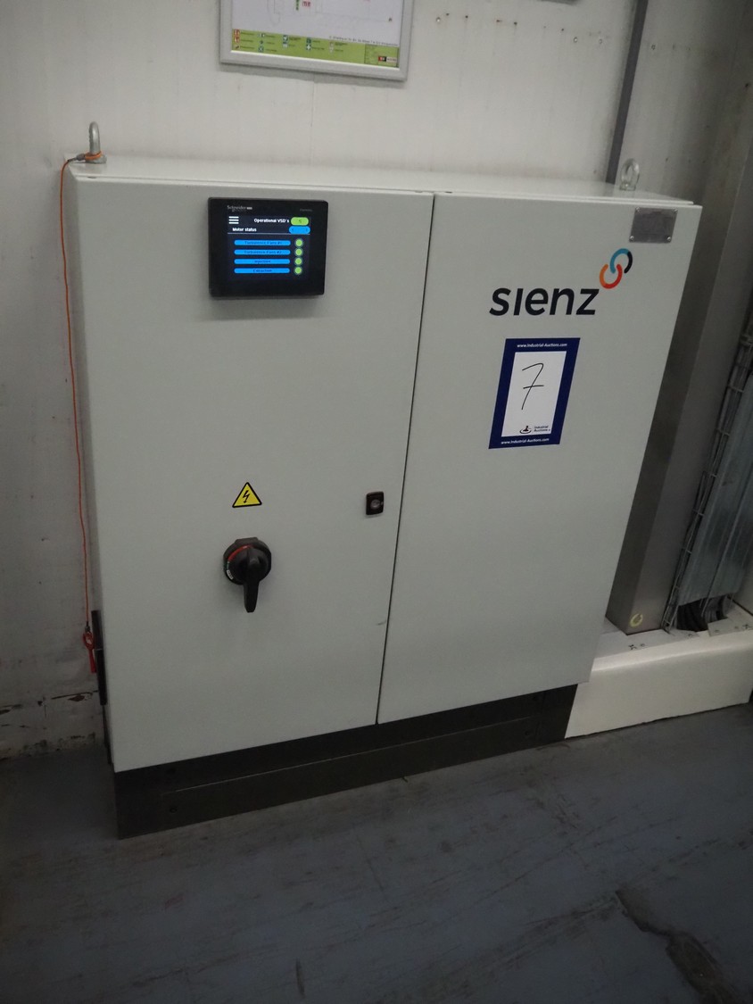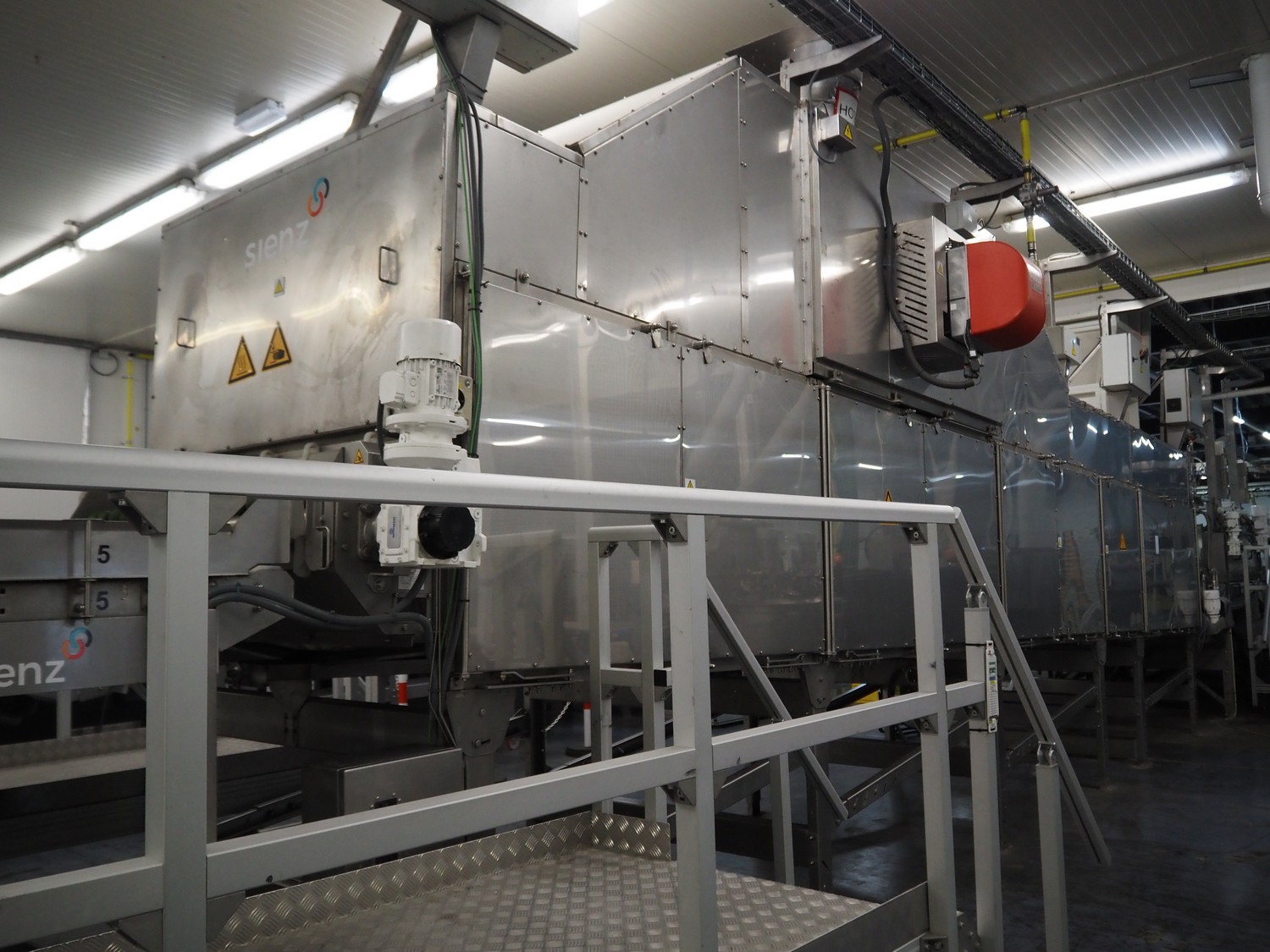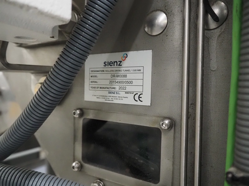 Sienz S.L. drying tunnel, model: SMCC1.1, serial number: 20154900/500, 400 V, 3 Ph, 50 Hz, 14 A, s/s rollers, roller width: 1500 mm, total dimensions: 10000 mm x 2300 mm x 3550 mm. Including switch cabinet, dimensions: 1000 mm x 300 mm x 1200 mm.
