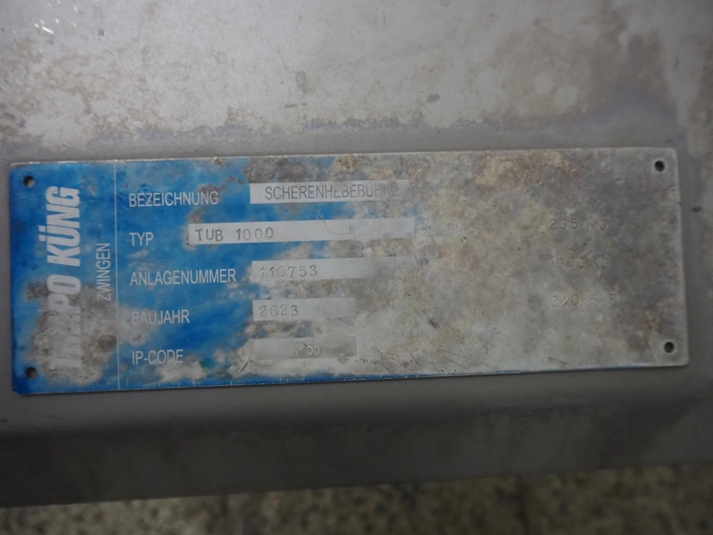 Trapo Küng lifting platform, type: TUB 1000, number: 116753, year of construction: 2023, maximum weight: 1000 kg, platform dimensions: 1430 mm x 1070 mm, unit: 500 mm x 320 mm x 620 mm.