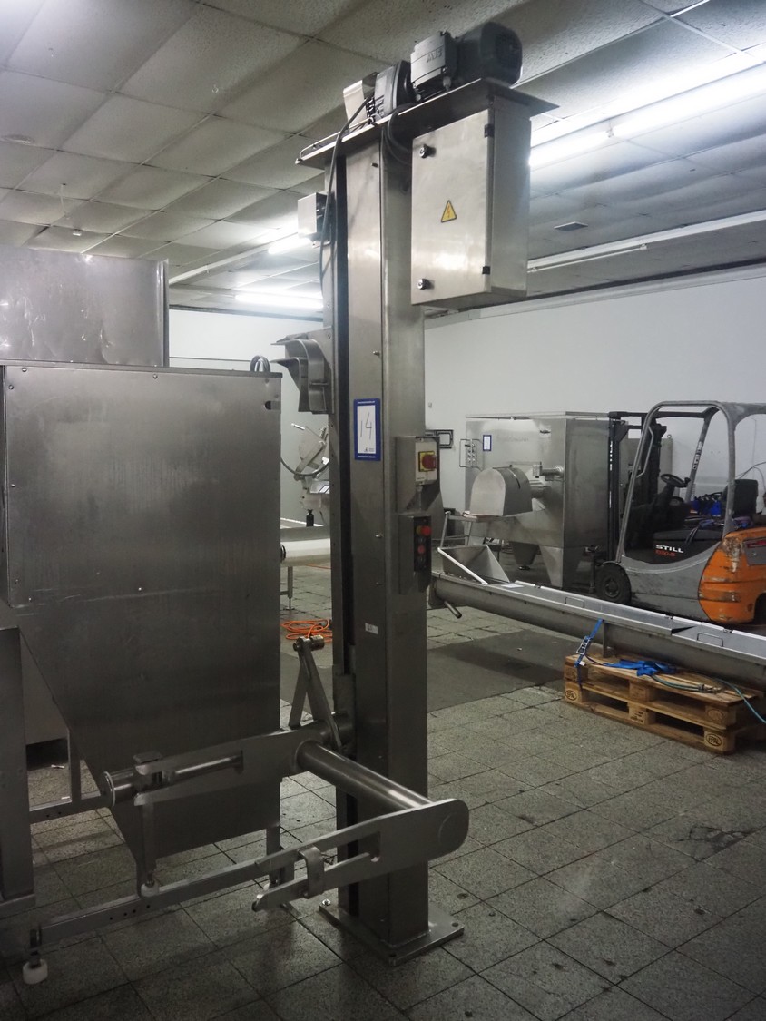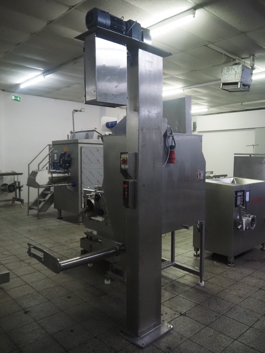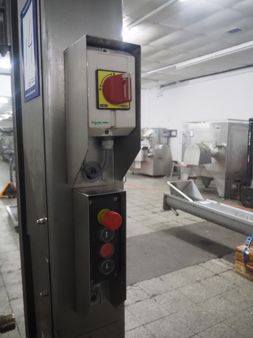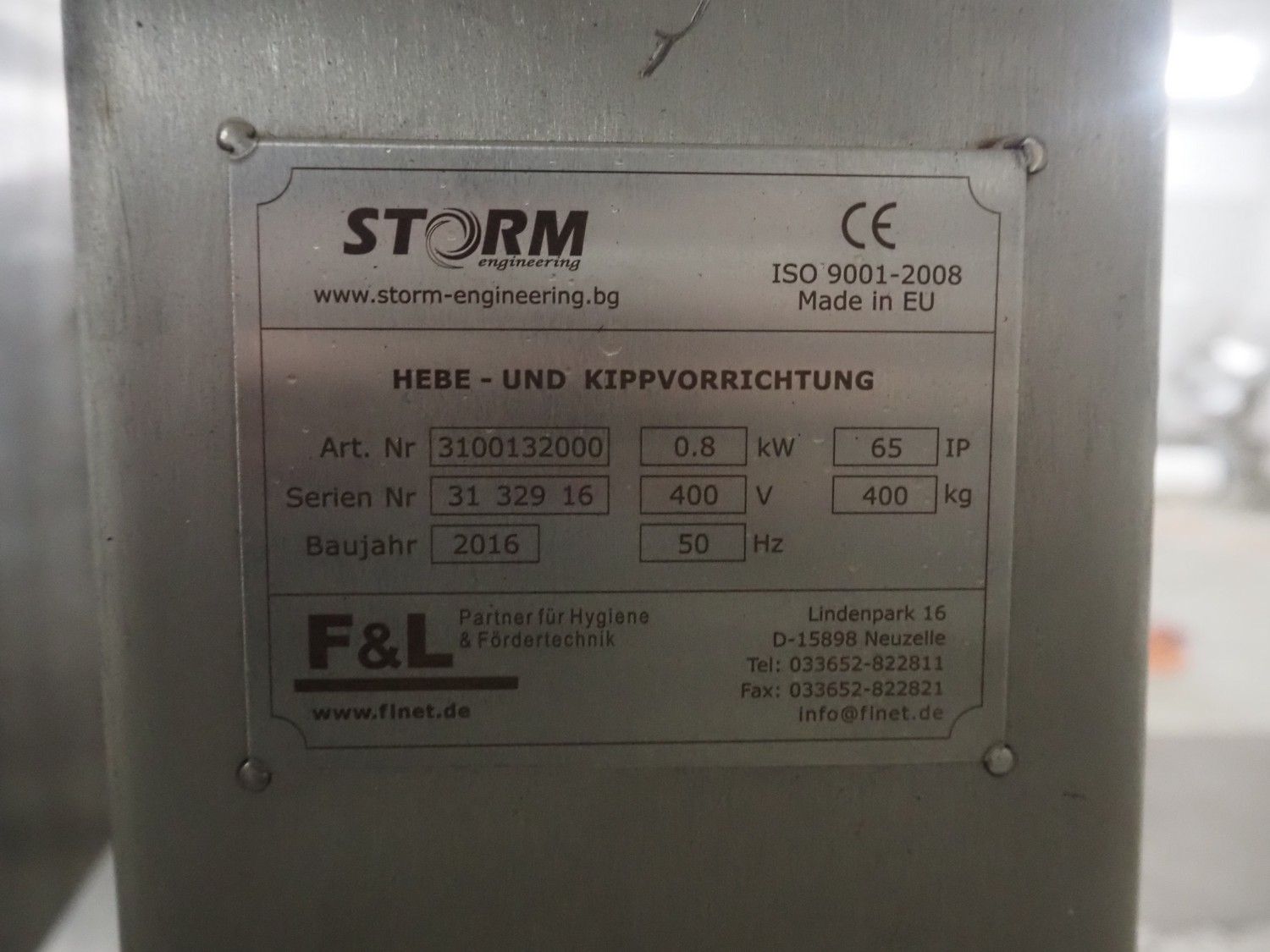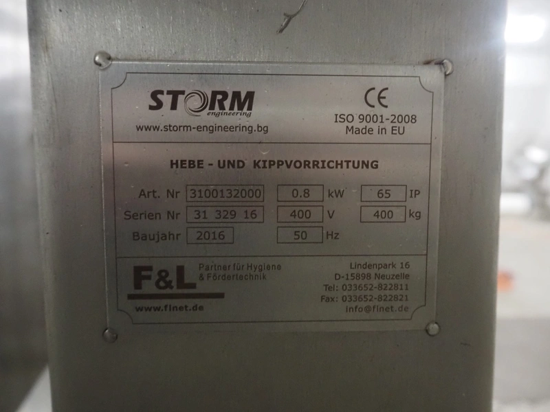 - Storm lifter for meat bins, serial number: 31 329 16, year of construction: 2016, 400 V, 50 Hz, 65 Ip, 0.8 kW, machine weight: 400 kg, lifting height: 1980 mm, total dimensions lifter: 1250 mm x 1200 mm x 2800 mm.