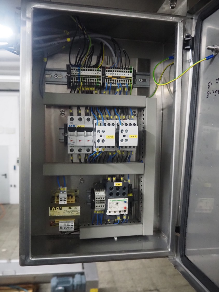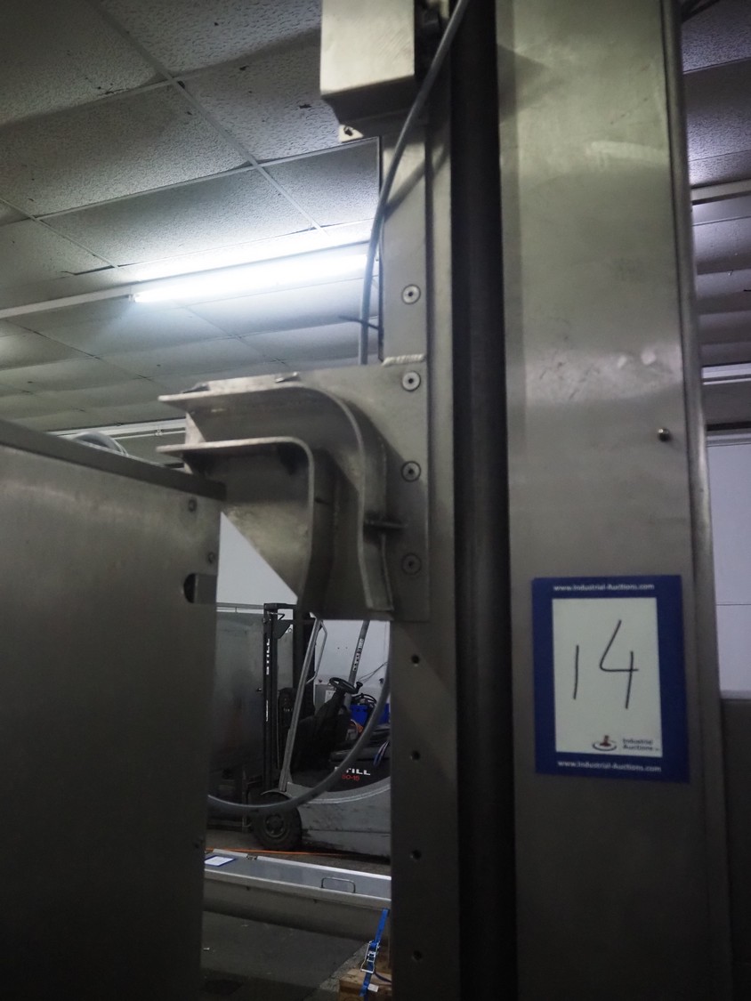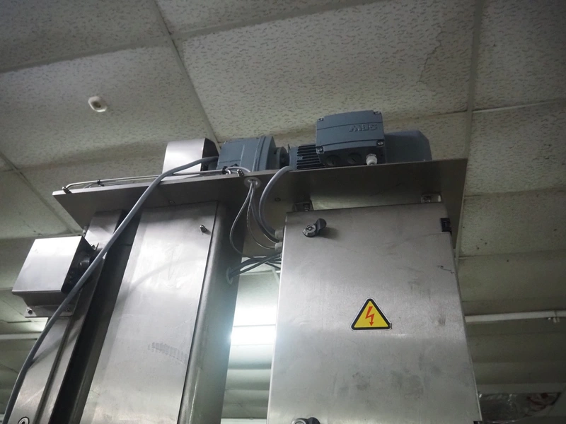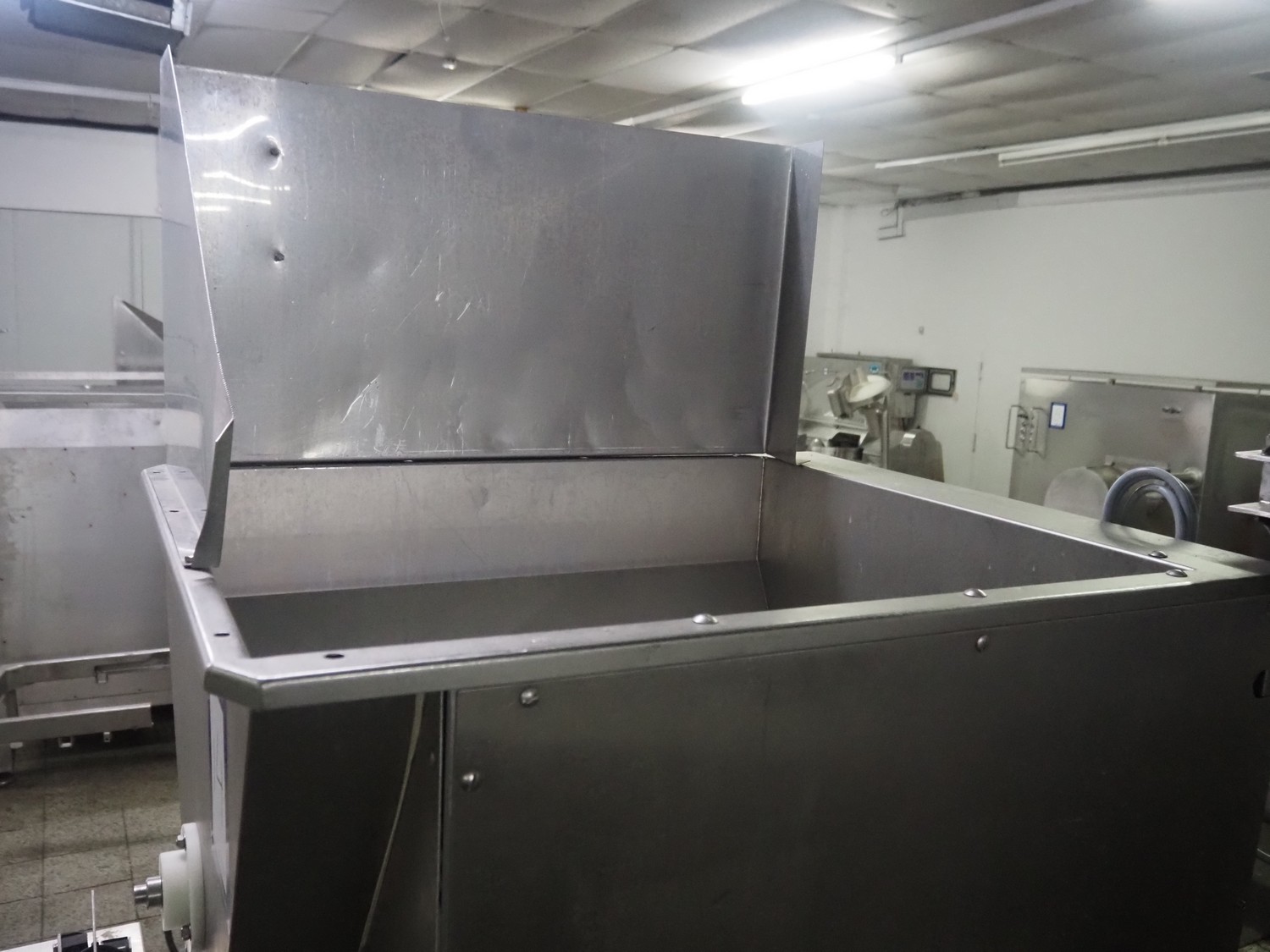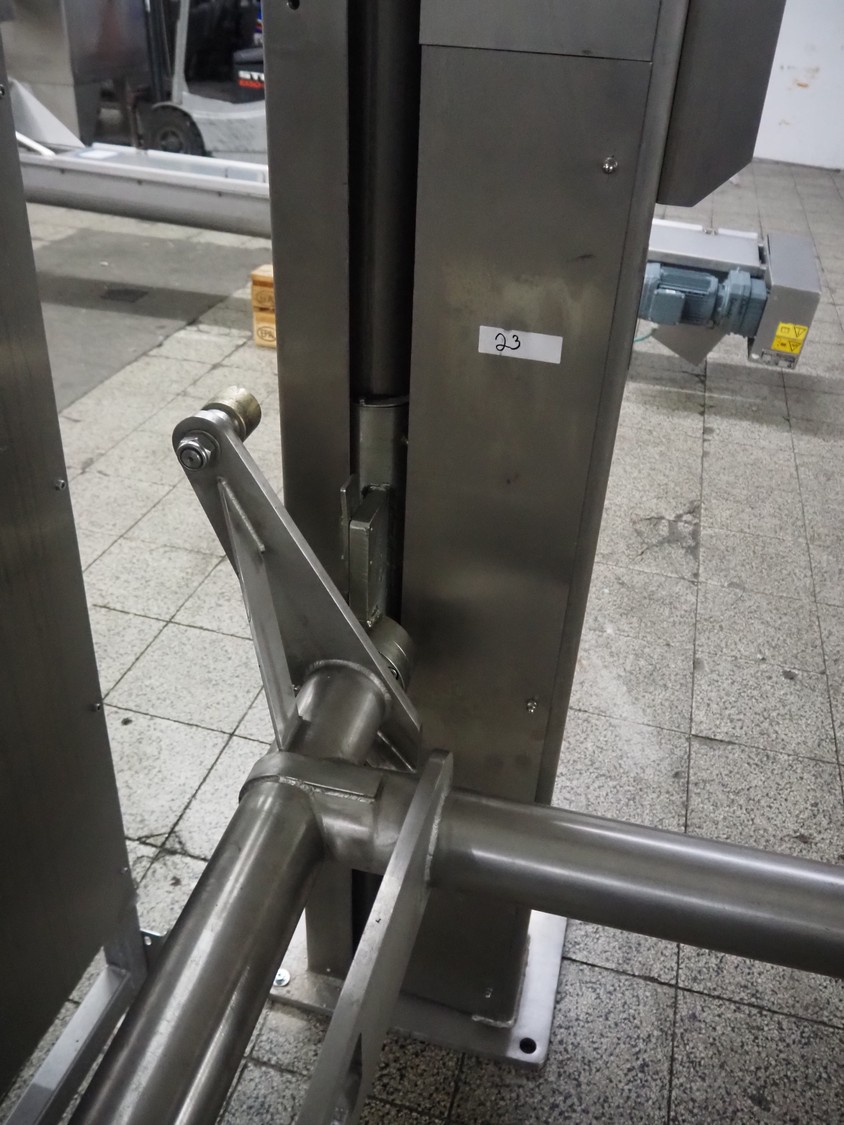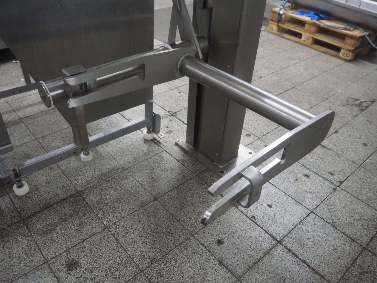 - Storm lifter for meat bins, serial number: 31 329 16, year of construction: 2016, 400 V, 50 Hz, 65 Ip, 0.8 kW, machine weight: 400 kg, lifting height: 1980 mm, total dimensions lifter: 1250 mm x 1200 mm x 2800 mm.