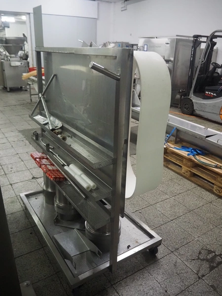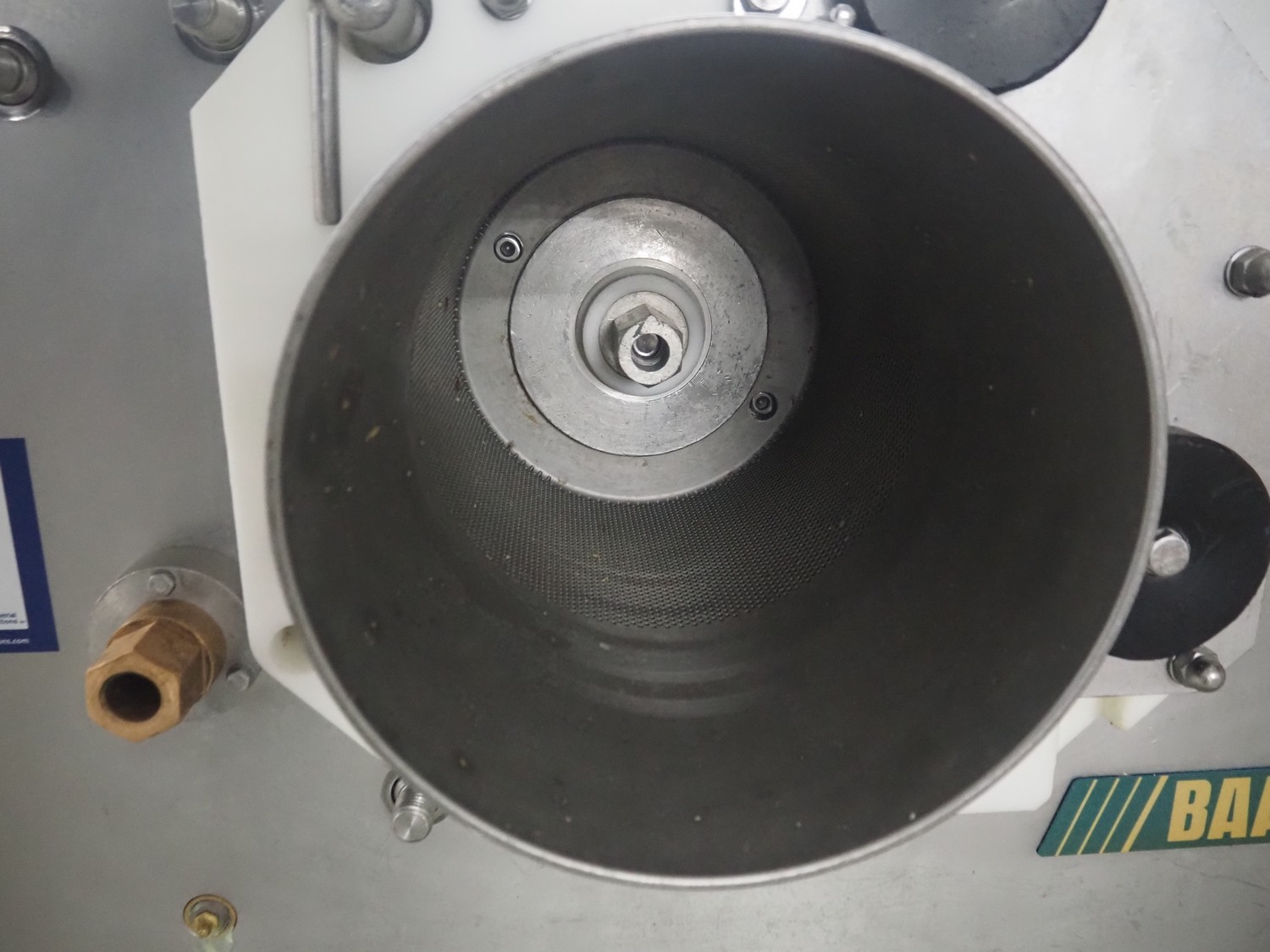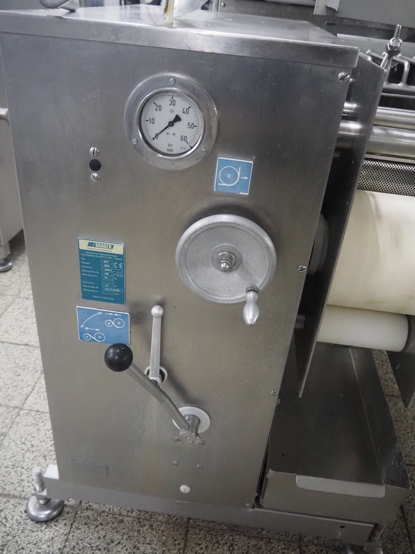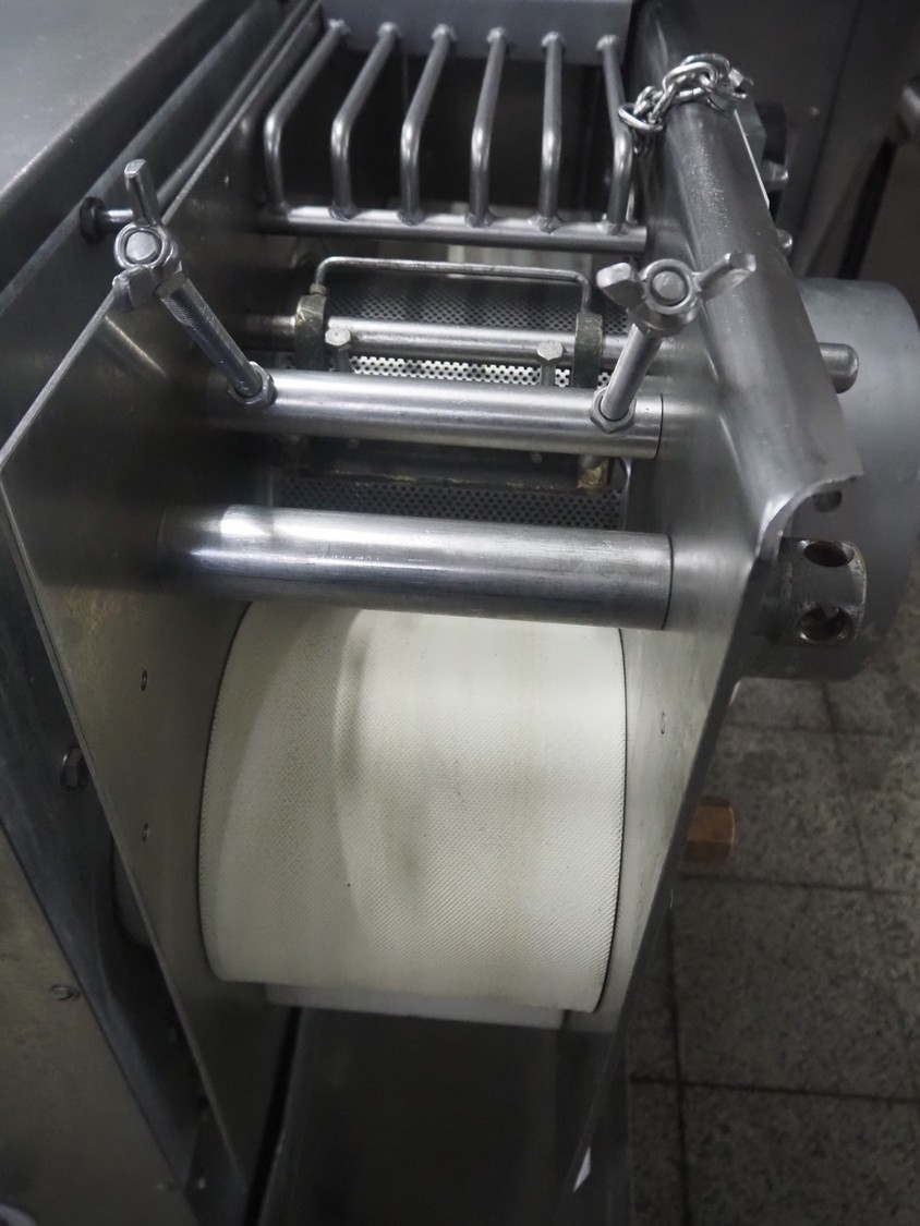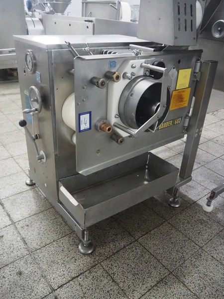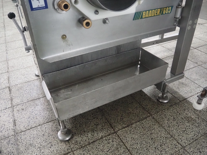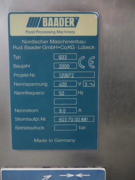 - Baader separator type: 603, number: 120672, year of construction: 2000, 400 V, 3 Ph, 50 Hz, 9.0 A, diameter drum: 260 mm, diameter perforations: 3 mm, plastic belt, belt width: 200 mm, total dimensions separator: 1050 mm x 1200 mm x 1180 mm.