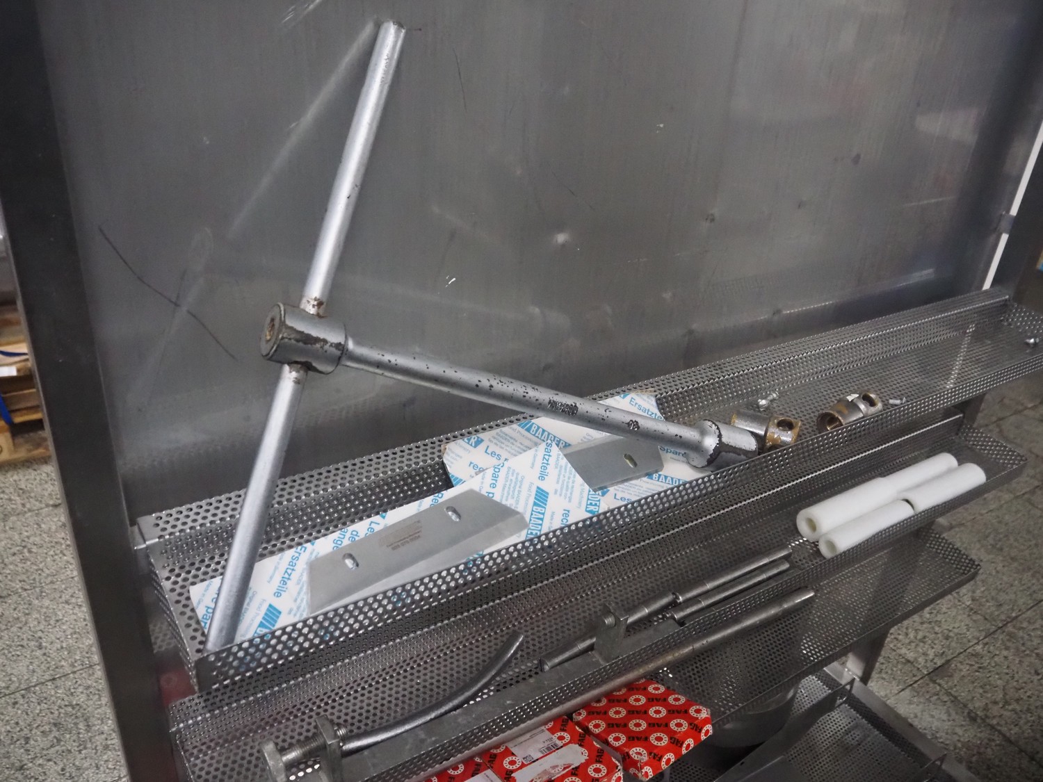 - Tool trolley with extra parts, extra drums, diameter drum: 260 mm, perforations: (2x) 2 mm, (1x) 1 mm, (1x) 3 mm, (1x) 4 mm, dimensions tool trolley: 1350 mm x 800 mm x 1900 mm.