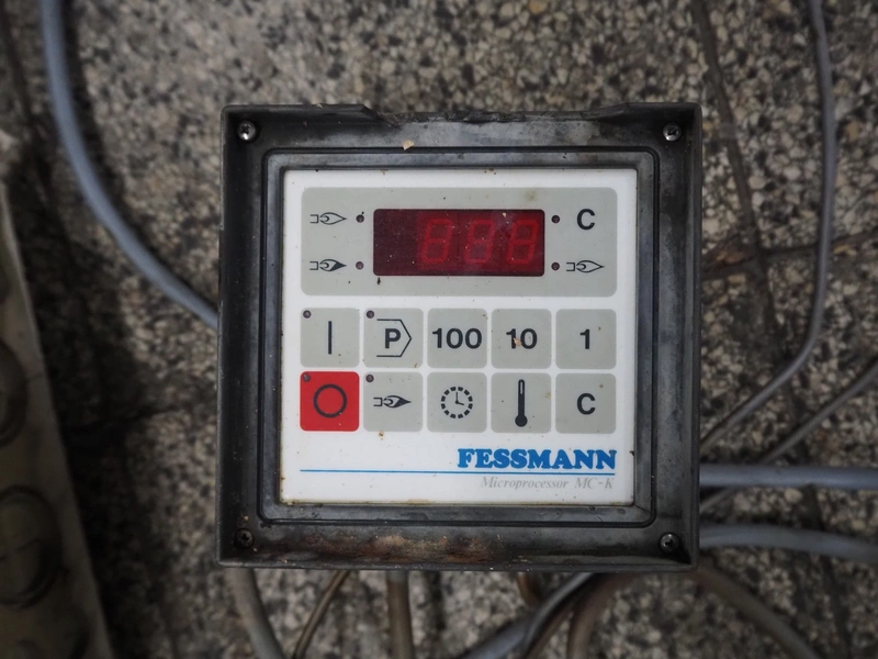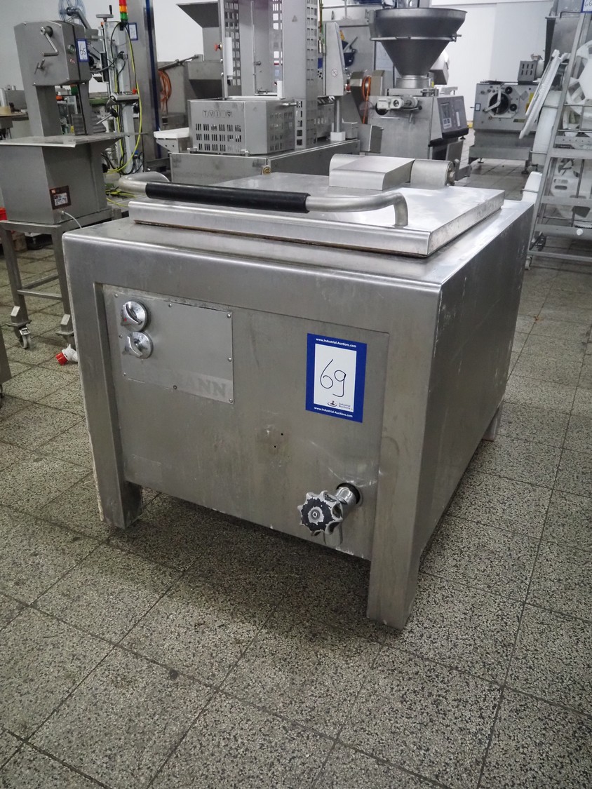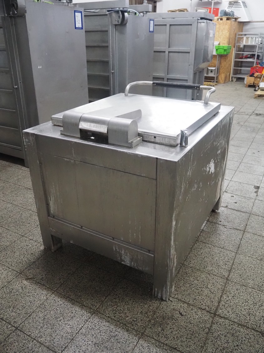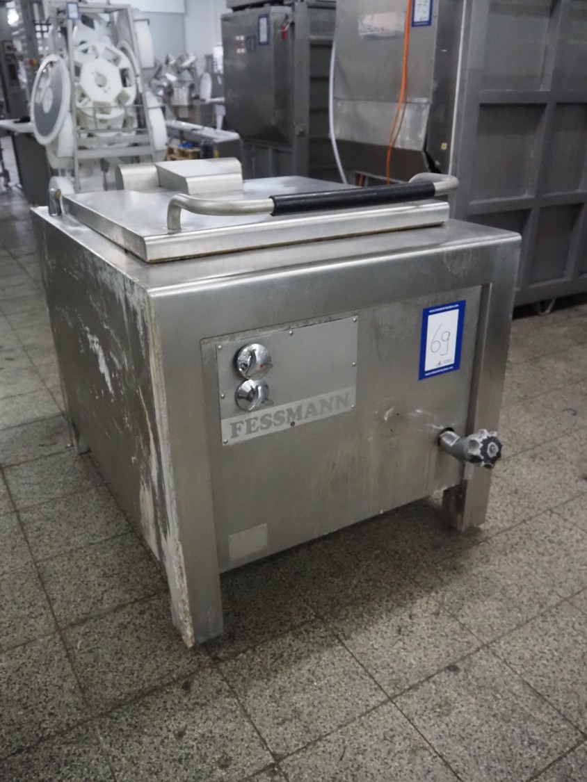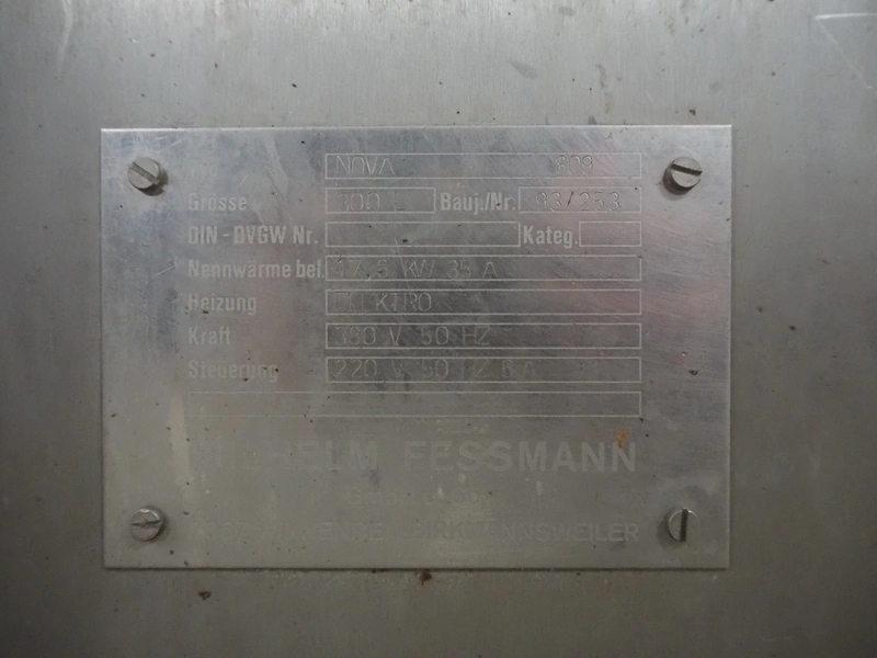 Fessmann cooking vessel, type: NOVA 809, number: 253, year of construction: 93, 220 / 380 V, 50 Hz, 6 / 35 A, 17.5 kW, electric heated, volume: 300 liter, total dimensions: 1400 mm x 1000 mm x 1080 mm.