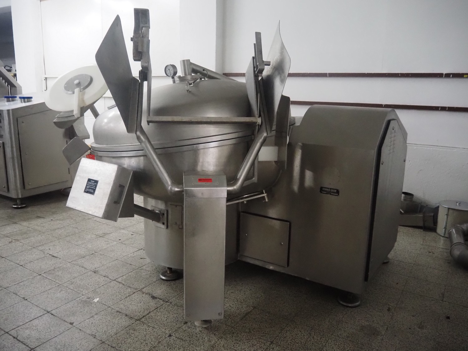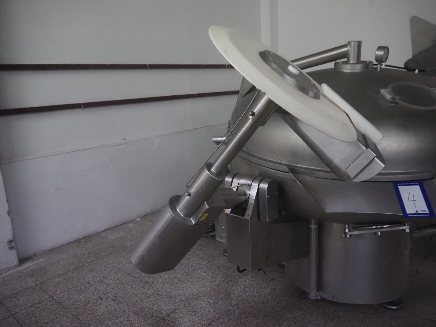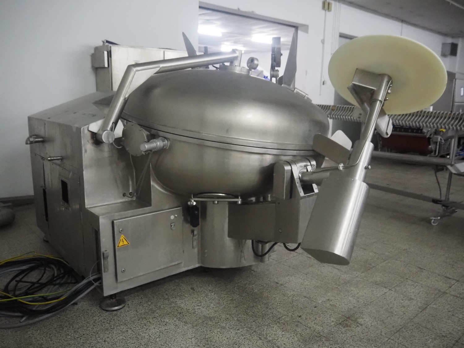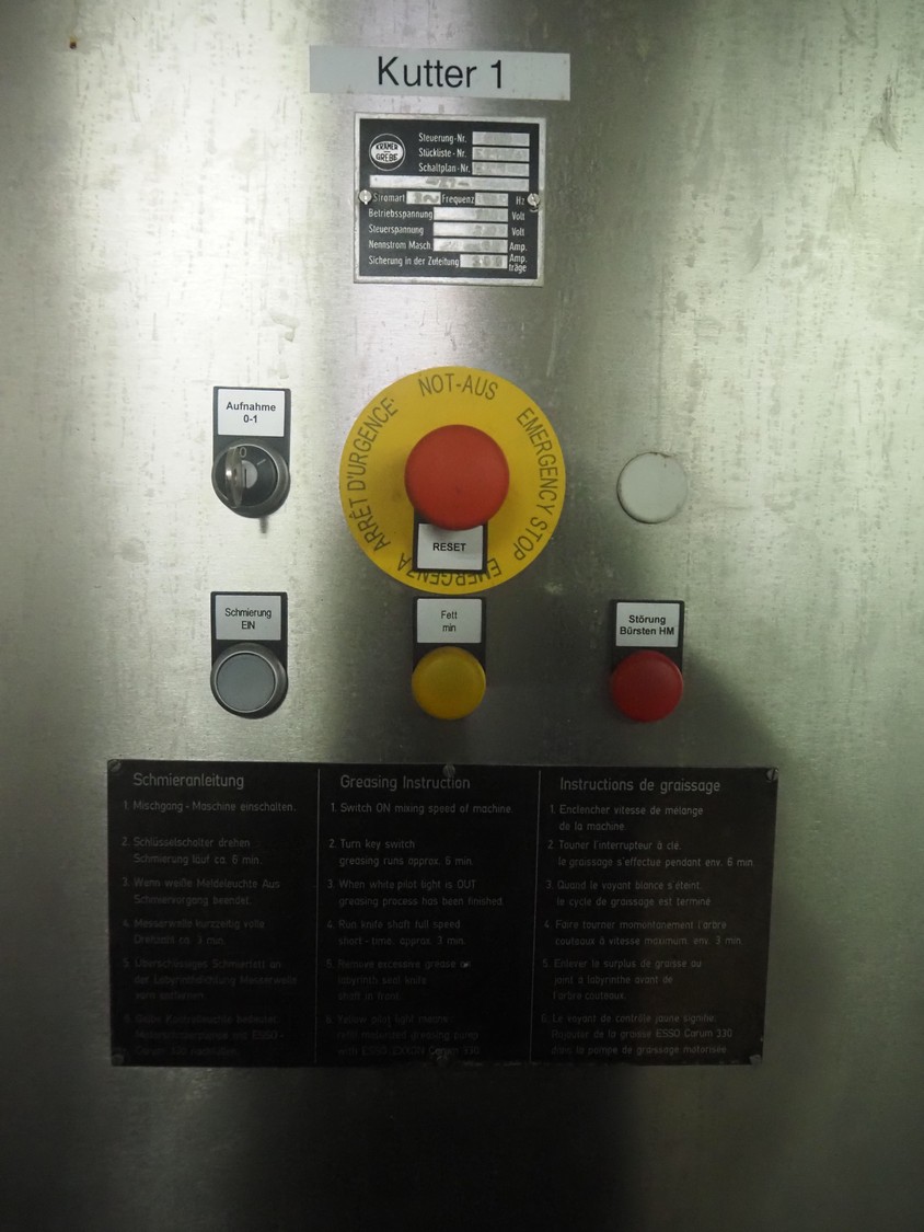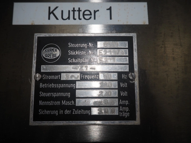 Kramer+Grebe bowl cutter with lifter for meat bins and ejector, type: VSM 325, machine number: 212/215/1, year of construction: 86, 220/380 V, 3 Ph, 50 Hz, 260/300 A, diameter s/s bowl: 1500 mm, total dimensions: 3200 mm x 3150 mm x 1860 mm. Including switch cabinet, dimensions: 1620 mm x 550 mm x 2120 mm.