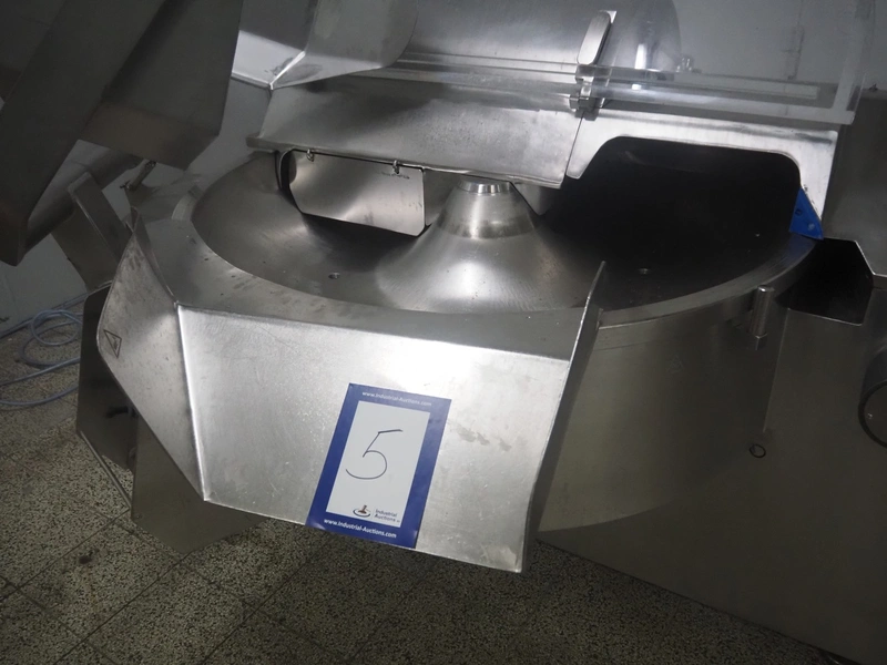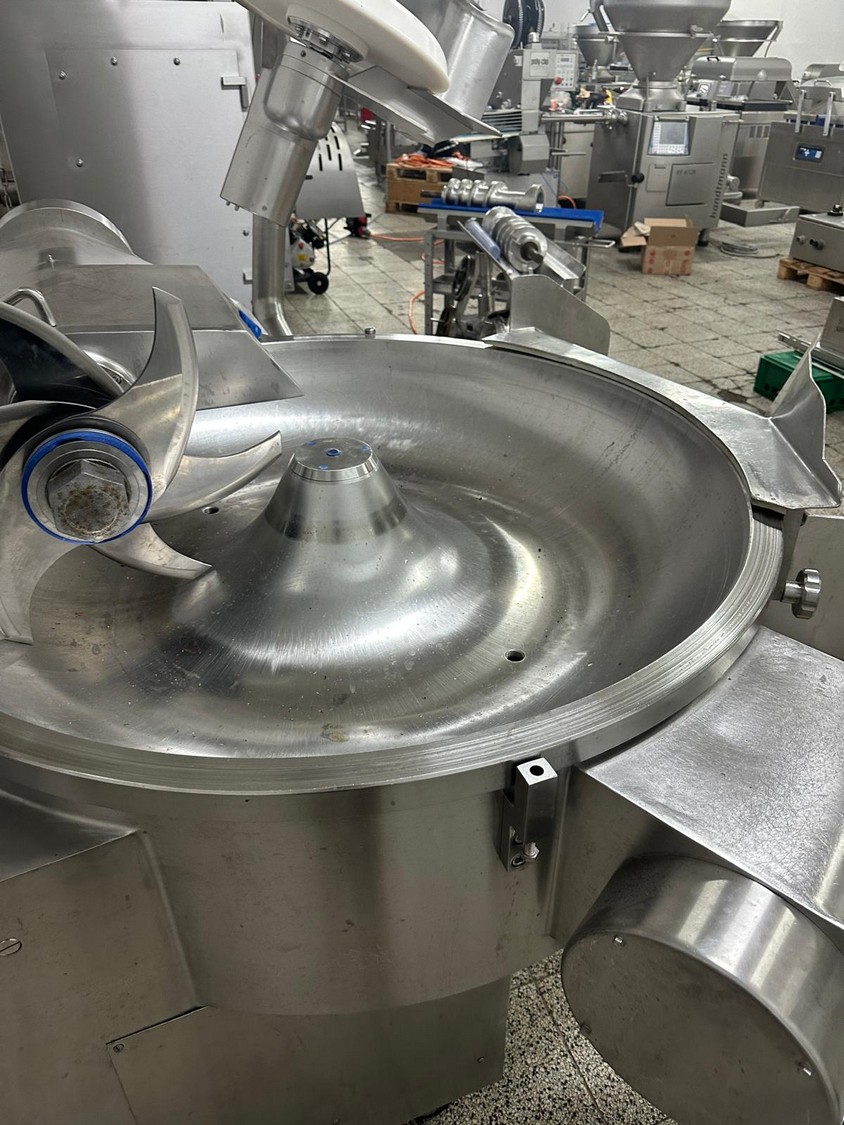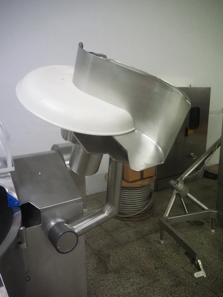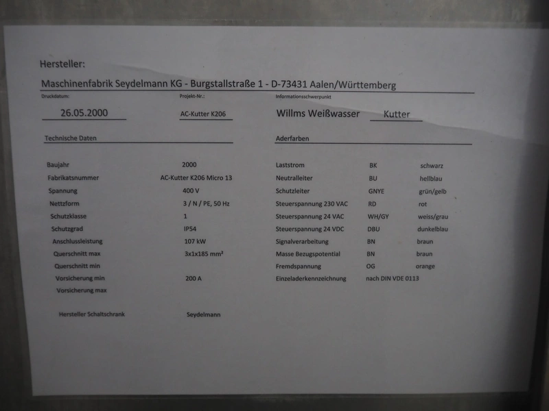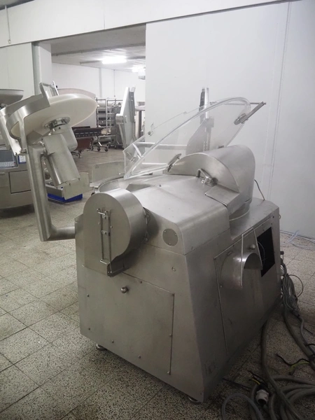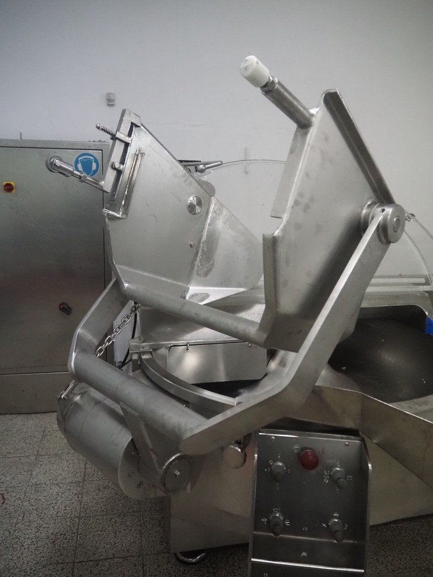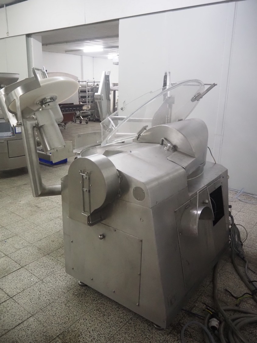 Seydelmann bowl cutter with lifter for meat bins and ejector, type: K206AC8, machine number: 00104-1, year of construction: 2000, 400 V, 50 Hz, 212 A, 107 kW, diameter s/s bowl: 1250 mm, total dimensions: 2100 mm x 2300 mm x 1930 mm. Including switch cabinet, dimensions: 1500 mm x 500 mm x 1970 mm.