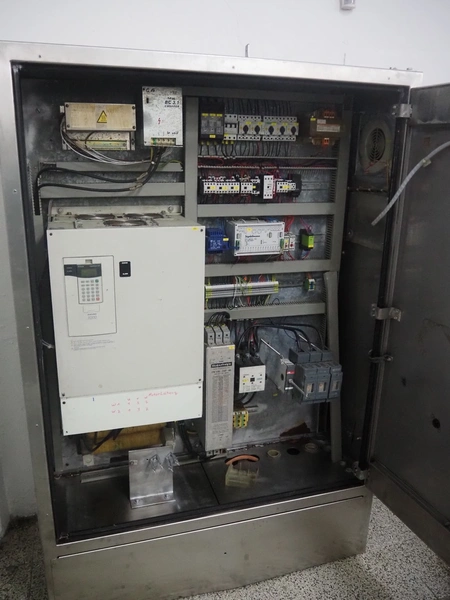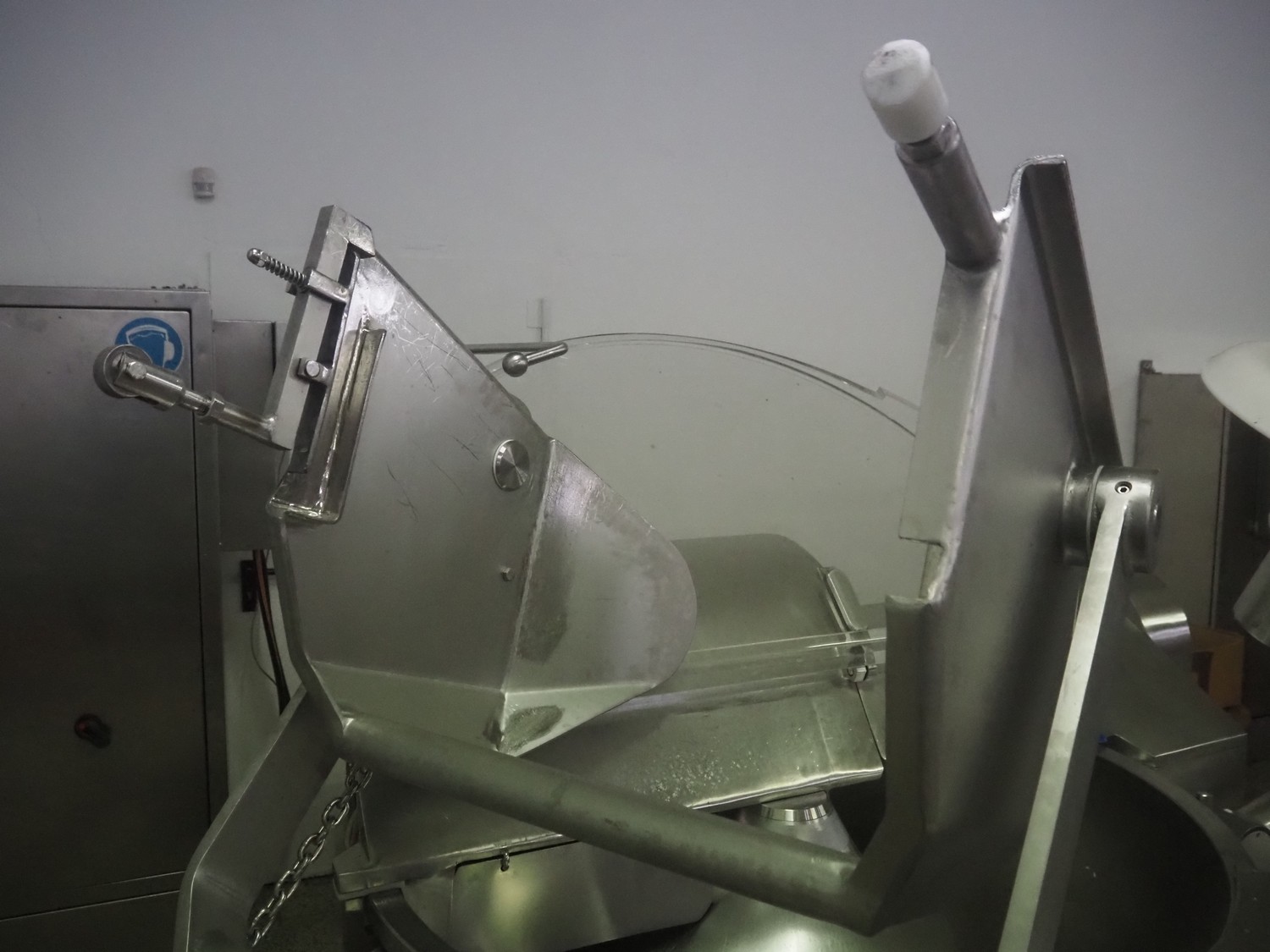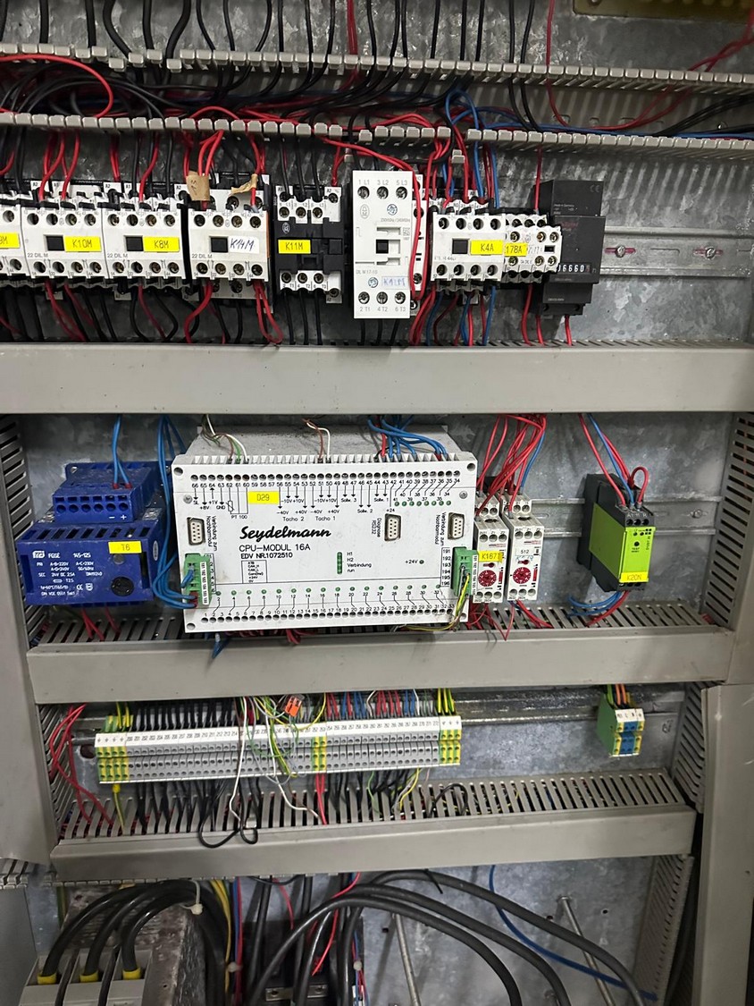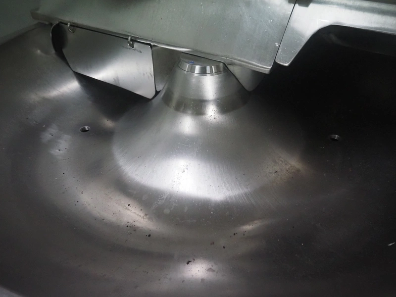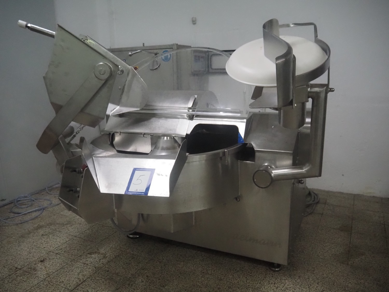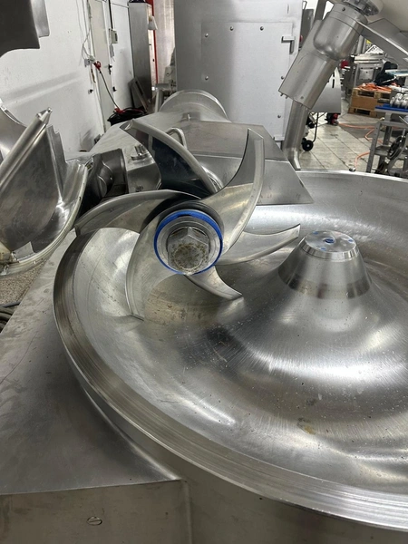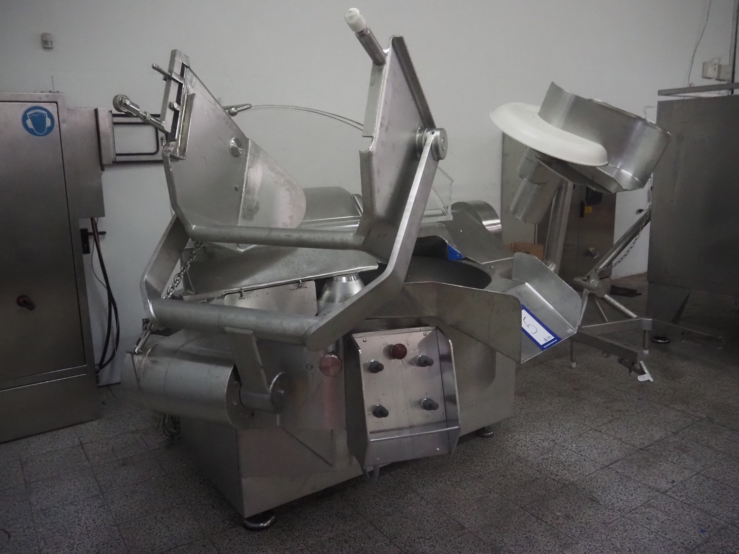 Seydelmann bowl cutter with lifter for meat bins and ejector, type: K206AC8, machine number: 00104-1, year of construction: 2000, 400 V, 50 Hz, 212 A, 107 kW, diameter s/s bowl: 1250 mm, total dimensions: 2100 mm x 2300 mm x 1930 mm. Including switch cabinet, dimensions: 1500 mm x 500 mm x 1970 mm.