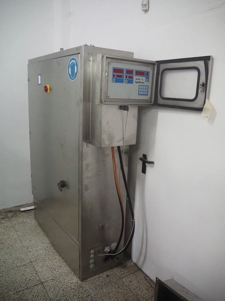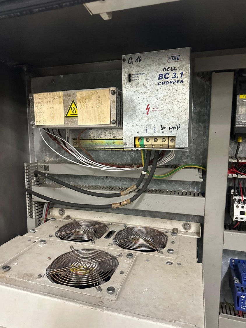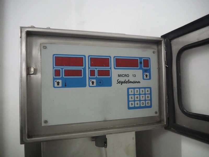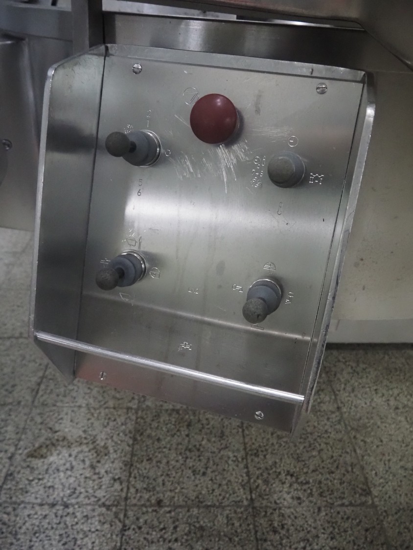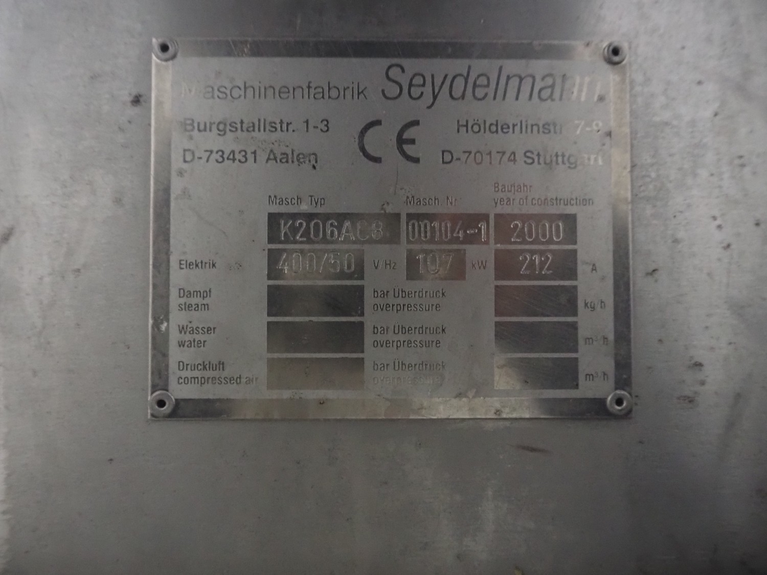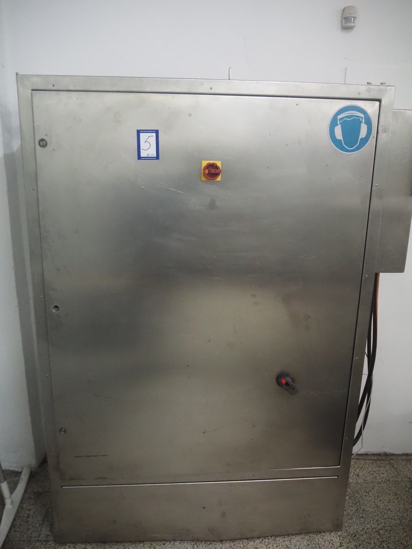 Seydelmann bowl cutter with lifter for meat bins and ejector, type: K206AC8, machine number: 00104-1, year of construction: 2000, 400 V, 50 Hz, 212 A, 107 kW, diameter s/s bowl: 1250 mm, total dimensions: 2100 mm x 2300 mm x 1930 mm. Including switch cabinet, dimensions: 1500 mm x 500 mm x 1970 mm.