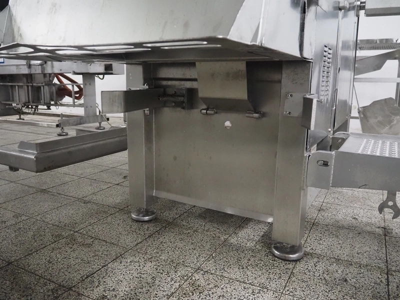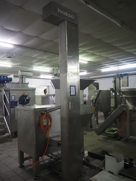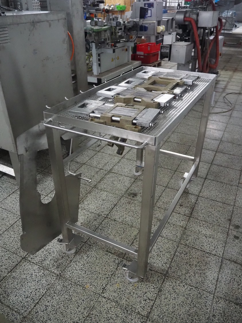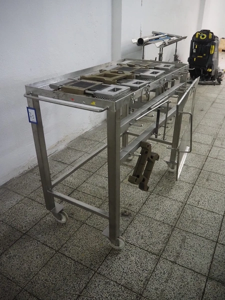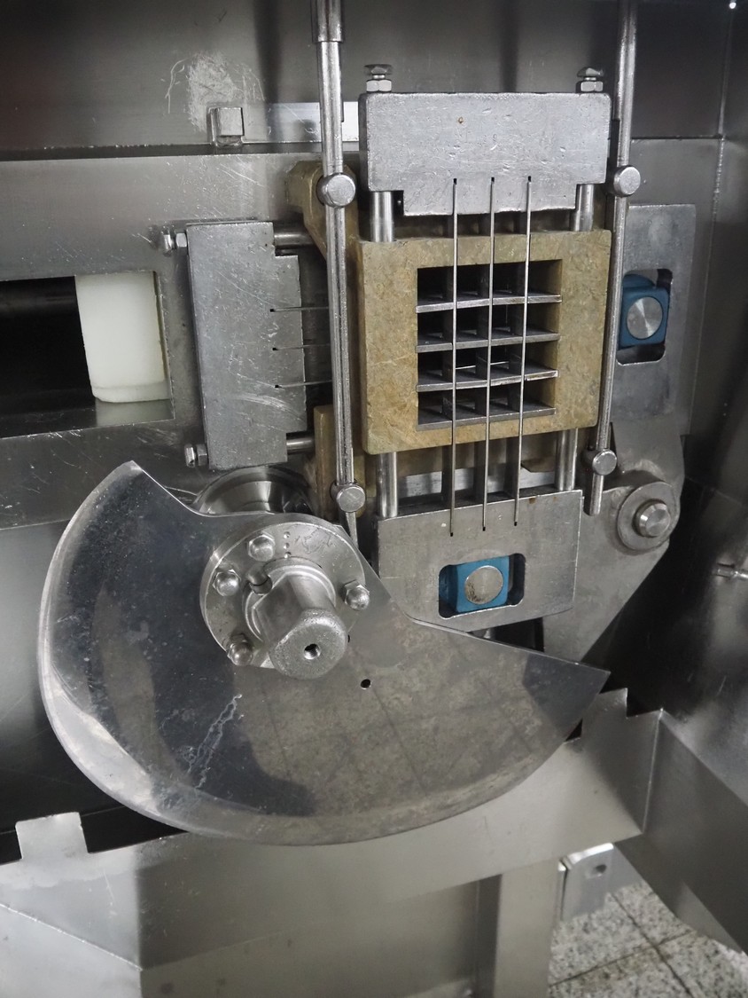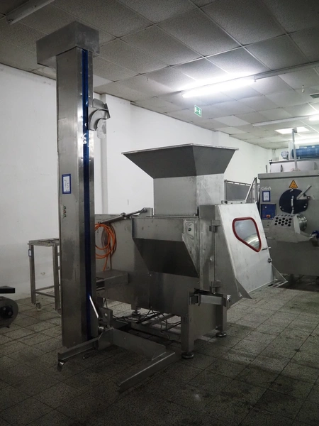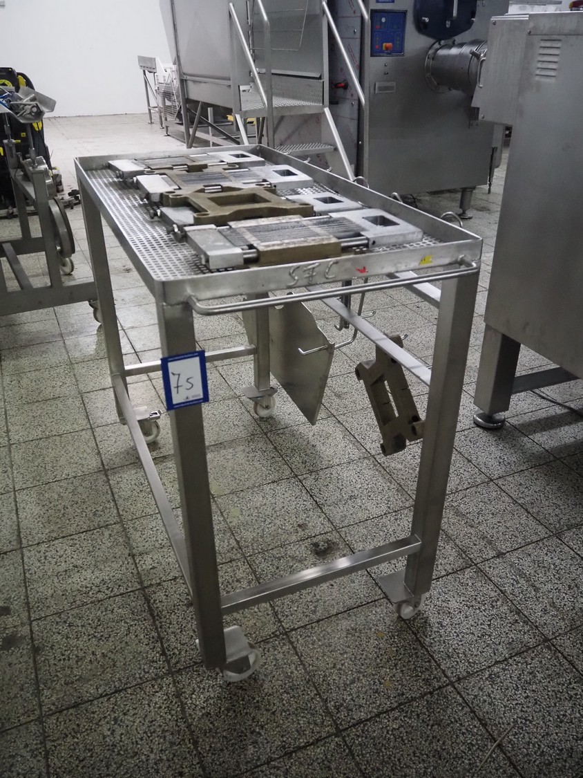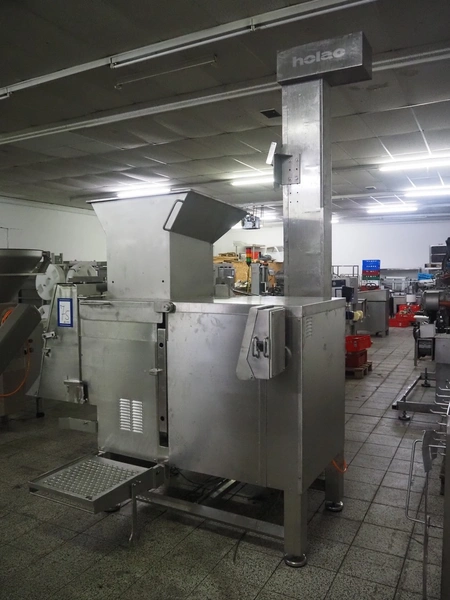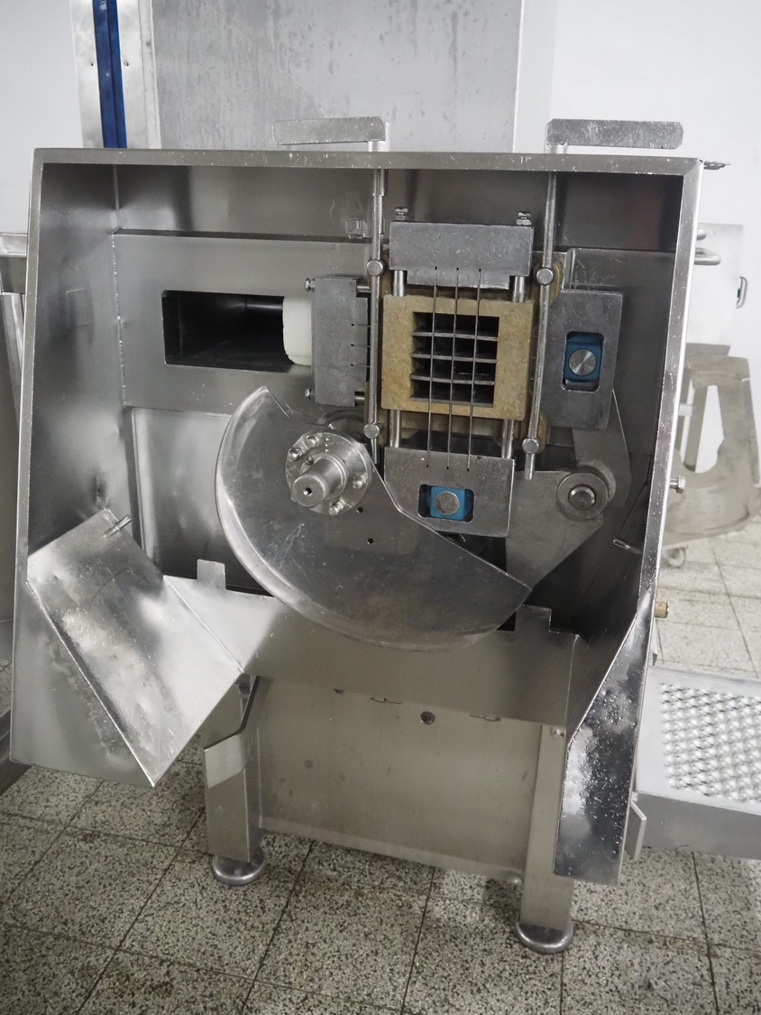 Holac dicer with lifter for meat bins, lifting height: 2450 mm, infeed clearance: 840 mm x 840 mm, grid: 27 mm x 27 mm, total dimensions: 2200 mm x 2200 mm x 3300 mm. Tool trolley with extra grids, grids: (2x) 5 mm, (2x) 10 mm, tool trolley dimensions: 1330 mm x 700 mm x 1040 mm.