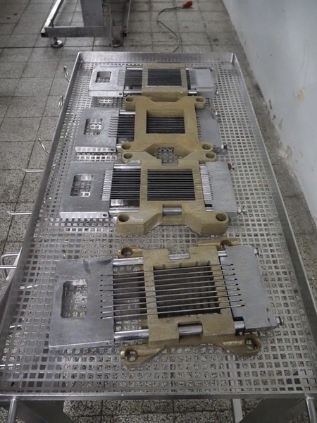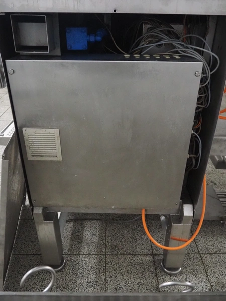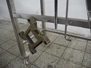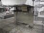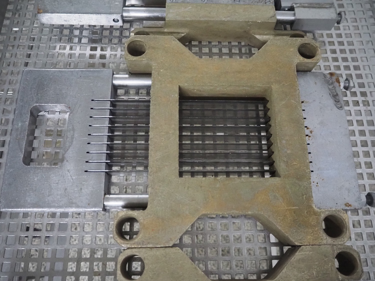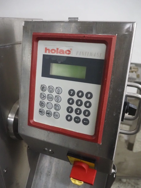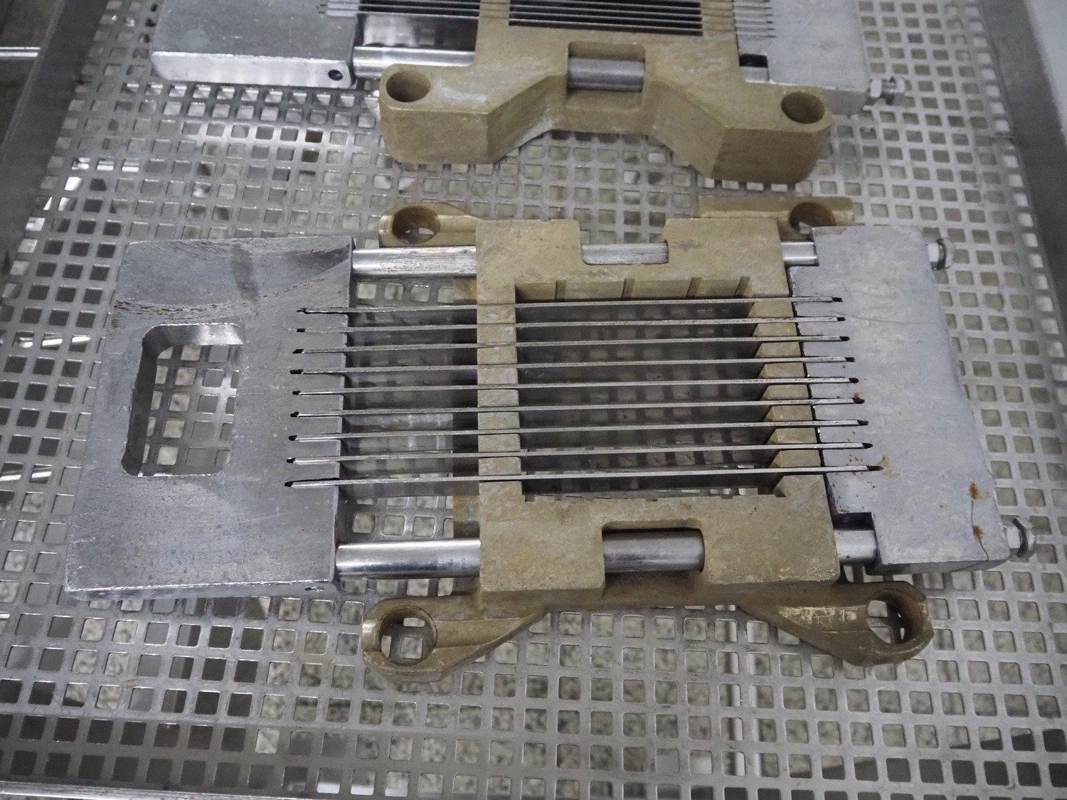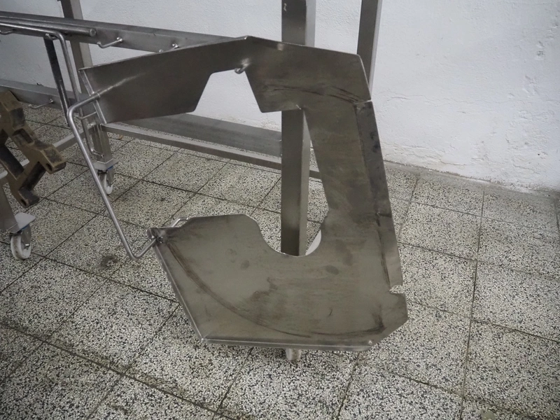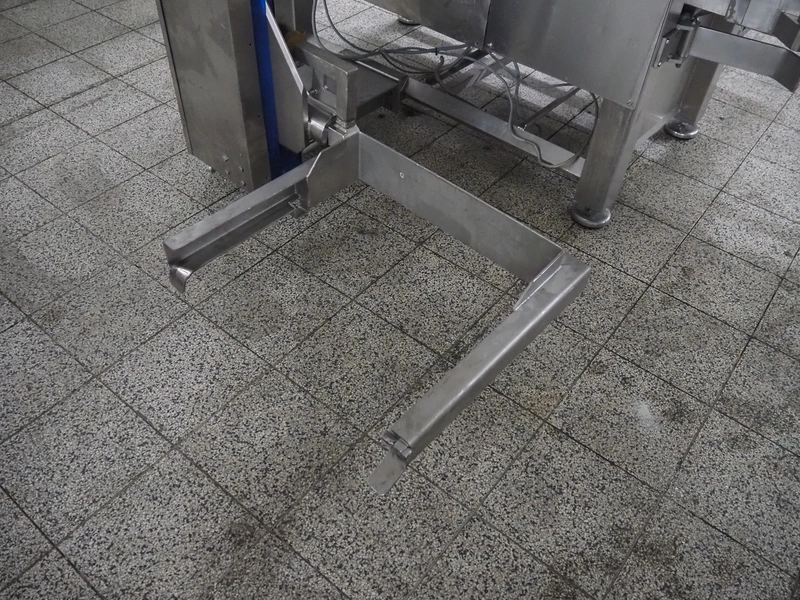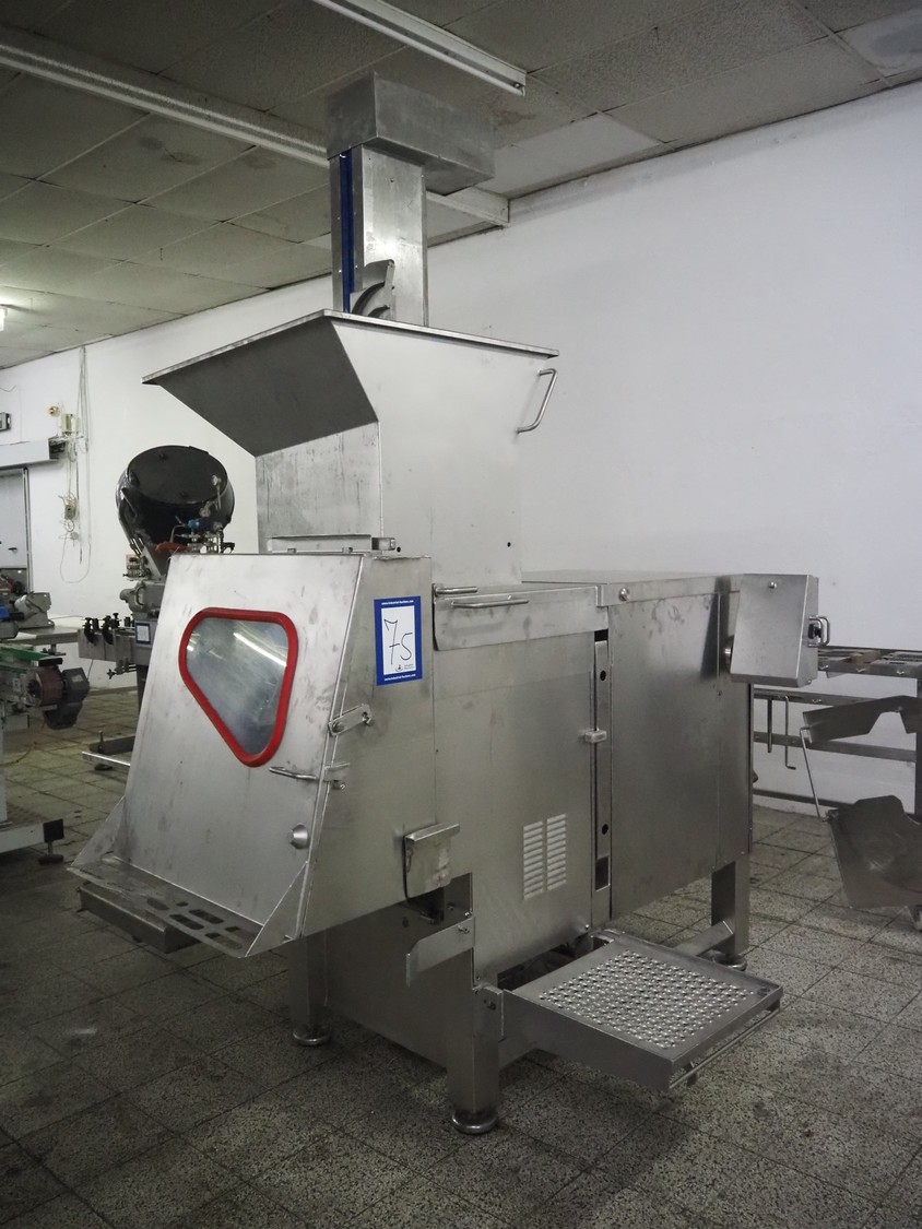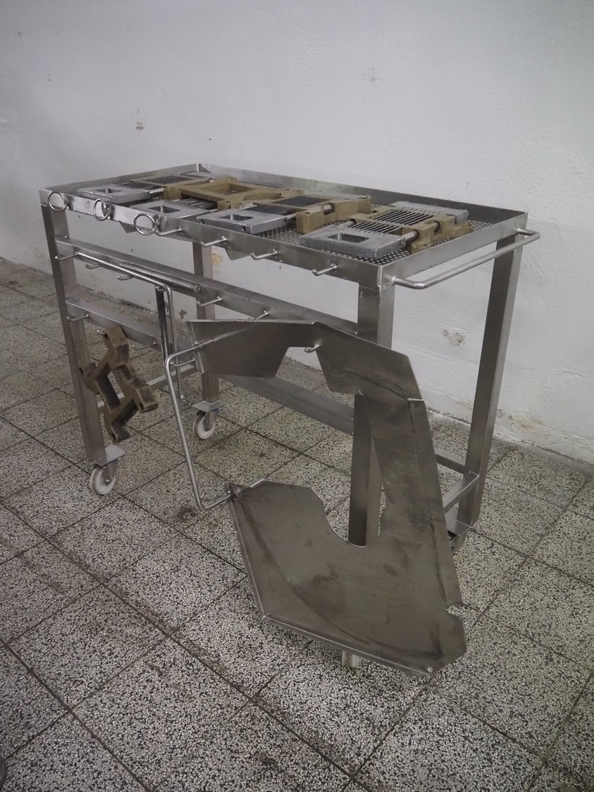 Holac dicer with lifter for meat bins, lifting height: 2450 mm, infeed clearance: 840 mm x 840 mm, grid: 27 mm x 27 mm, total dimensions: 2200 mm x 2200 mm x 3300 mm. Tool trolley with extra grids, grids: (2x) 5 mm, (2x) 10 mm, tool trolley dimensions: 1330 mm x 700 mm x 1040 mm.