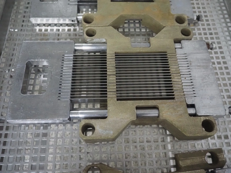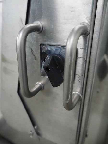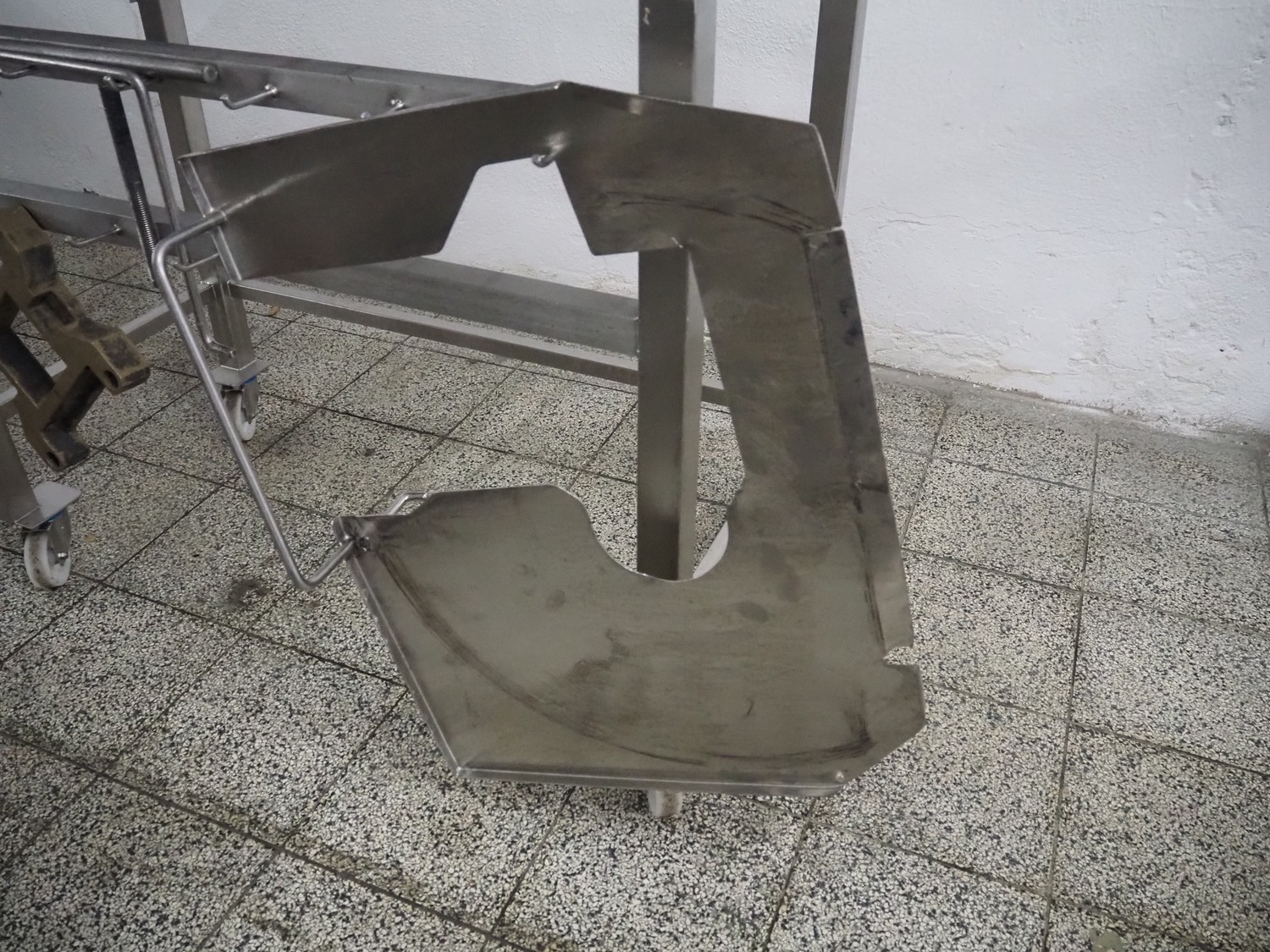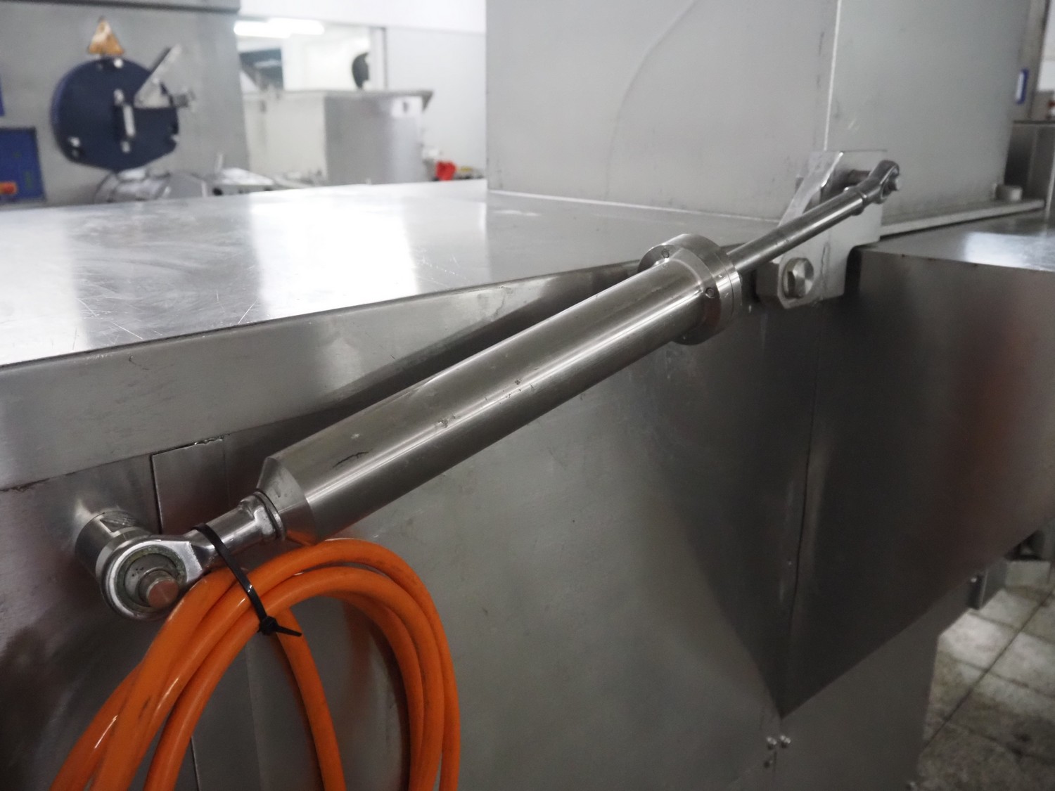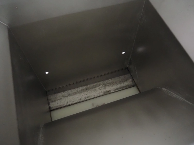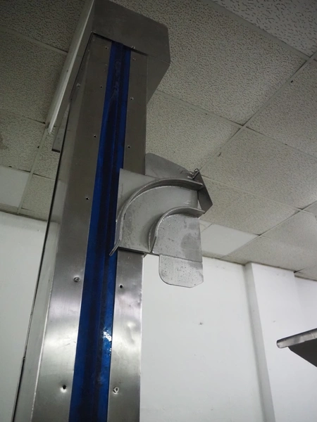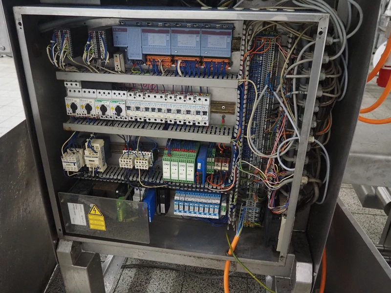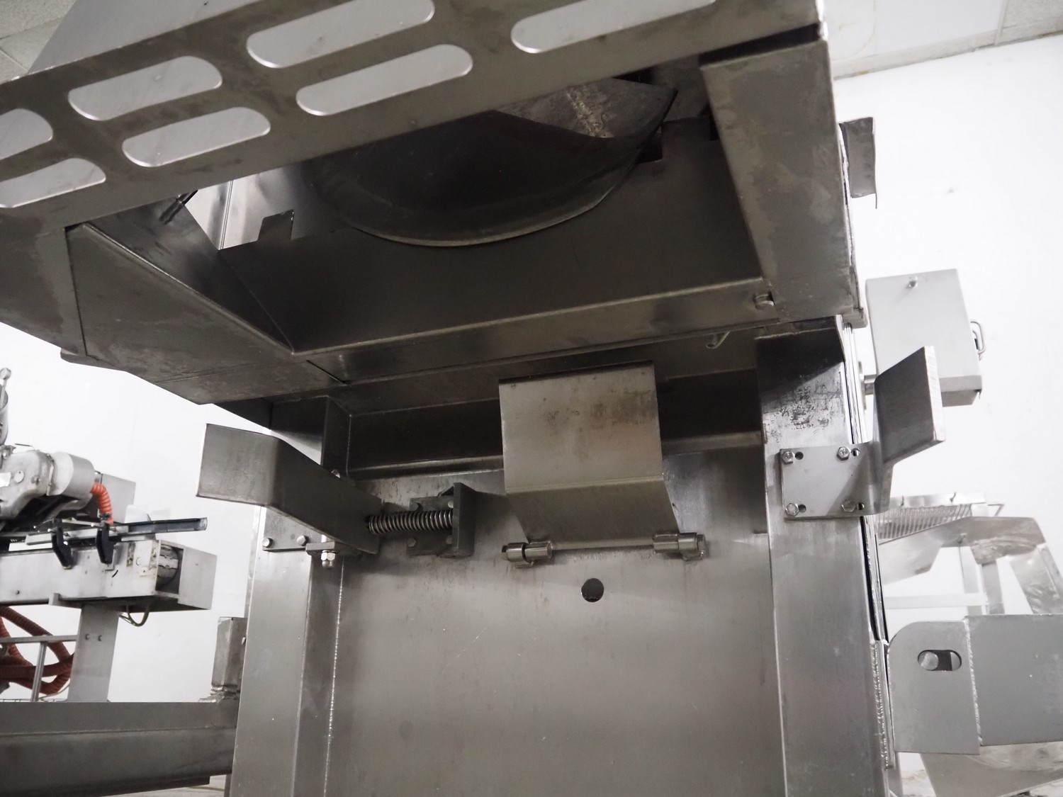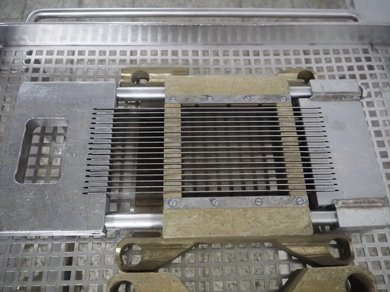 Holac dicer with lifter for meat bins, lifting height: 2450 mm, infeed clearance: 840 mm x 840 mm, grid: 27 mm x 27 mm, total dimensions: 2200 mm x 2200 mm x 3300 mm. Tool trolley with extra grids, grids: (2x) 5 mm, (2x) 10 mm, tool trolley dimensions: 1330 mm x 700 mm x 1040 mm.