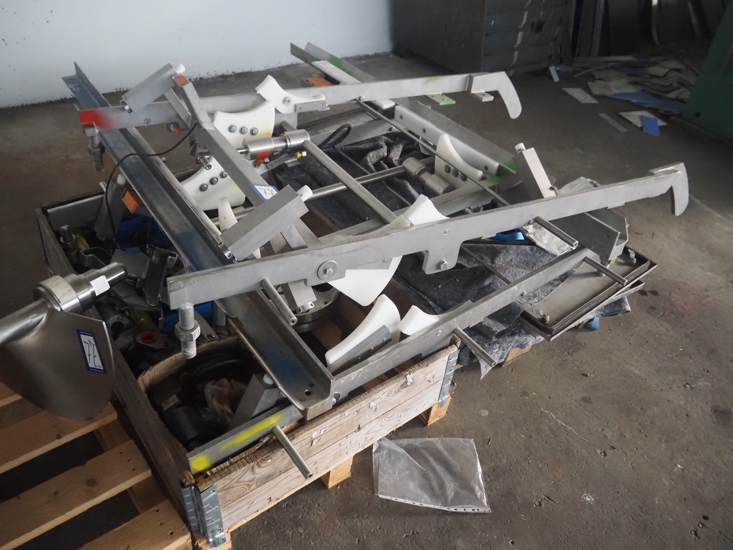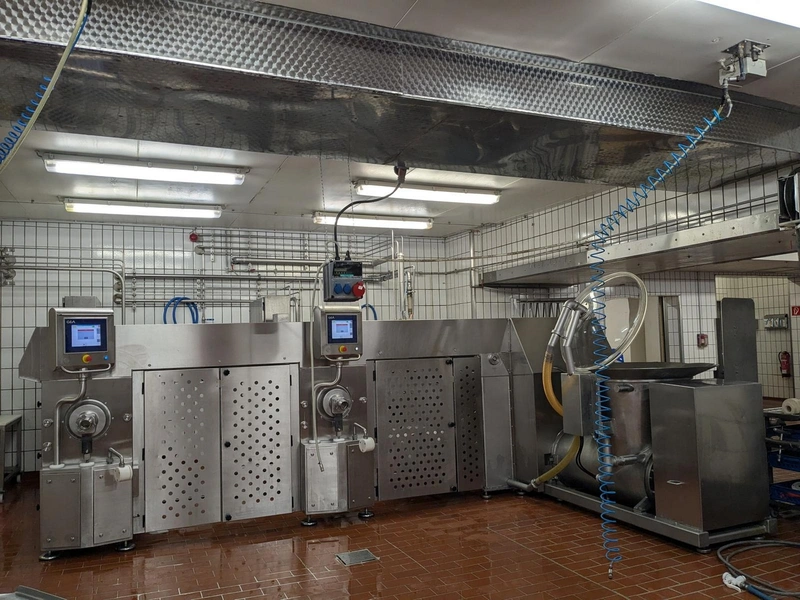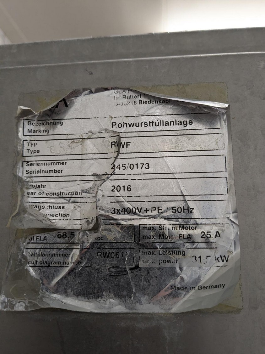 GEA smoked sausage filling machine, type: RWF, serial number: 245/0173, year of construction: 2016, 400 V, 3 Ph, 50 Hz, 25 A, 32.5 kW. Lot is professionally dismantled.