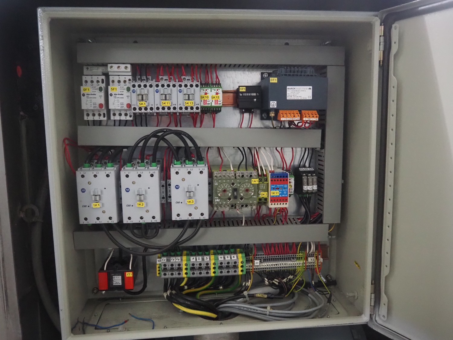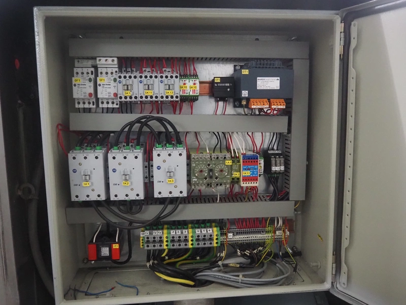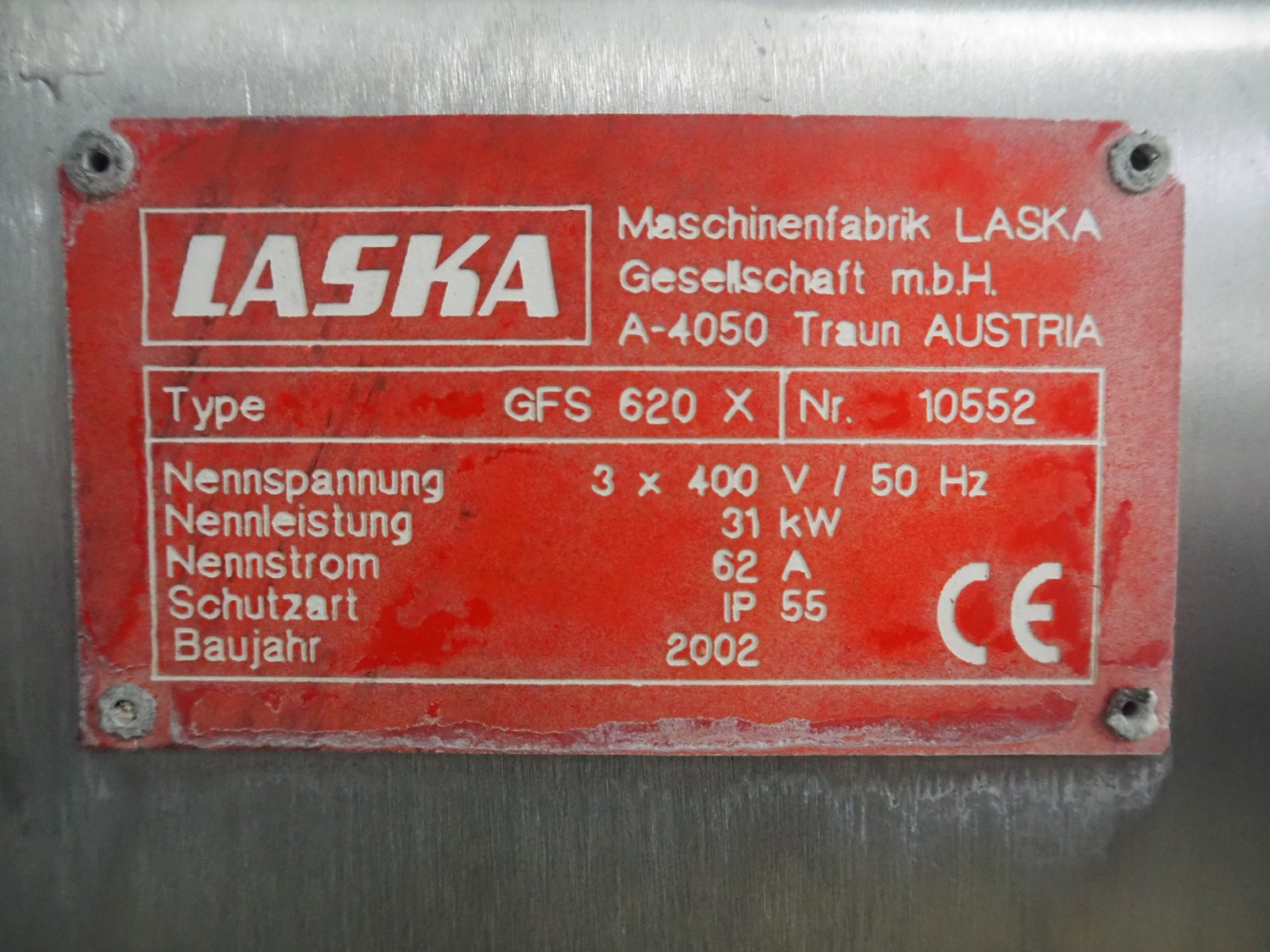 Laska breaker with lifter, type: GFS 620 X, number: 10552, year of construction: 2002, 400 V, 3 Ph, 50 Hz, 62 A, 55 Ip, 31 kW, infeed clearance: 640 mm x 500 mm, working width: 640 mm, total dimensions: 1900 mm x 1900 mm x 2250 mm.