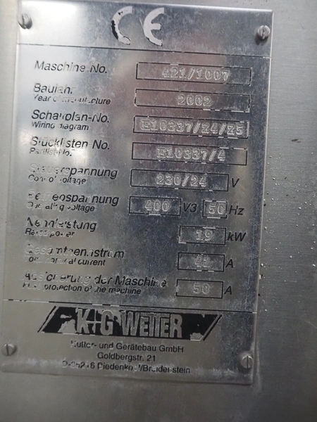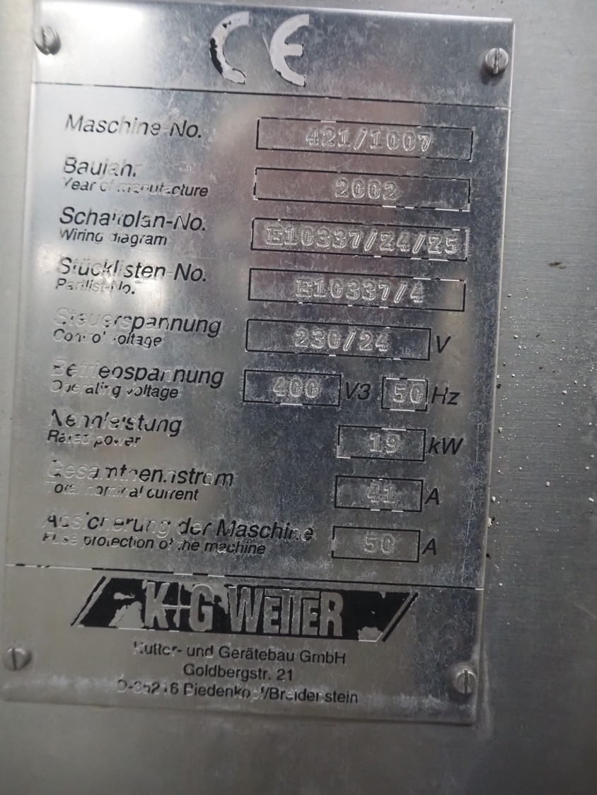 K+G Wetter grinder, machine number: 421/1007, year of construction: 2002, 230/400 V, 3 Ph, 50 Hz, 41/50 A, 19 kW, diameter plate: 160 mm, total dimensions: 1350 mm x 950 mm x 1280 mm.