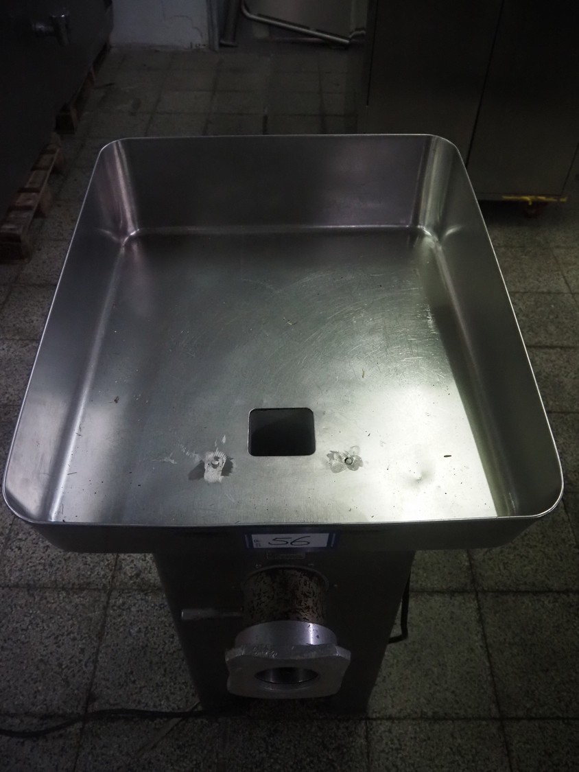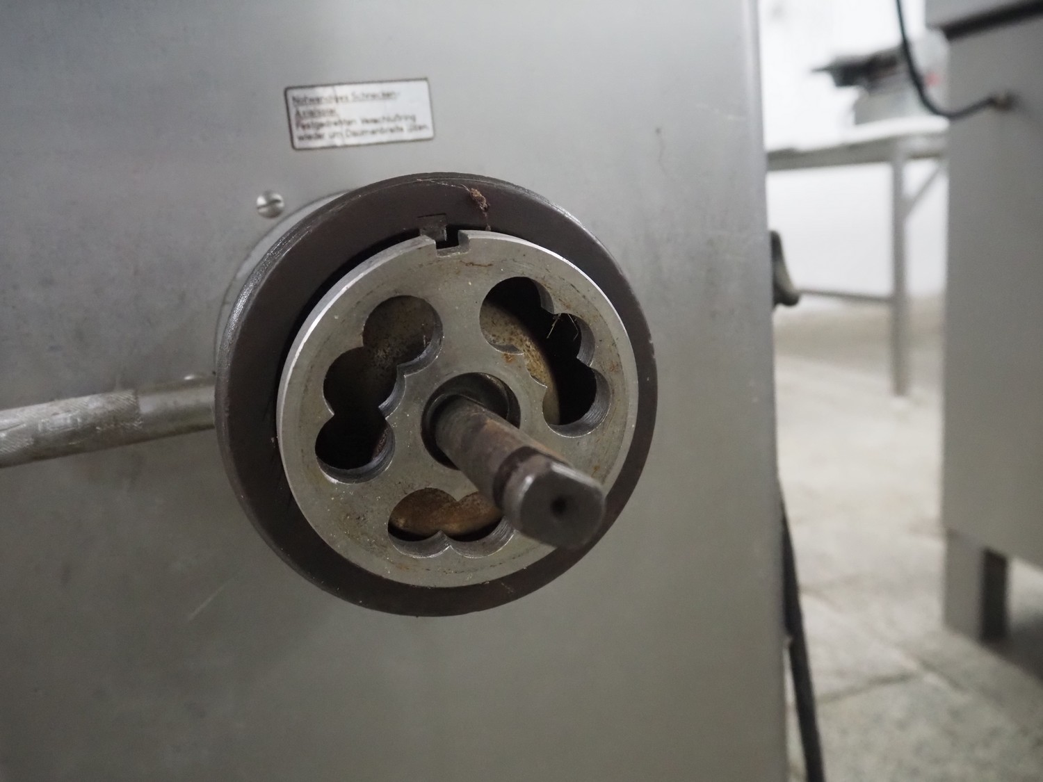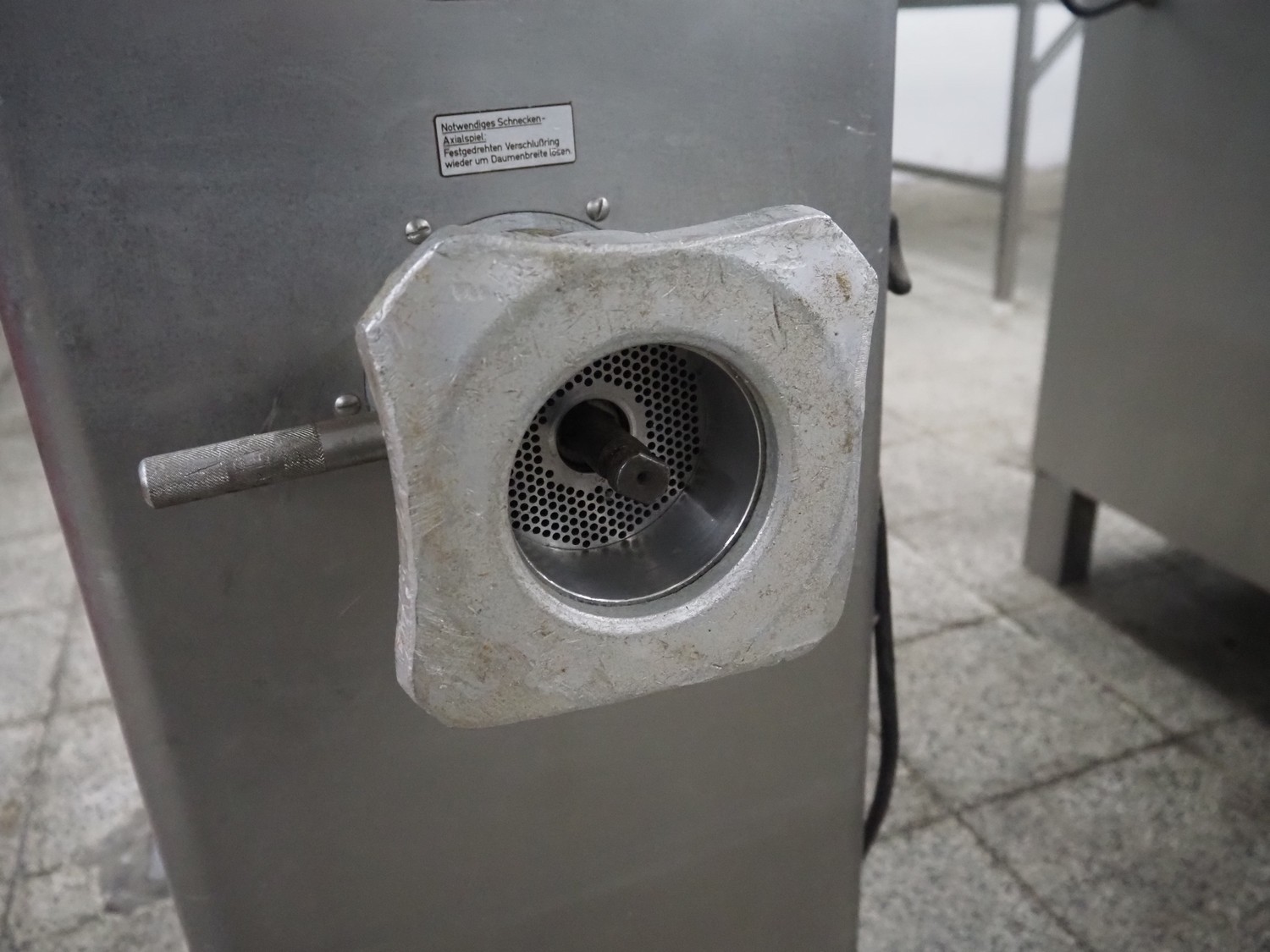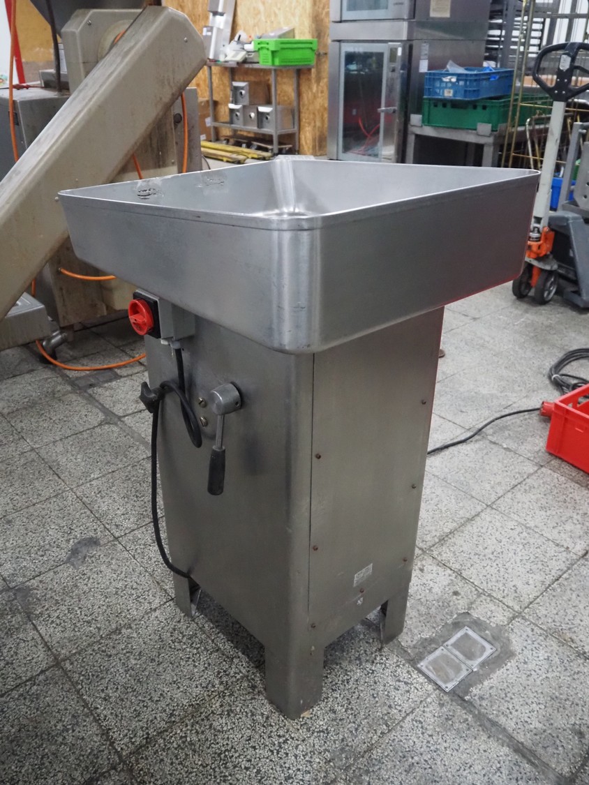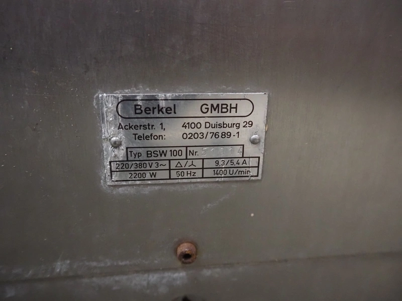 Berkel GmbH grinder, type: BSW 100, number: 51014, 220/380 V, 3 Ph, 50 Hz, 9.3/5.4 A, 2200 W, plate diameter: 100 mm, total dimensions: 700 mm x 580 mm x 1060 mm. Including extra knives and plates.