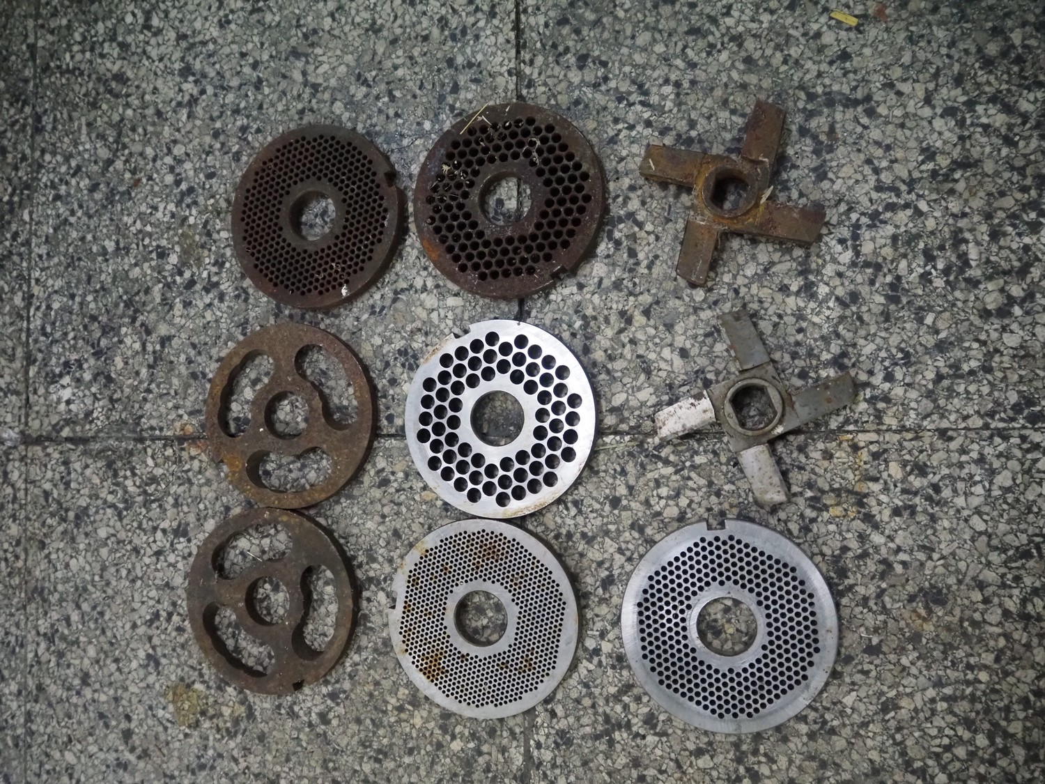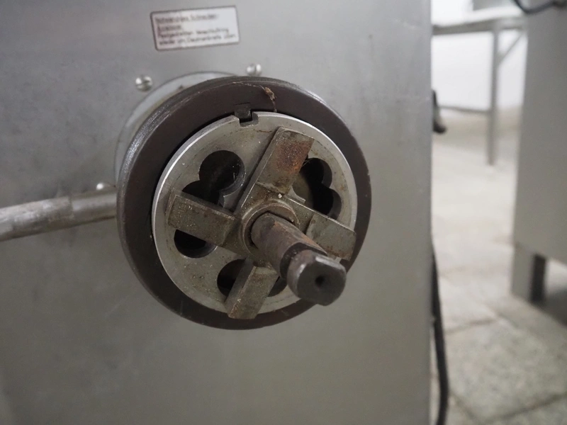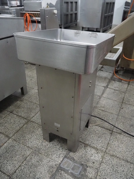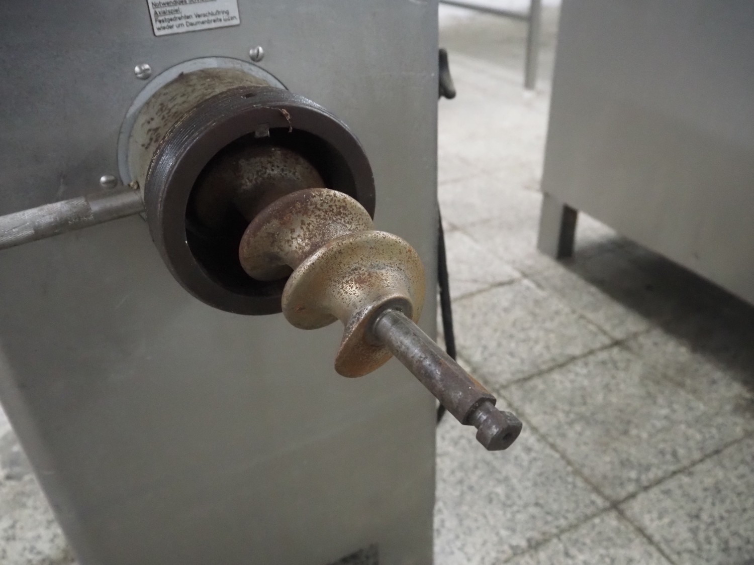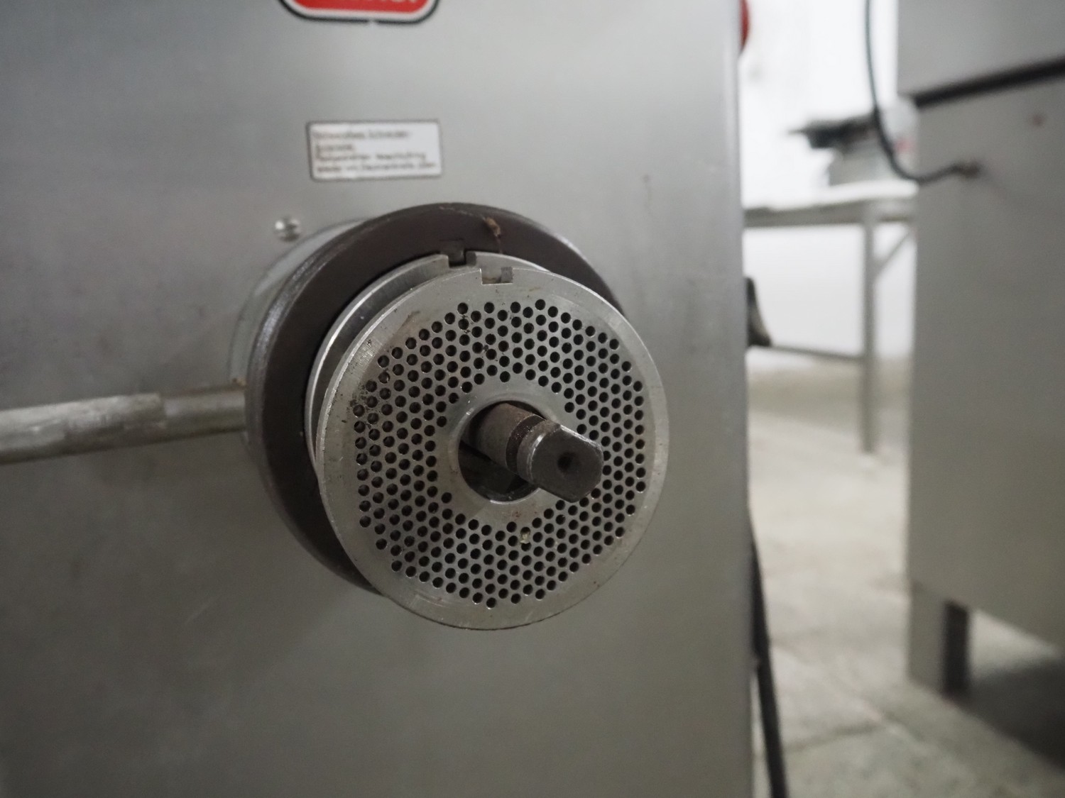 Berkel GmbH grinder, type: BSW 100, number: 51014, 220/380 V, 3 Ph, 50 Hz, 9.3/5.4 A, 2200 W, plate diameter: 100 mm, total dimensions: 700 mm x 580 mm x 1060 mm. Including extra knives and plates.