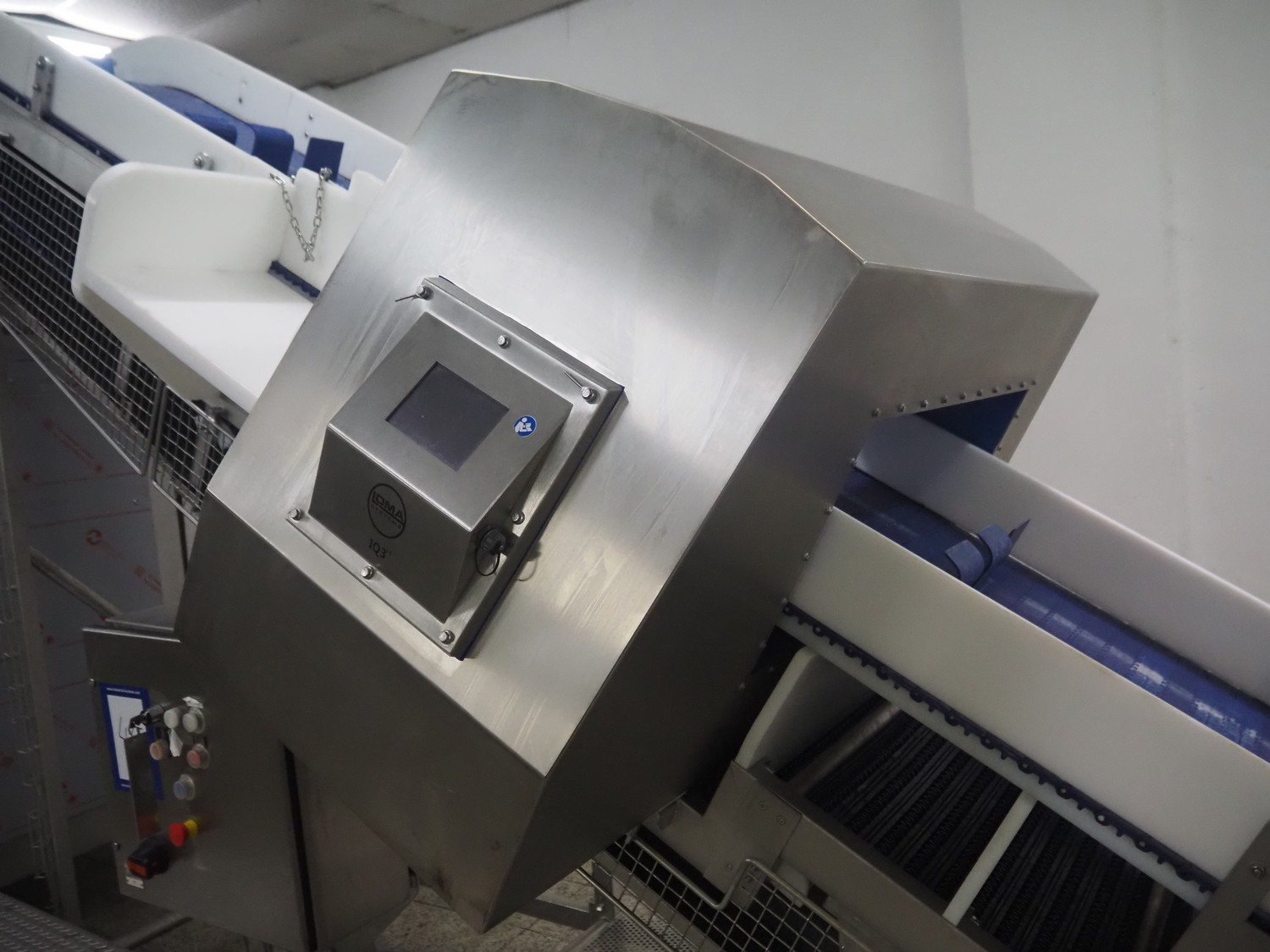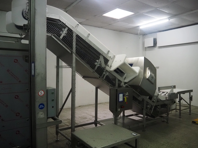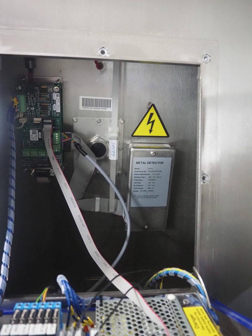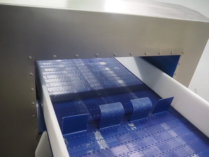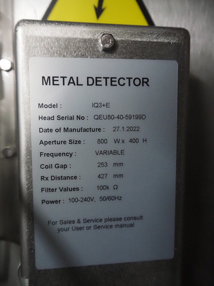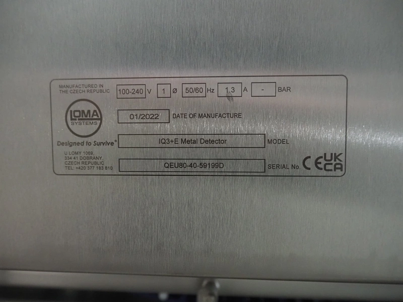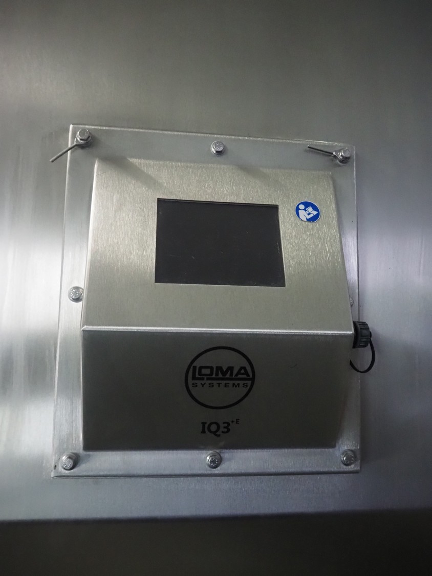Loma systems elevating metal detector, model: IQ3+E, serial number: QEU80-40-59199D, year of construction: 27.1.2022, 100/240 V, 50/60 Hz, plastic belt with dividers, belt width: 690 mm, dividers height: 110 mm, distance between dividers: 890 mm, clearance: 800 mm x 290 mm, elevating height: 2700 mm, total dimensions: 5000 mm x 1500 mm x 2840 mm. Including pallet with belt parts.