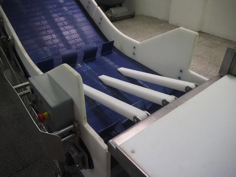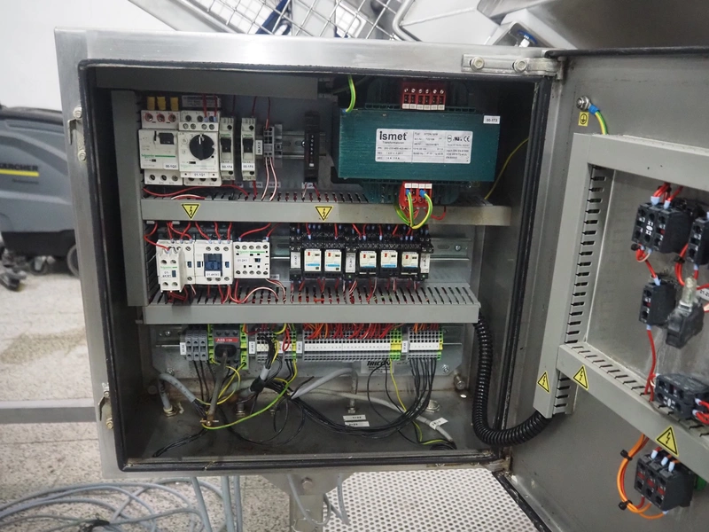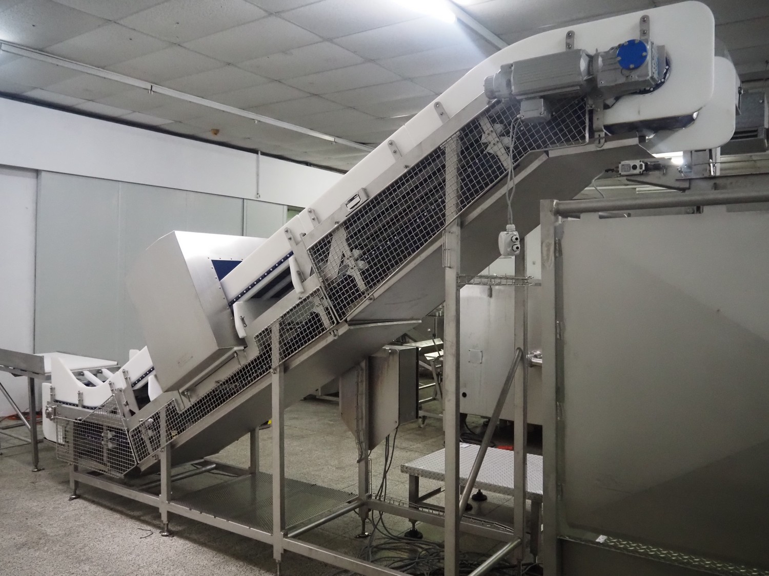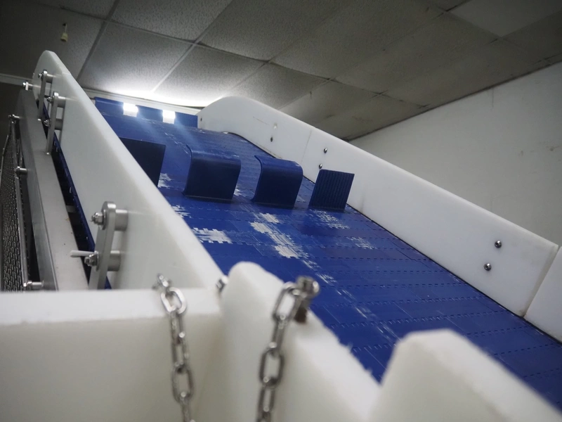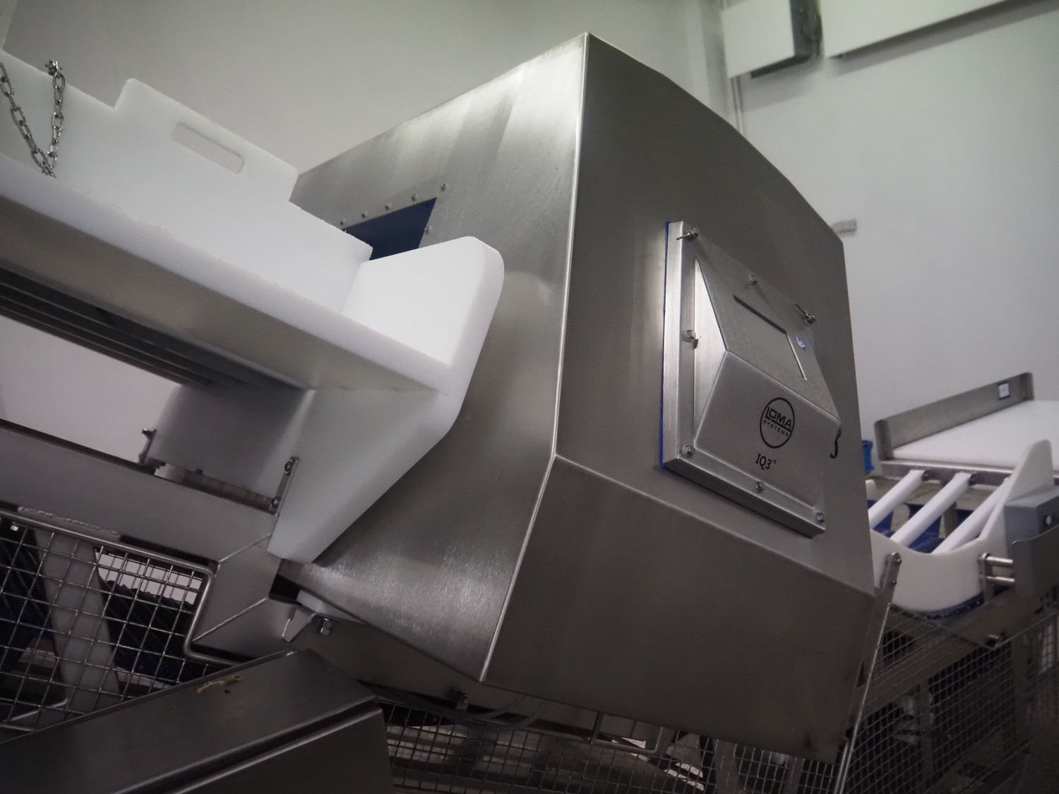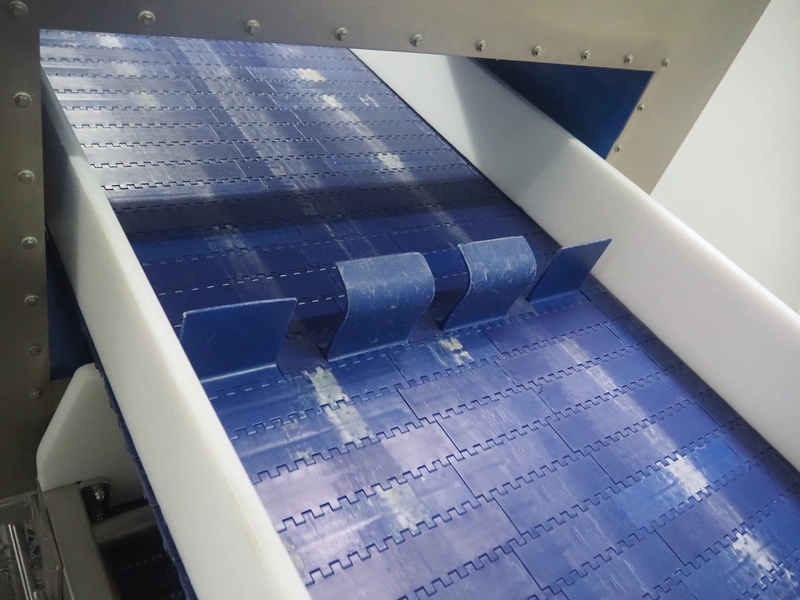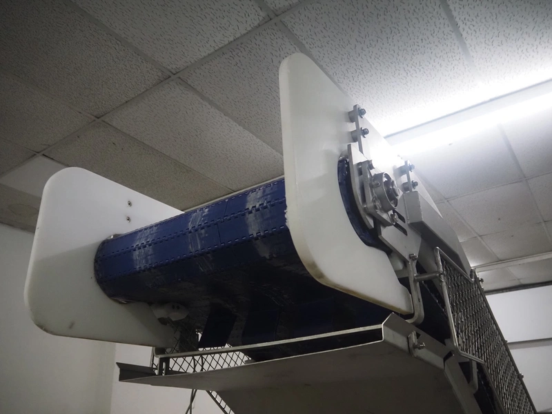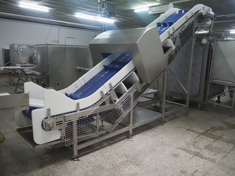 Loma systems elevating metal detector, model: IQ3+E, serial number: QEU80-40-59199D, year of construction: 27.1.2022, 100/240 V, 50/60 Hz, plastic belt with dividers, belt width: 690 mm, dividers height: 110 mm, distance between dividers: 890 mm, clearance: 800 mm x 290 mm, elevating height: 2700 mm, total dimensions: 5000 mm x 1500 mm x 2840 mm. Including pallet with belt parts.