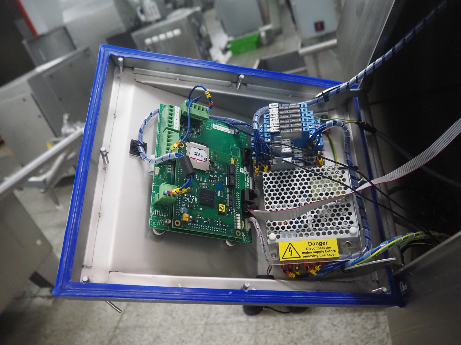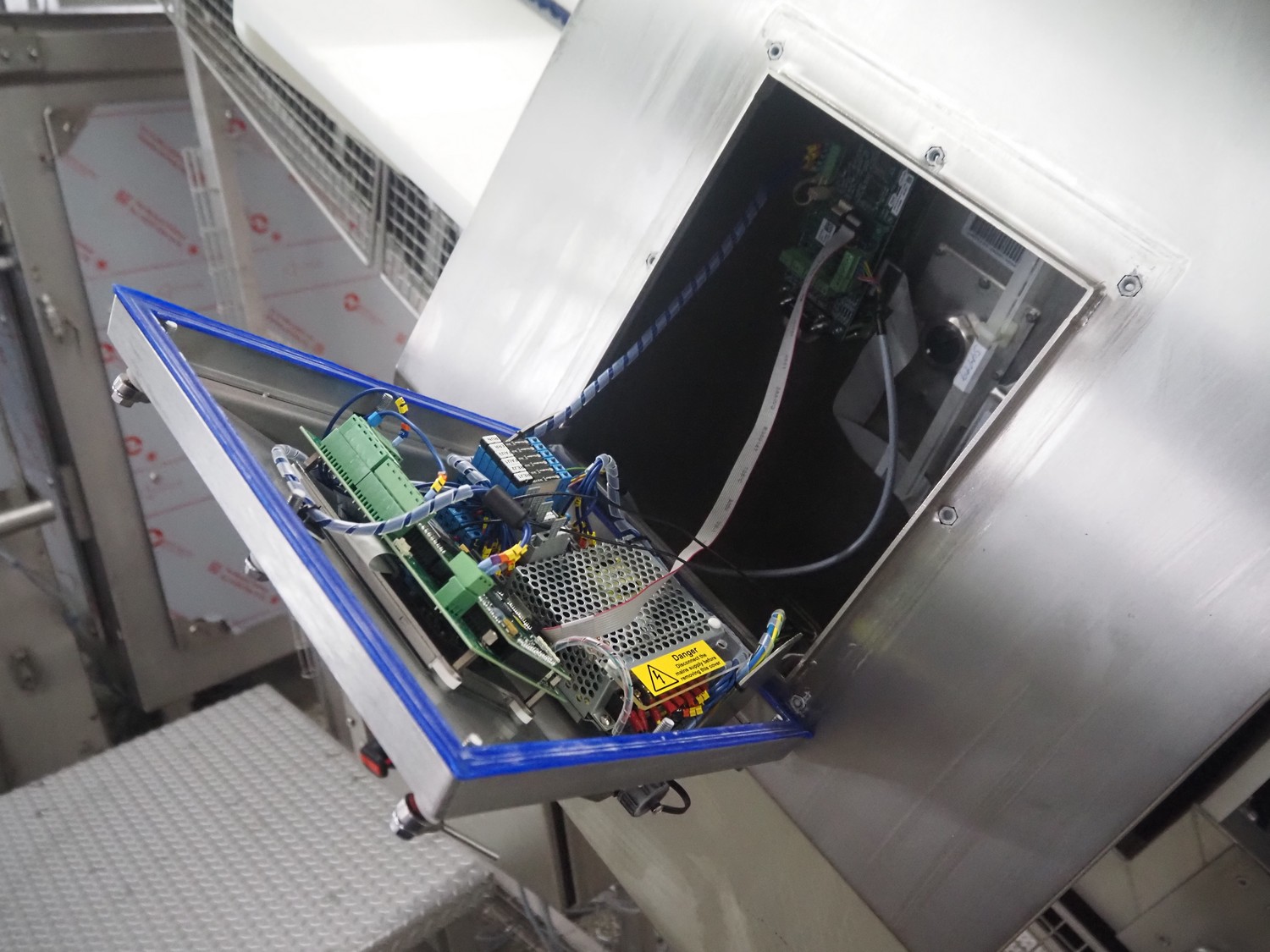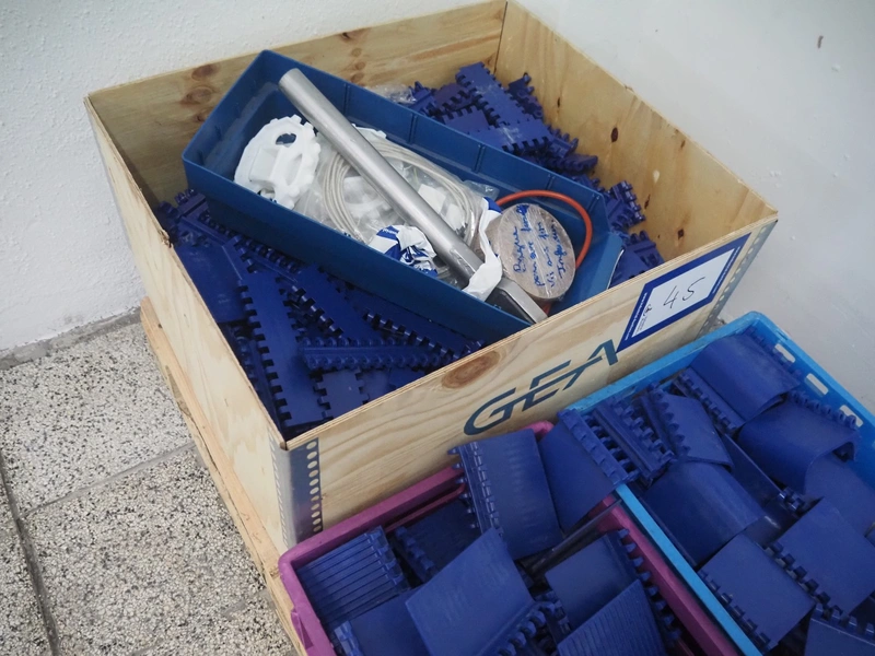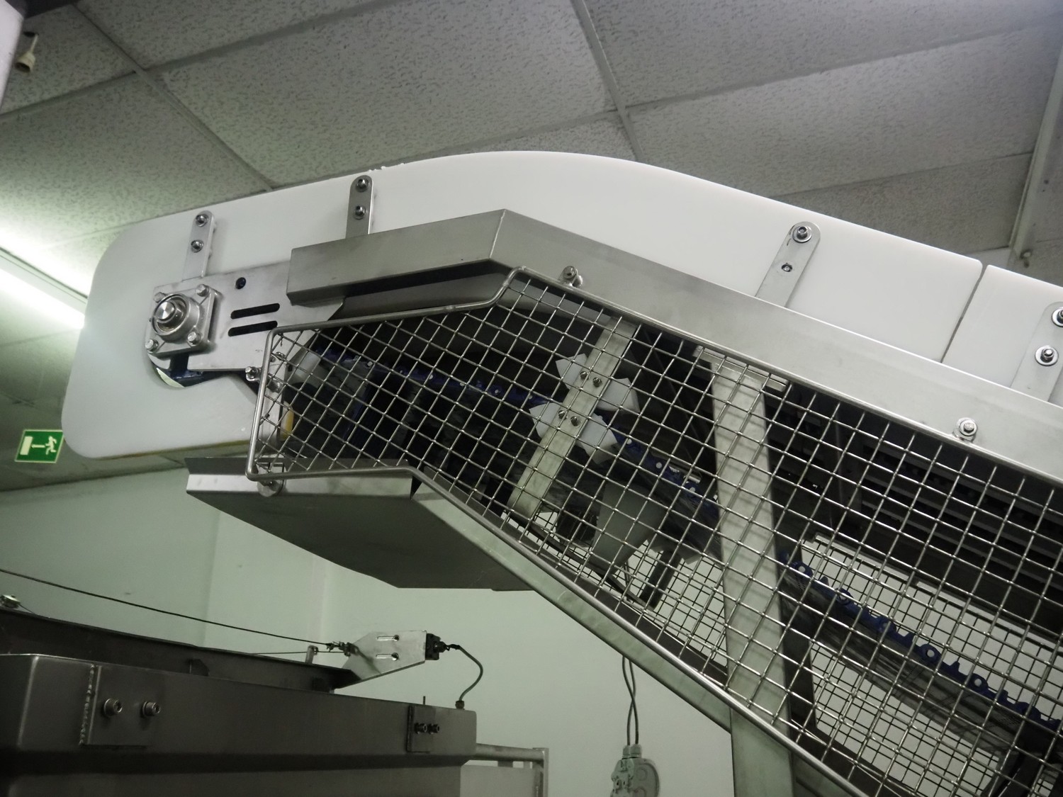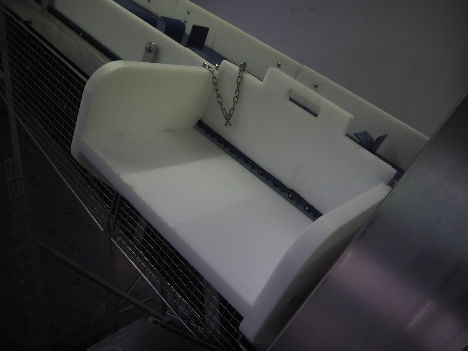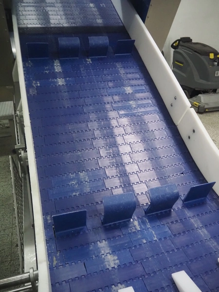 Loma systems elevating metal detector, model: IQ3+E, serial number: QEU80-40-59199D, year of construction: 27.1.2022, 100/240 V, 50/60 Hz, plastic belt with dividers, belt width: 690 mm, dividers height: 110 mm, distance between dividers: 890 mm, clearance: 800 mm x 290 mm, elevating height: 2700 mm, total dimensions: 5000 mm x 1500 mm x 2840 mm. Including pallet with belt parts.