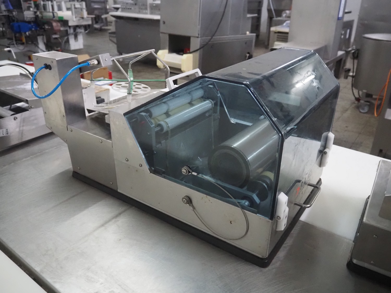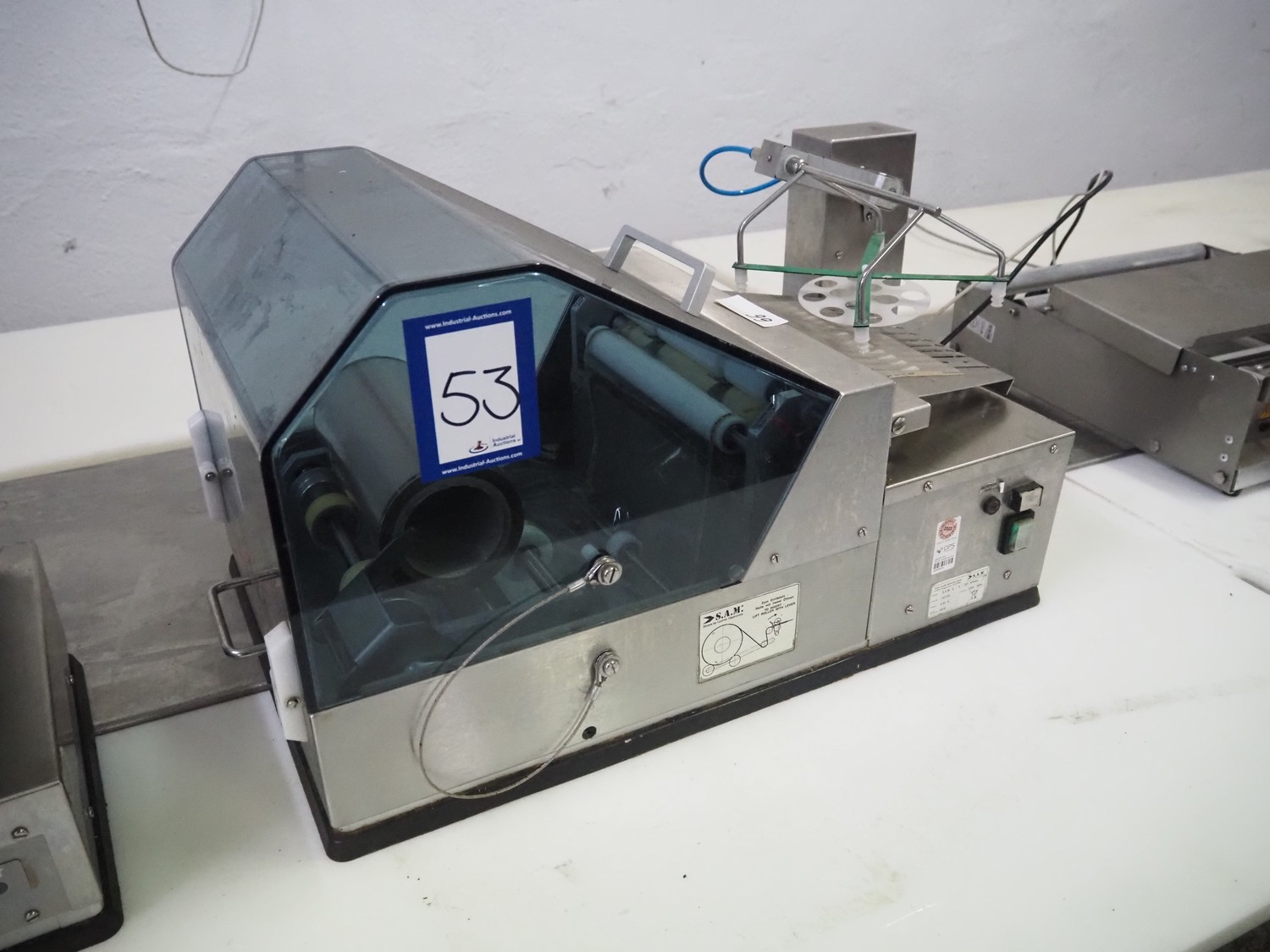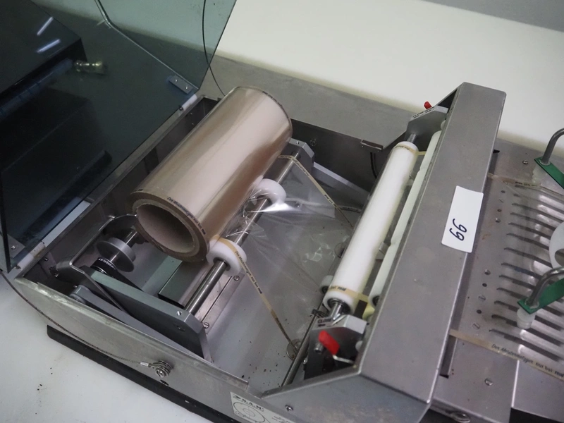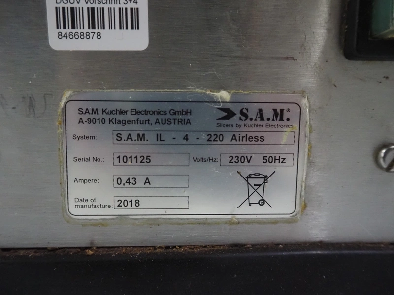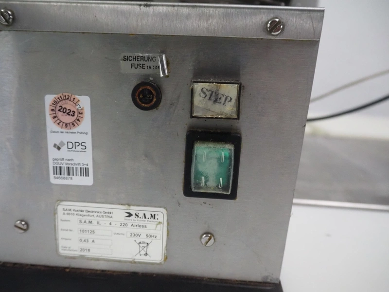 S.A.M kuchler Electronics GmbH packing machine, system: IL - 4 - 220 Airless, serial number: 101125, year of construction: 2018, 230 V, 50 Hz, 0.43 A, film width: 220 mm, total dimensions: 800 mm x 400 mm x 380 mm.