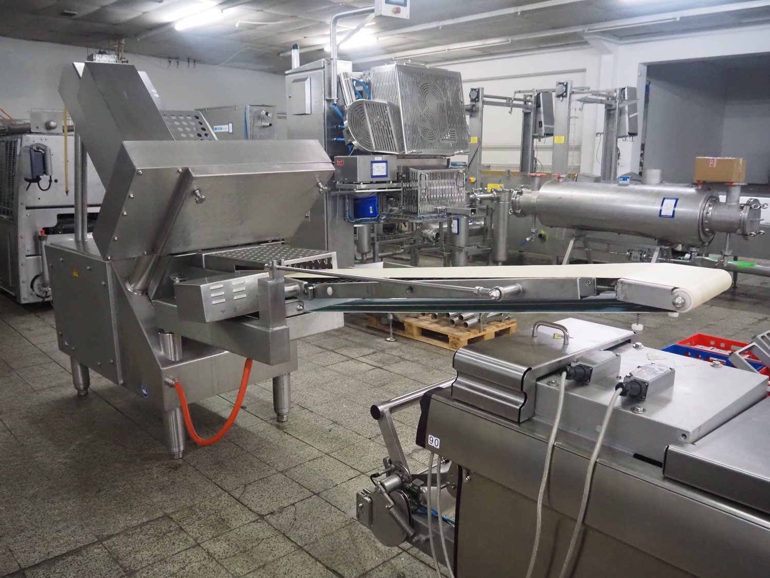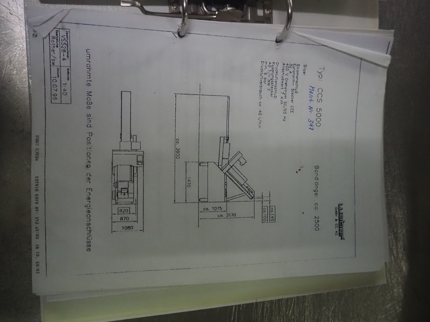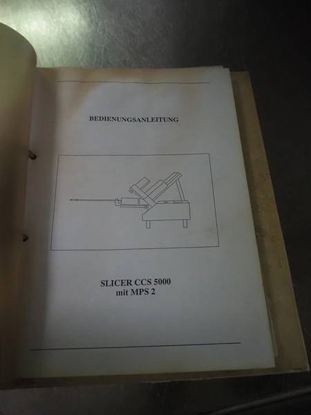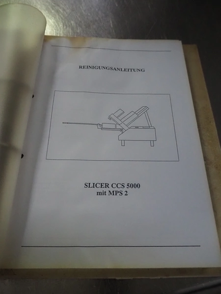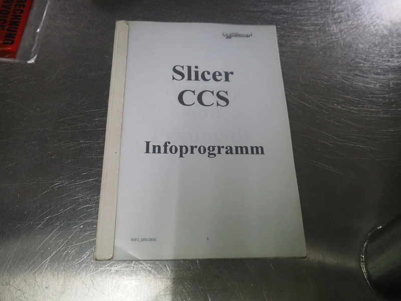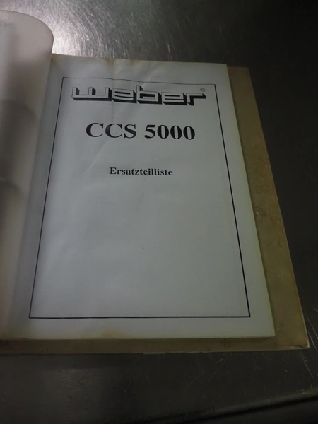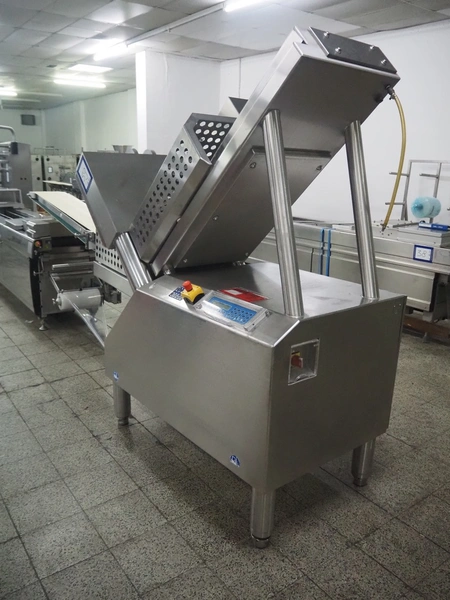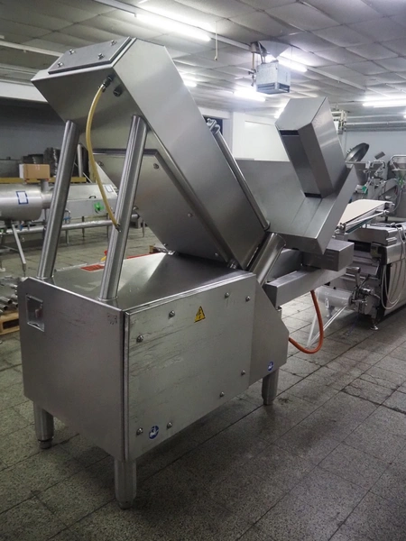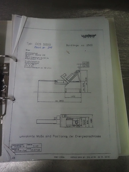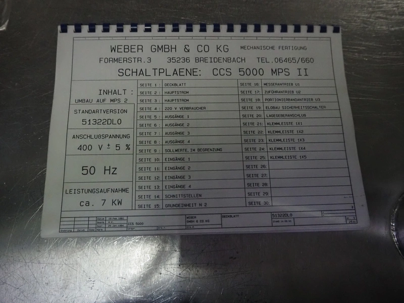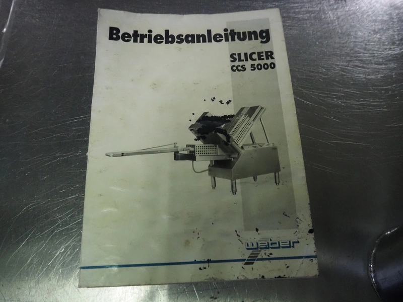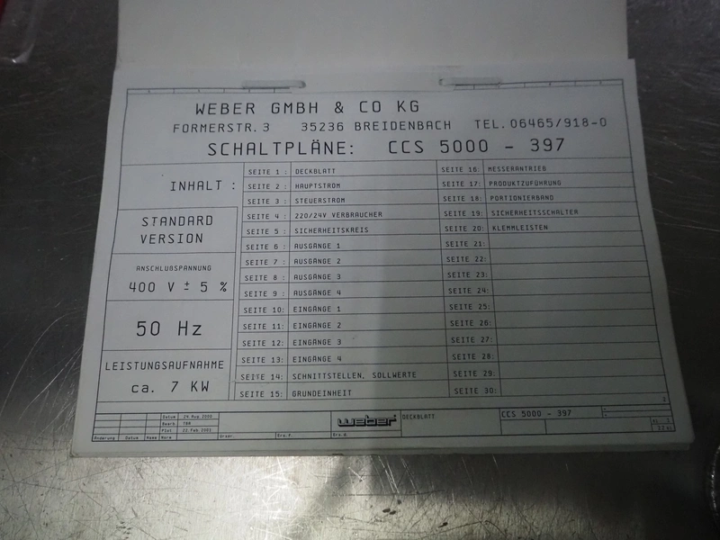 Weber slicer, type: CCS5000, number: 397, 400 V, 50 Hz, 7 kW, plastic belt, belt width: 300 mm, diameter knive: 300 mm, clearance: 300 mm x 135 mm, total dimensions: 3930 mm x 1100 mm x 2200 mm.