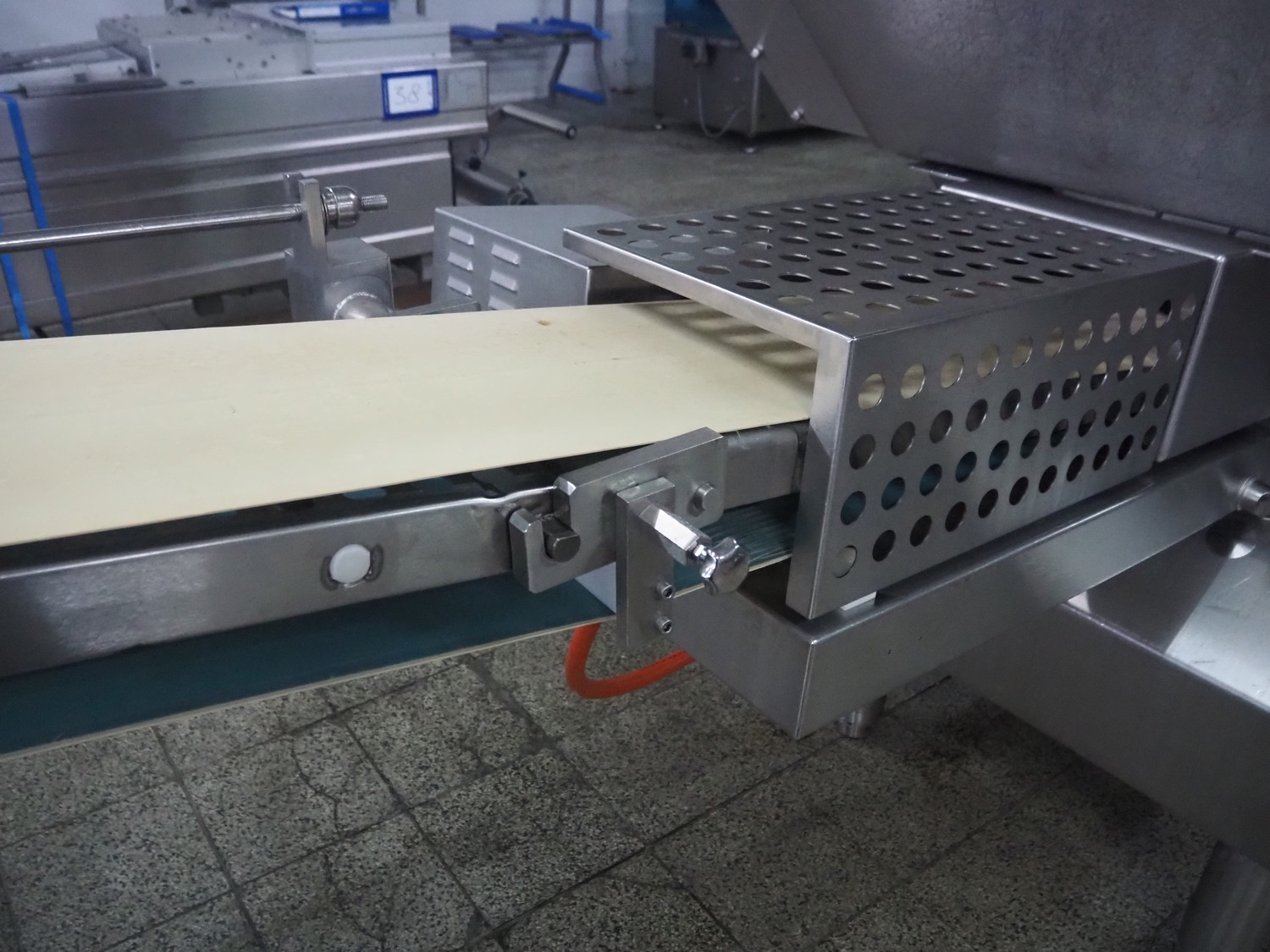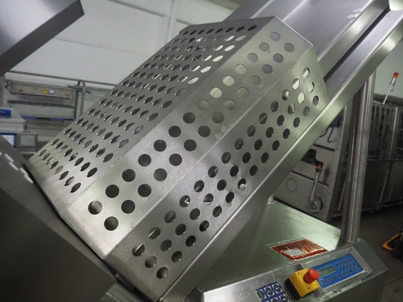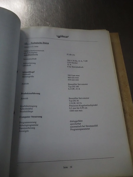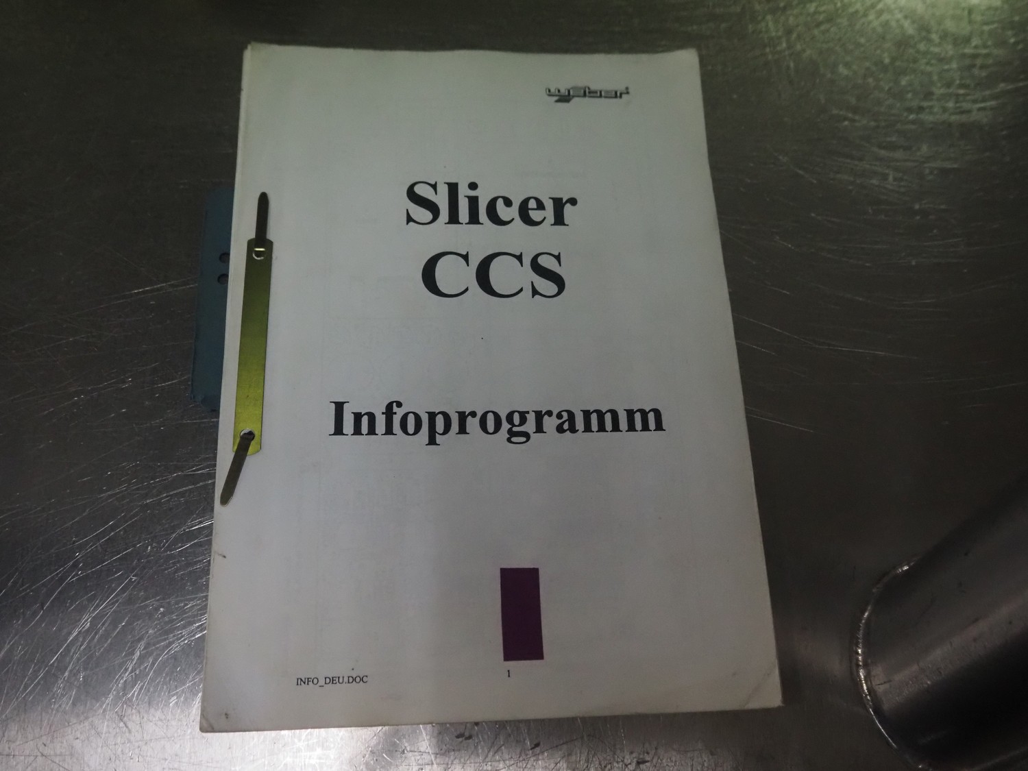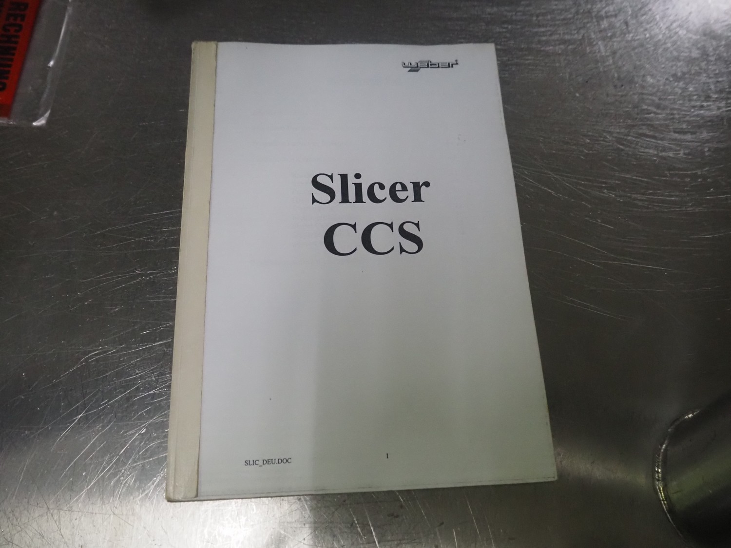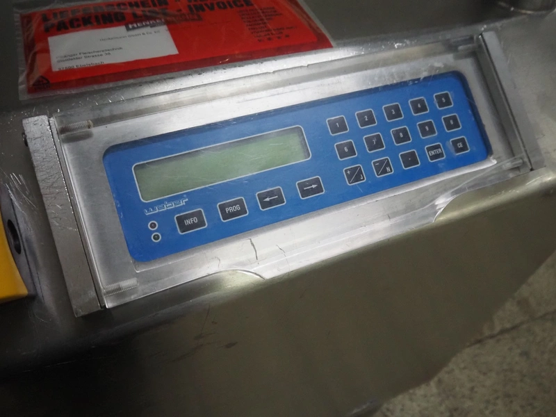 Weber slicer, type: CCS5000, number: 397, 400 V, 50 Hz, 7 kW, plastic belt, belt width: 300 mm, diameter knive: 300 mm, clearance: 300 mm x 135 mm, total dimensions: 3930 mm x 1100 mm x 2200 mm.