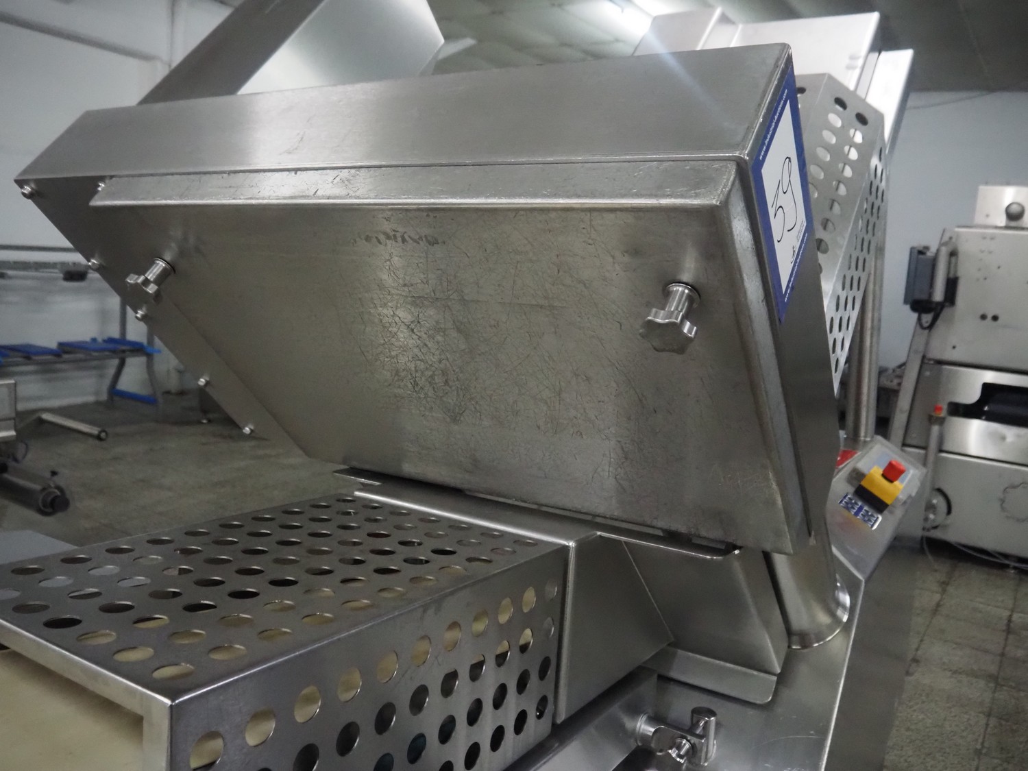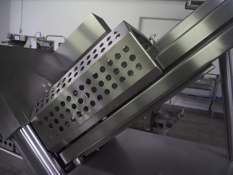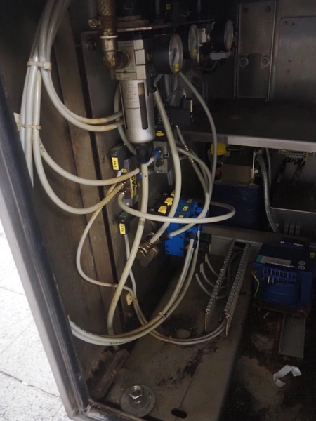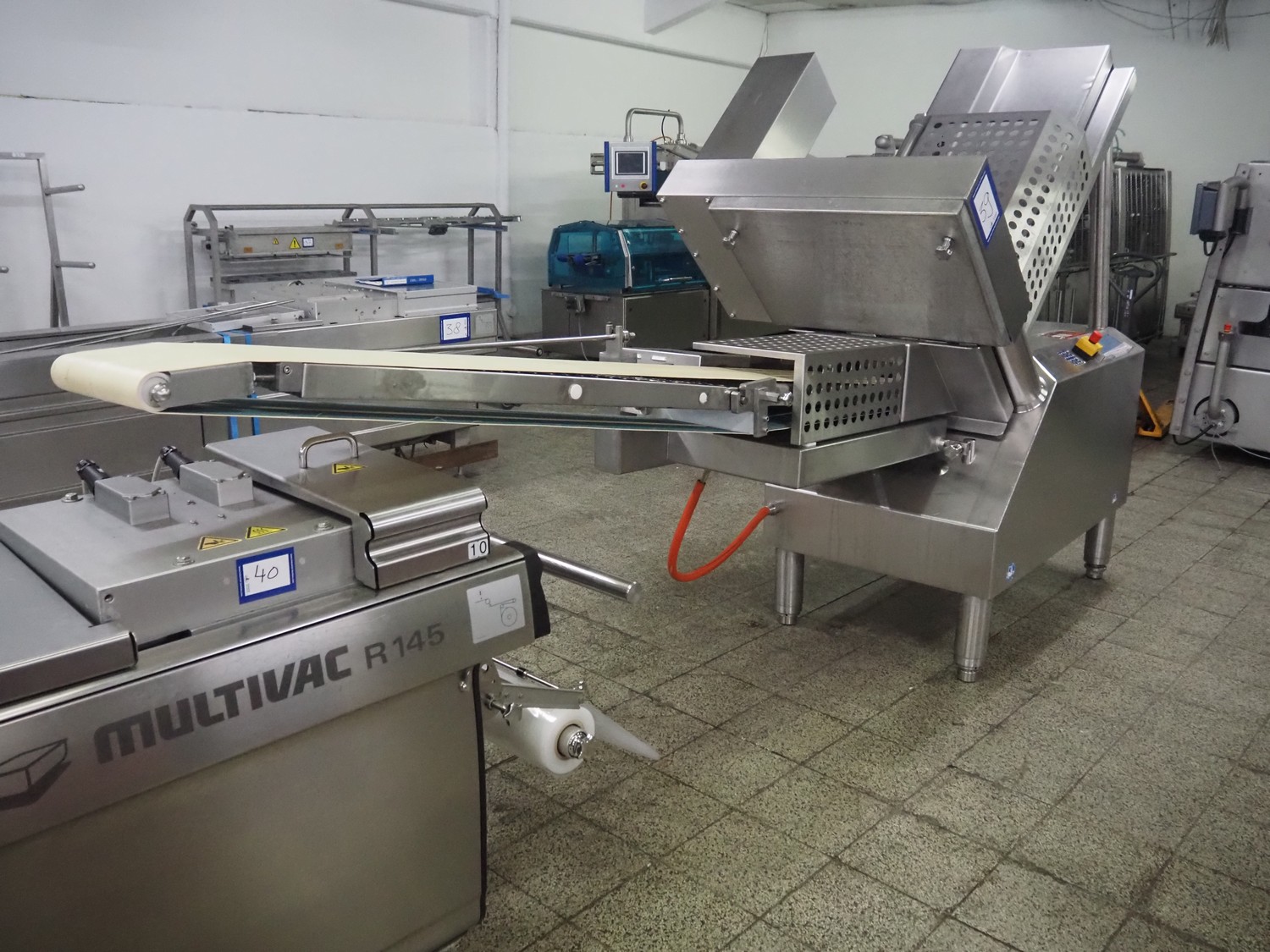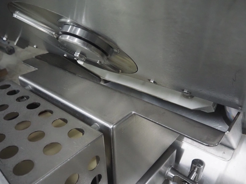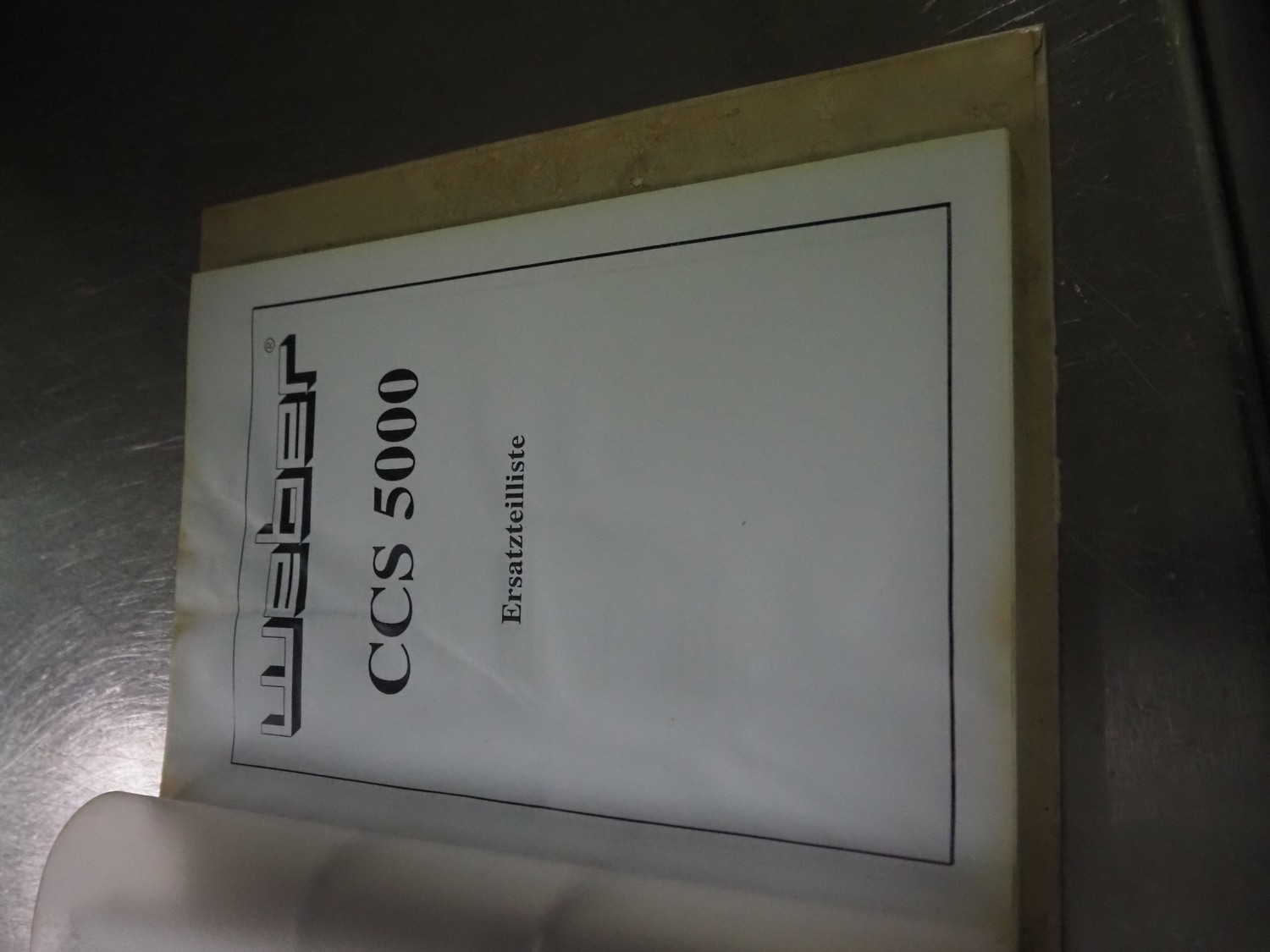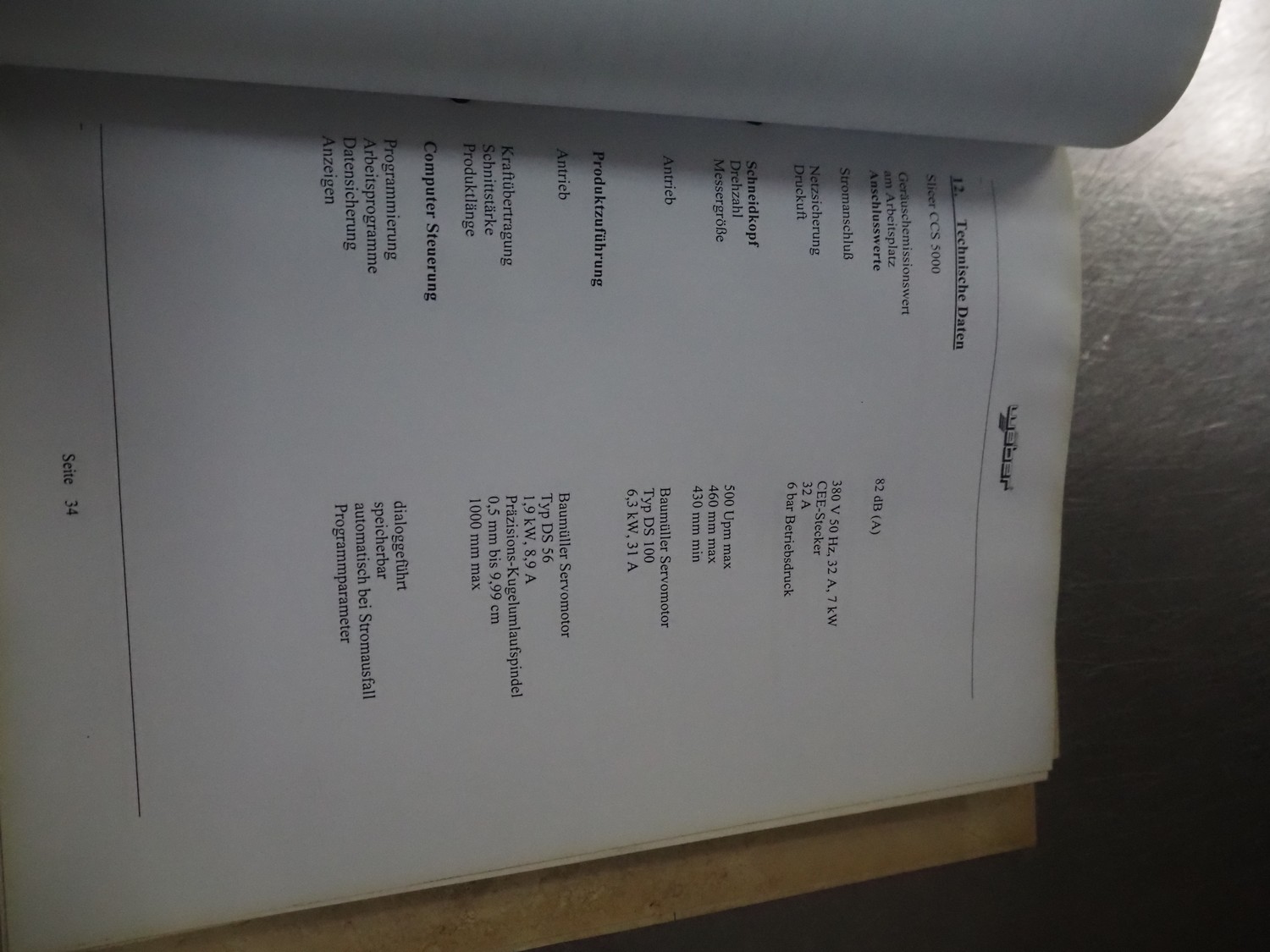 Weber slicer, type: CCS5000, number: 397, 400 V, 50 Hz, 7 kW, plastic belt, belt width: 300 mm, diameter knive: 300 mm, clearance: 300 mm x 135 mm, total dimensions: 3930 mm x 1100 mm x 2200 mm.