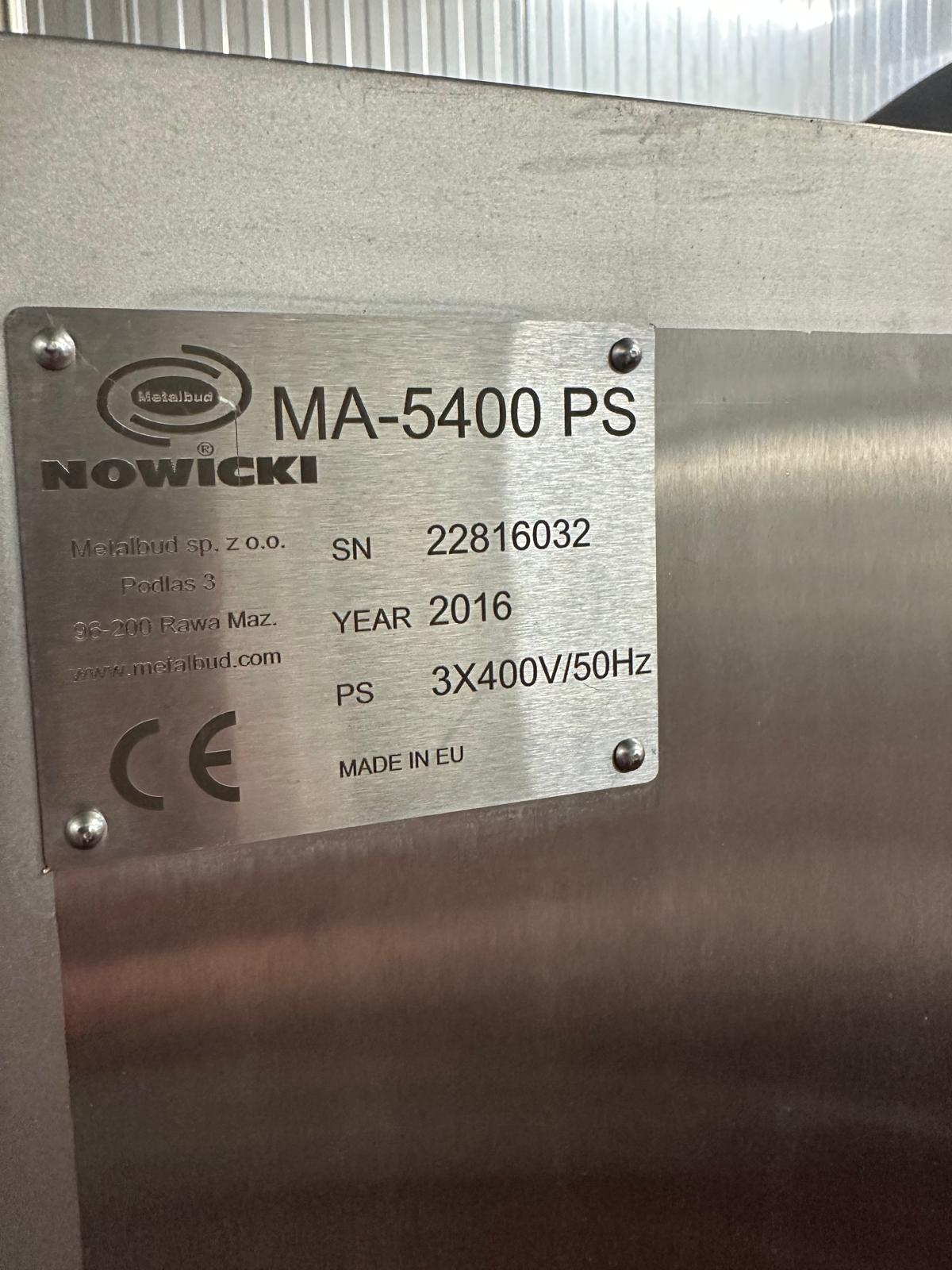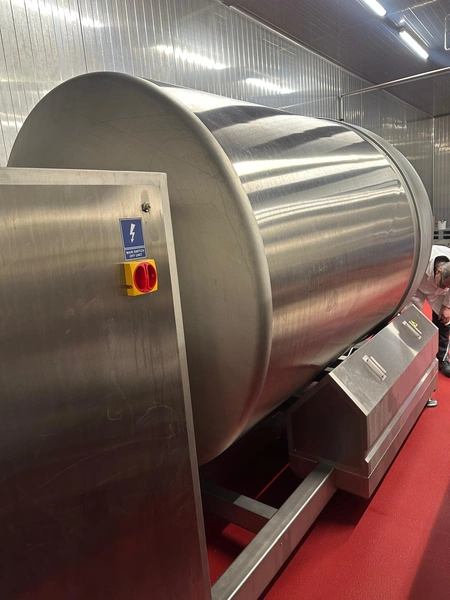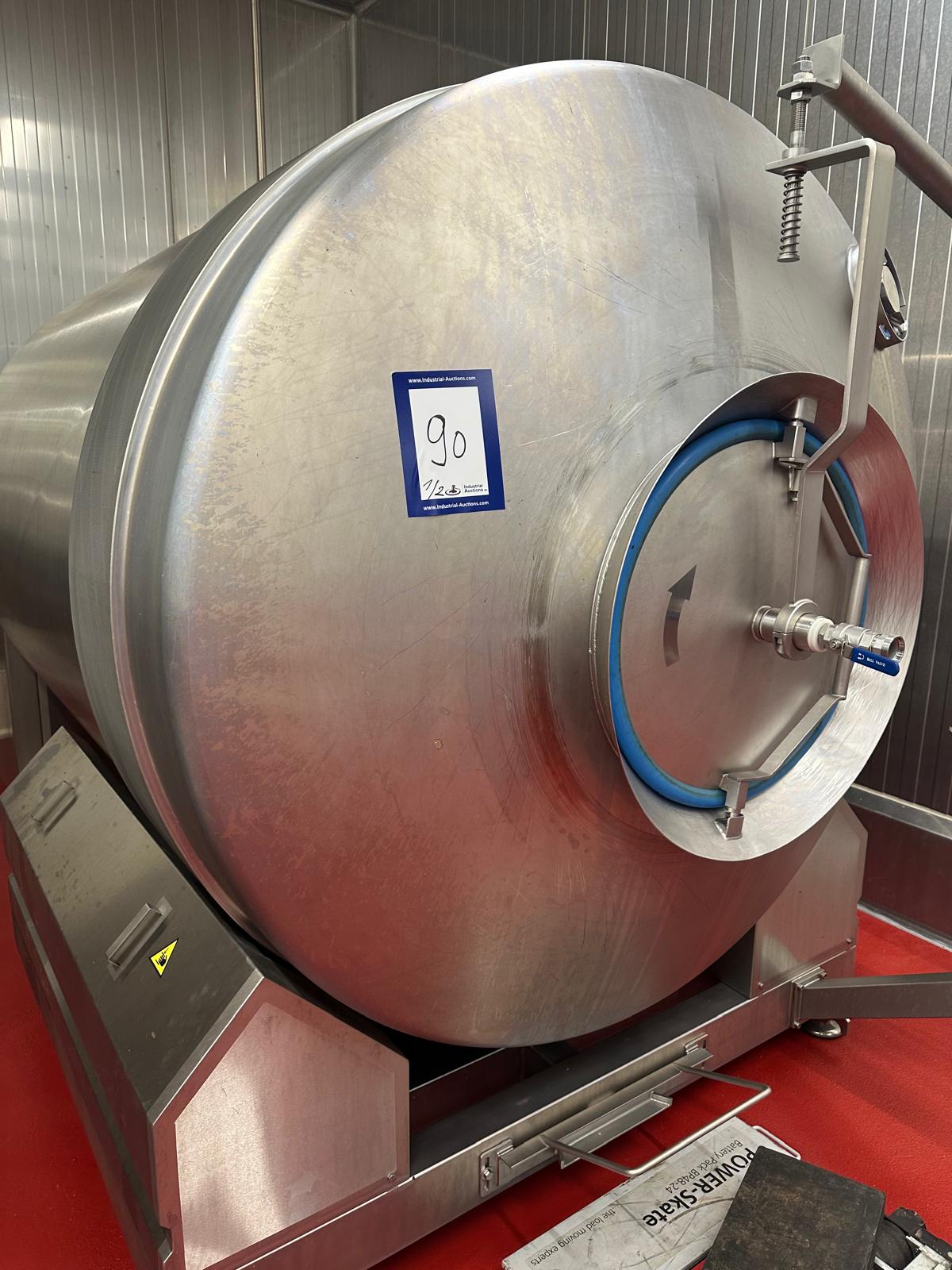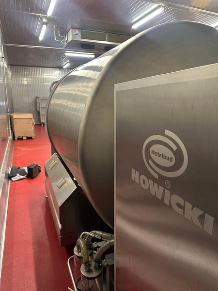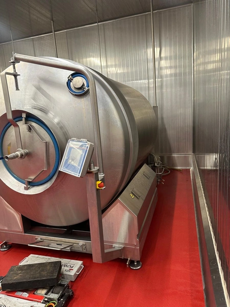 Nowicki vacuum tumbler, type: MA-5400 PS, serial number: 22816032, year of construction: 2016, 400 V, 3 Ph, 50 Hz, machine weight: 3500 kg, Busch vacuum pump, type: RA 0100 F 503, serial number: D16011619, capacity: 100 m³/per hour, total dimensions: 5000 mm x 2200 mm x 2300 mm.