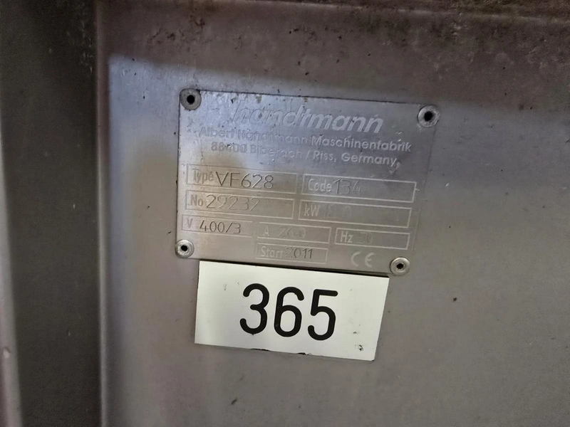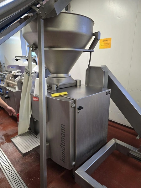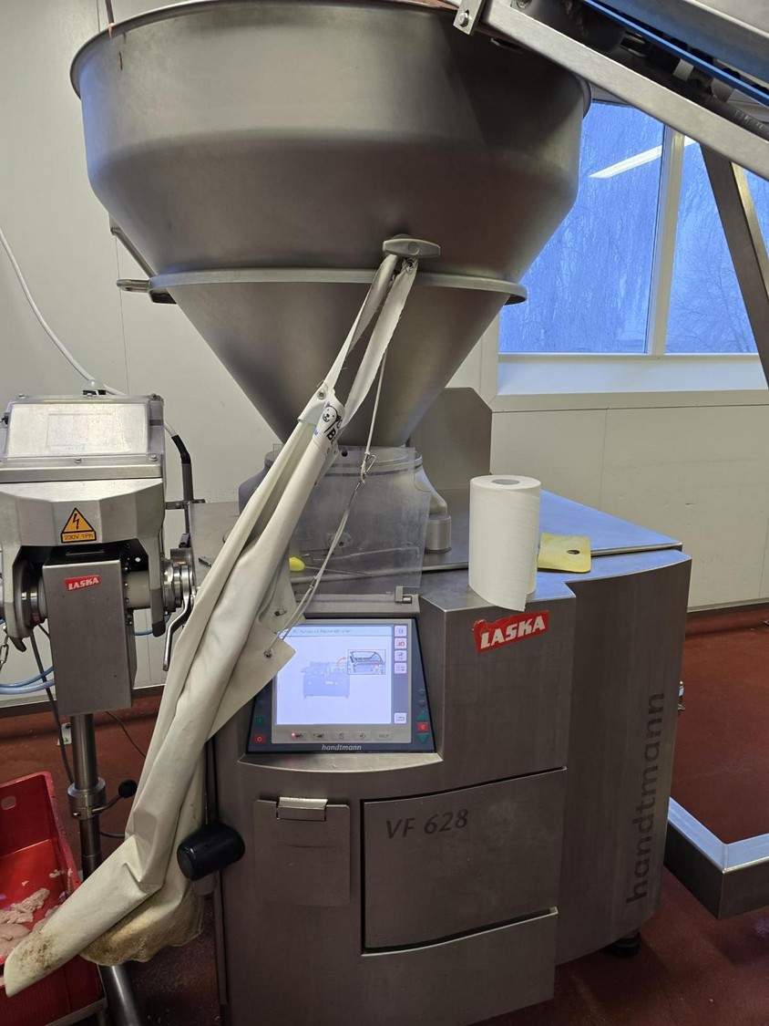 Handtmann vacuum filling machine with lifter for 200 liter meat bins, type: VF628, number: 29232, year of construction: 2011, 400 V, 3 Ph, 50 Hz, 18.0 kW, 26.0 A, 1400 kg, dimensions: 2200 mm x 1600 mm x 2225 mm. Including grinding head, type: GD 93-3. Additional images of this lot will be published on Friday, March 20.
