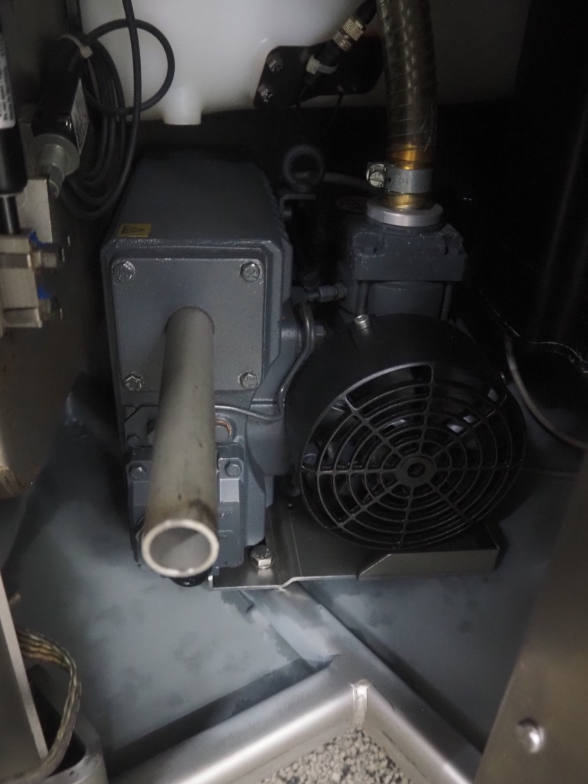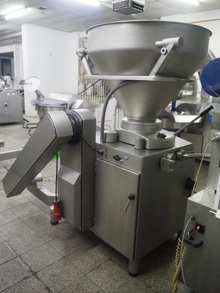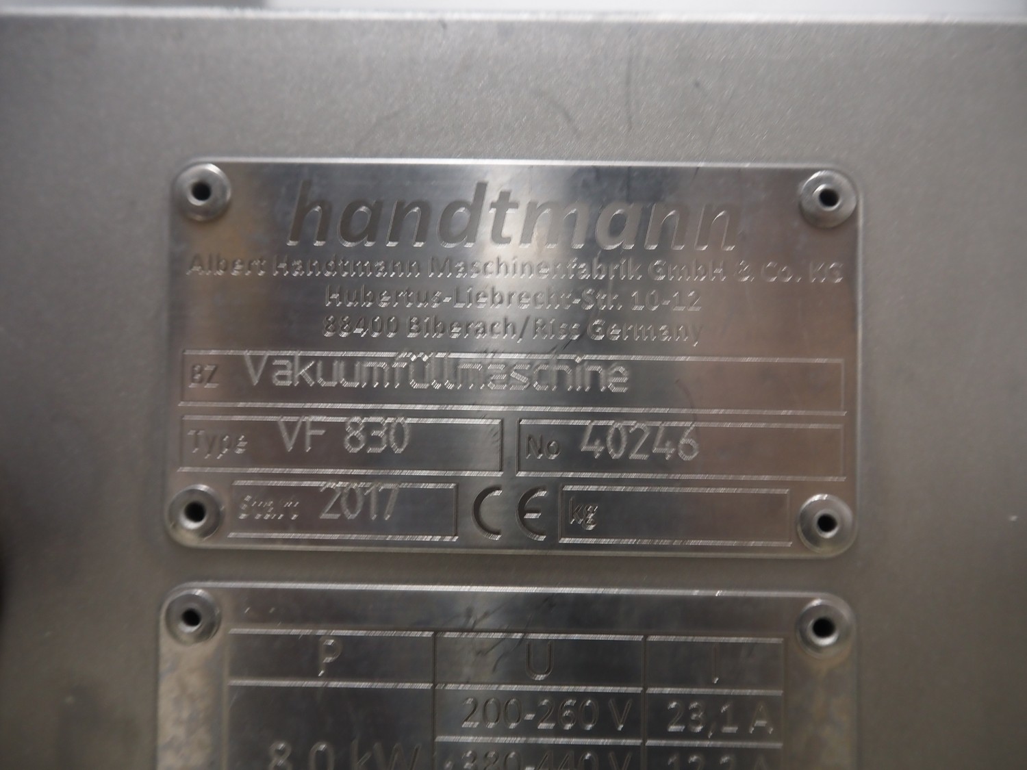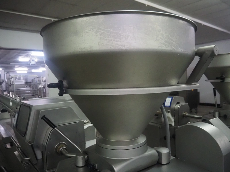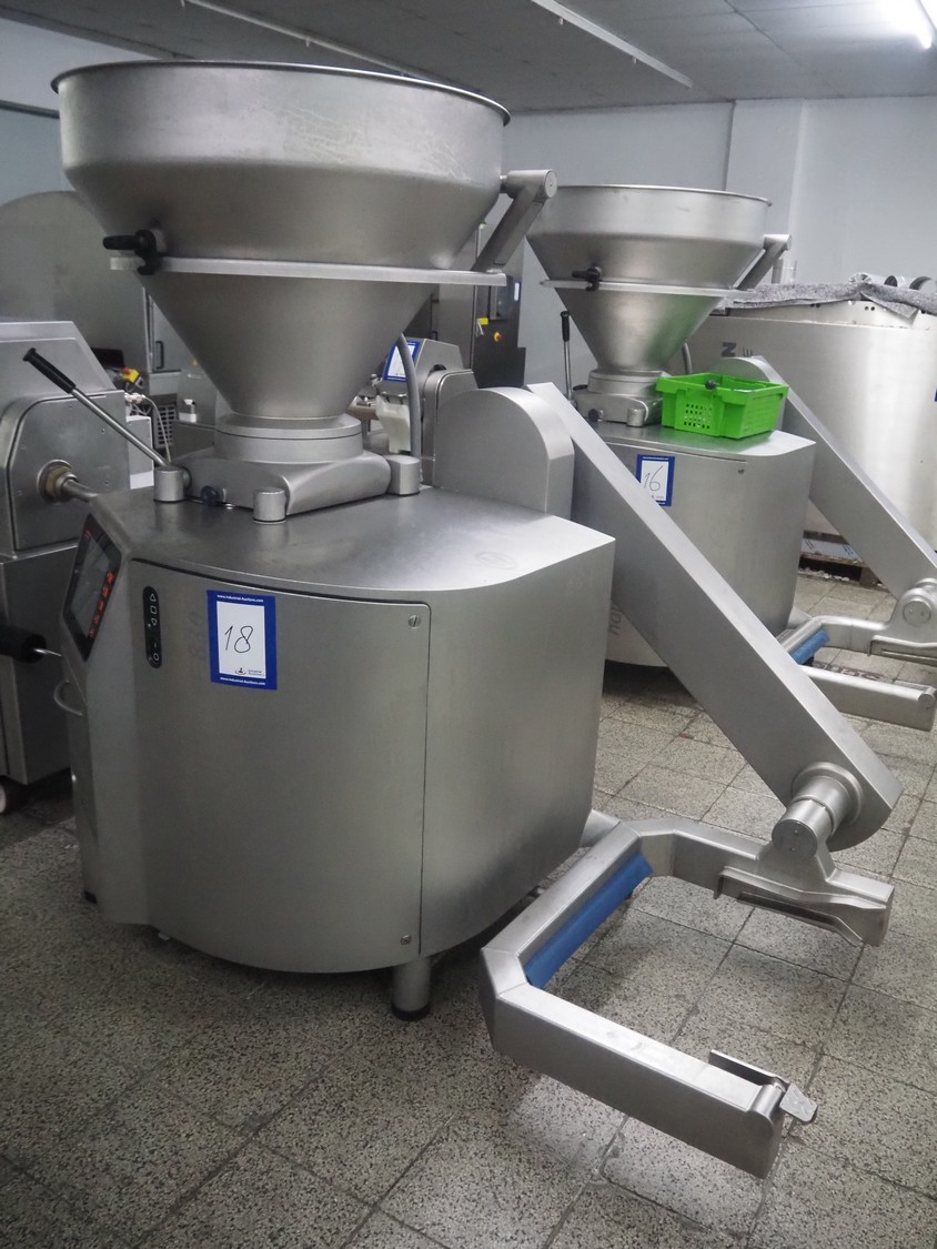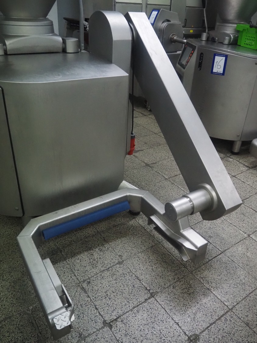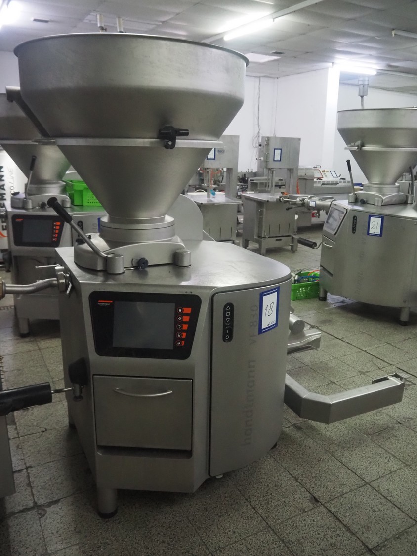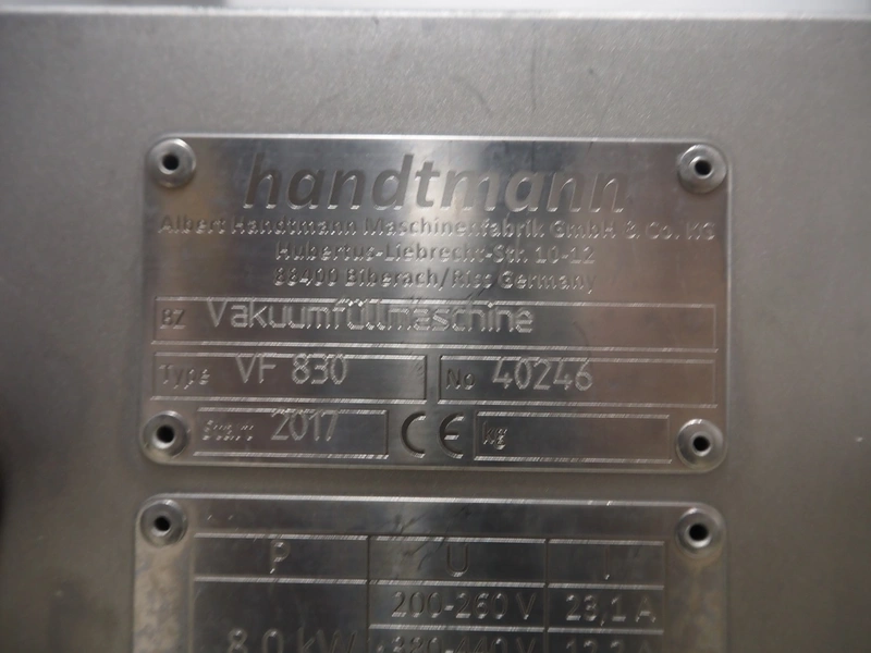 Handtmann vacuum filling machine with lifter for meat bins, type: VF 830, number: 40246, year of construction: 2017, 200/260 V, 50/60 Hz, 13.1 A, 8.0 kW, Busch vacuum pump, dimensions: 2300 mm x 1450 mm x 2030 mm. Crate with extra part.