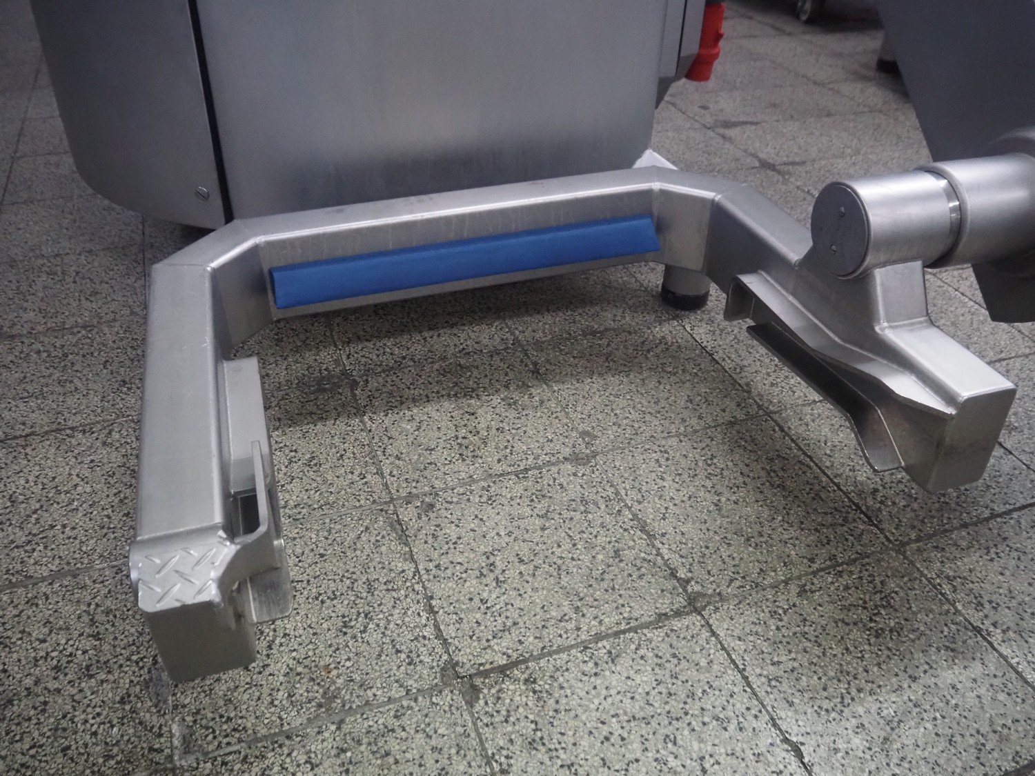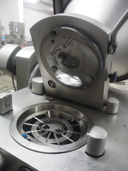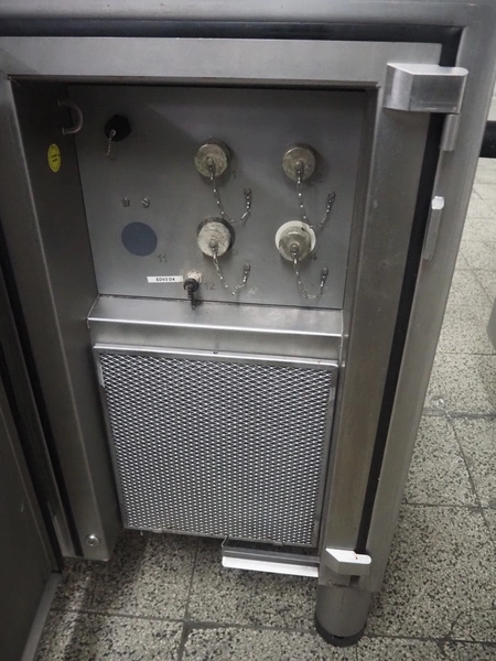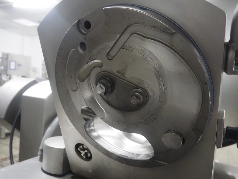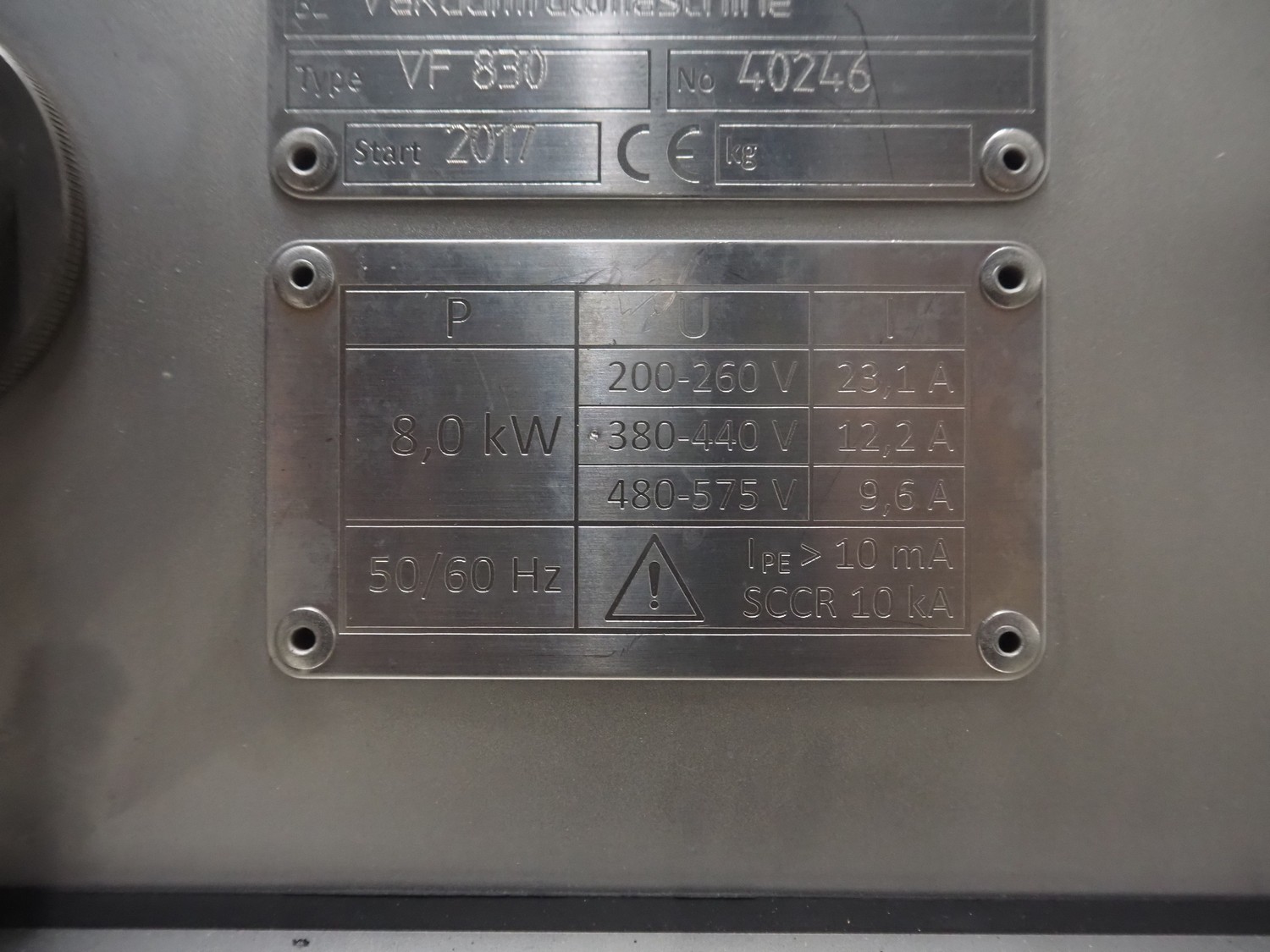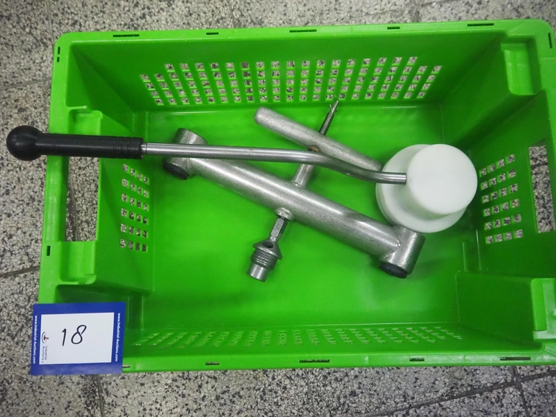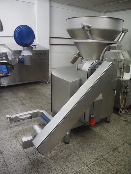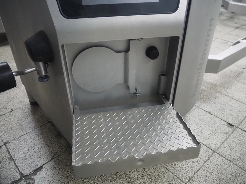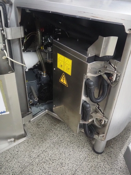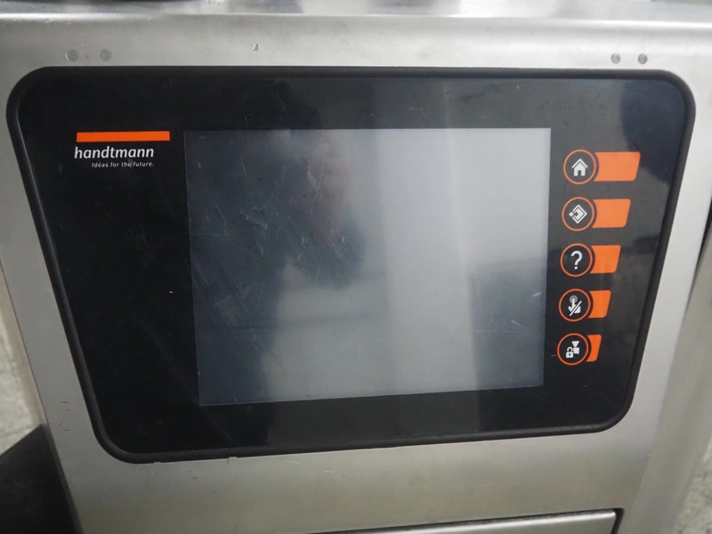 Handtmann vacuum filling machine with lifter for meat bins, type: VF 830, number: 40246, year of construction: 2017, 200/260 V, 50/60 Hz, 13.1 A, 8.0 kW, Busch vacuum pump, dimensions: 2300 mm x 1450 mm x 2030 mm. Crate with extra part.