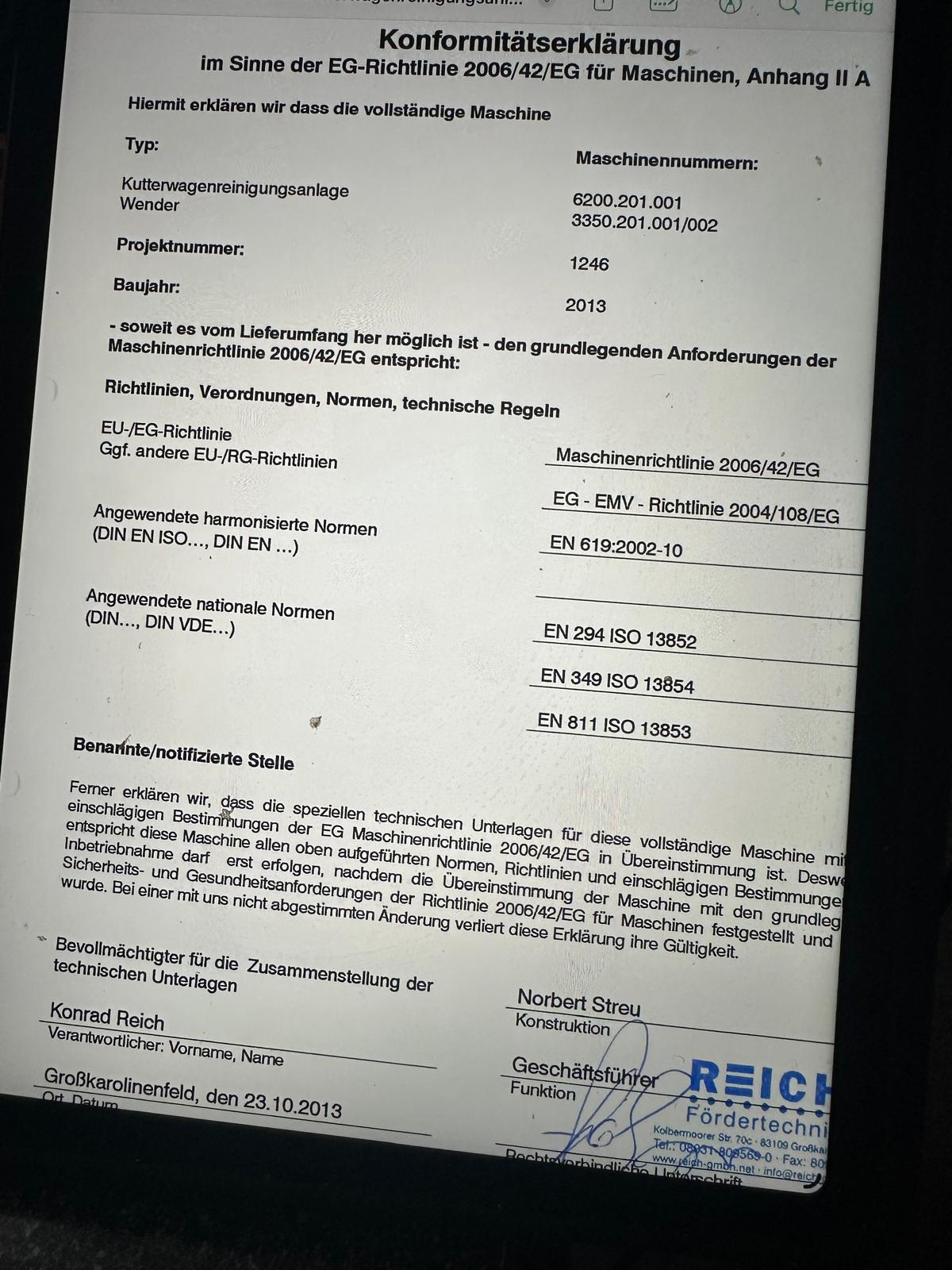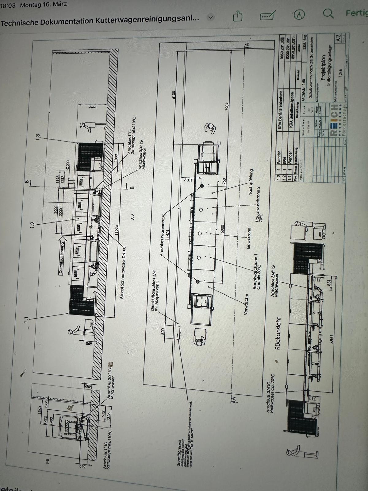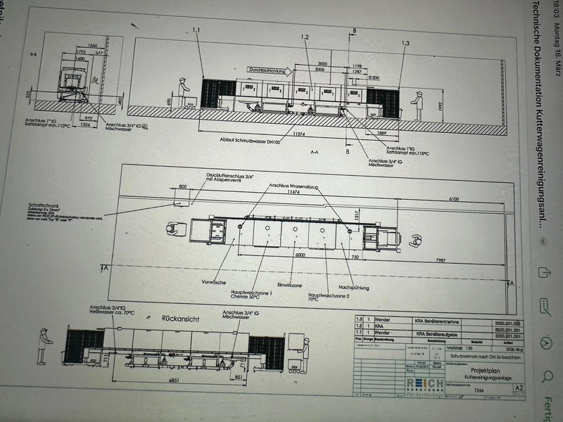 Reich 200 liter meat bin washer with lifter, year of construction: 2013, clearance: 850 mm x 740 mm, belt width: 770 mm, total dimensions: 9200 mm x 1550 mm x 2050 mm. Including lifter for meat bins, type: Wender, number: 1246, dimensions: (2x) 1550 mm x 1450 mm x 2160 mm.