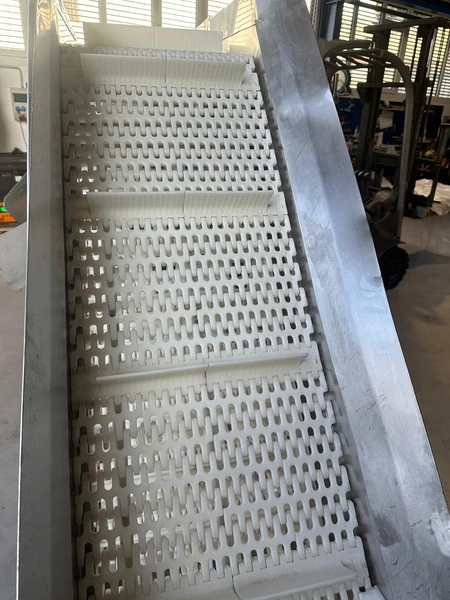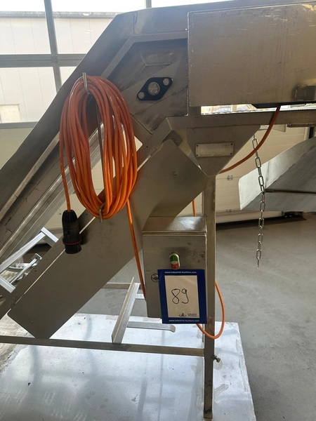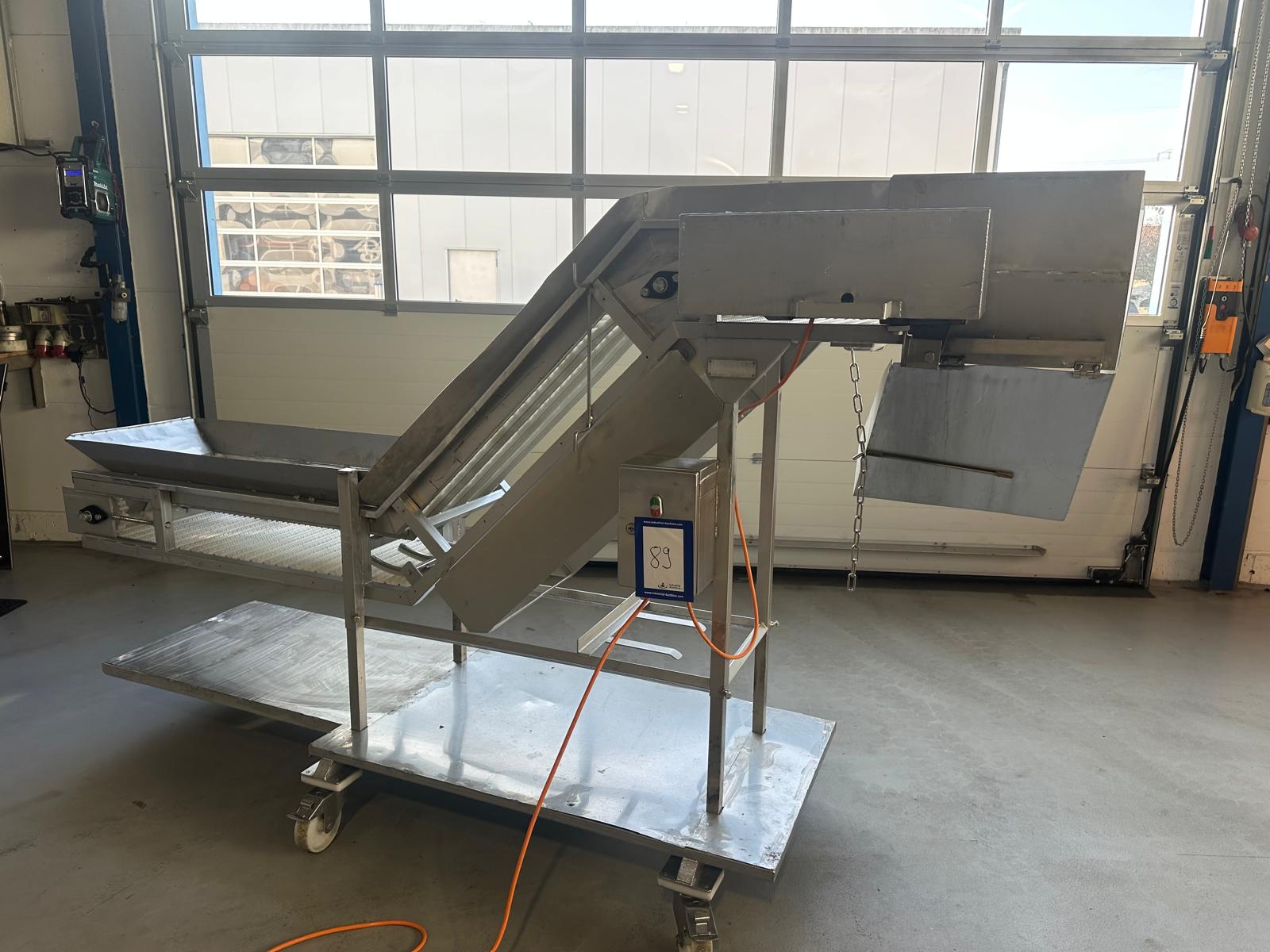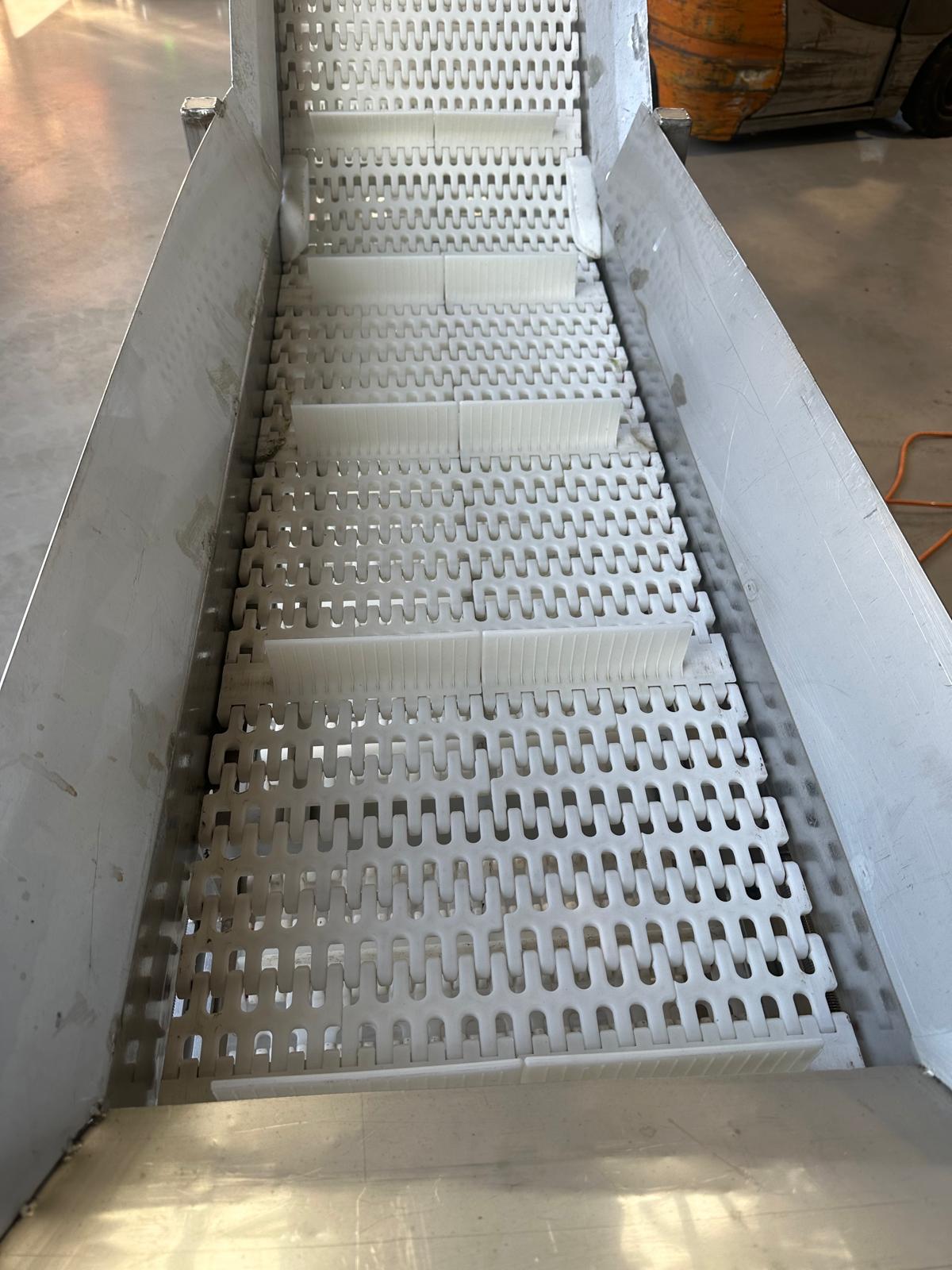 Mobile elevating belt, year of construction: 2015, plastic mesh belt, belt width: 400 mm, elevating height: 1800 mm, total dimensions: 2500 mm x 900 mm x 2000 mm.