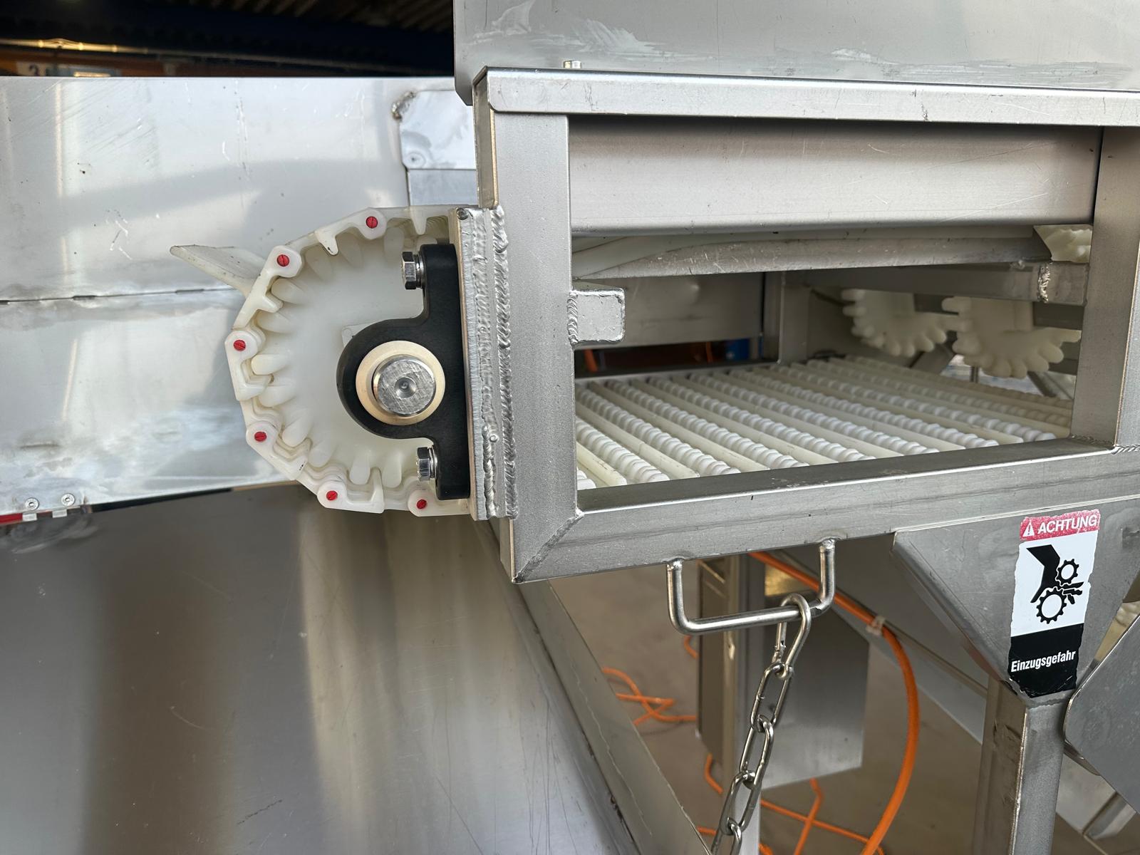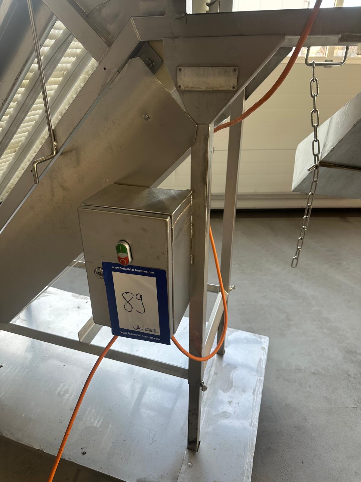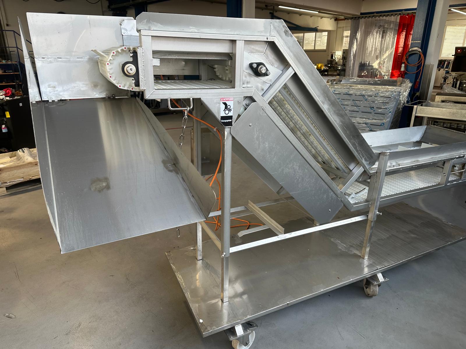 Mobile elevating belt, year of construction: 2015, plastic mesh belt, belt width: 400 mm, elevating height: 1800 mm, total dimensions: 2500 mm x 900 mm x 2000 mm.