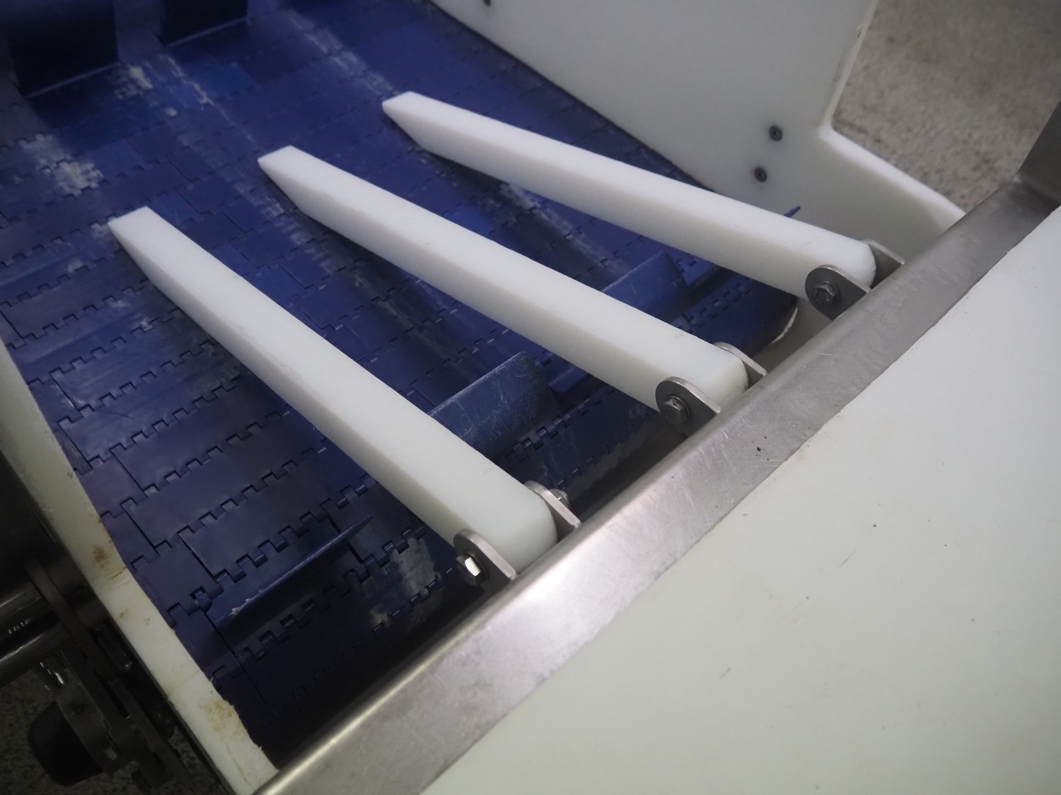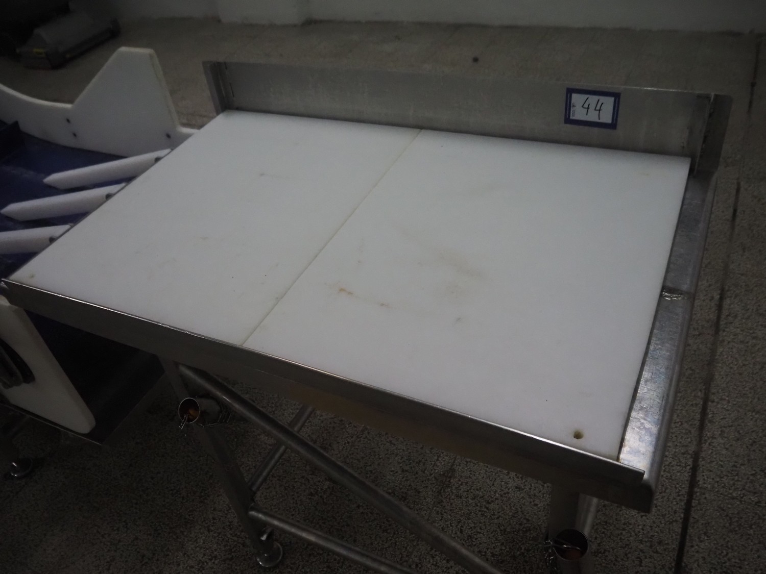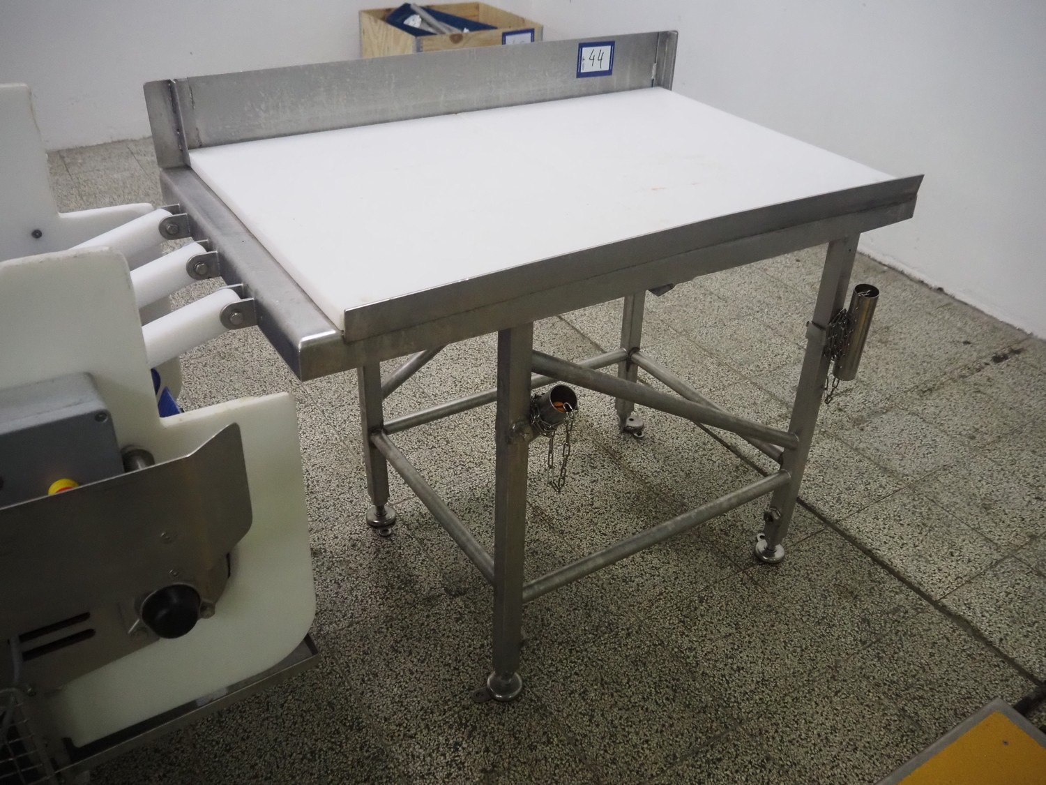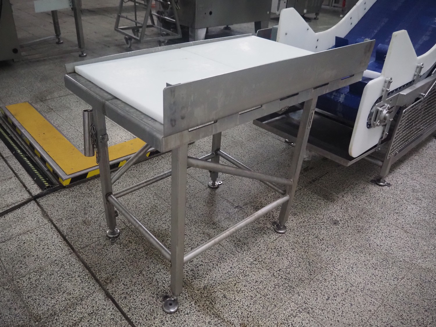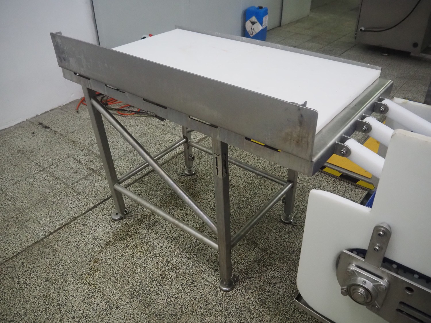 Infeed table with plastic work top, s/s frame, dimensions: 1260 mm x 720 mm x 1070 mm.