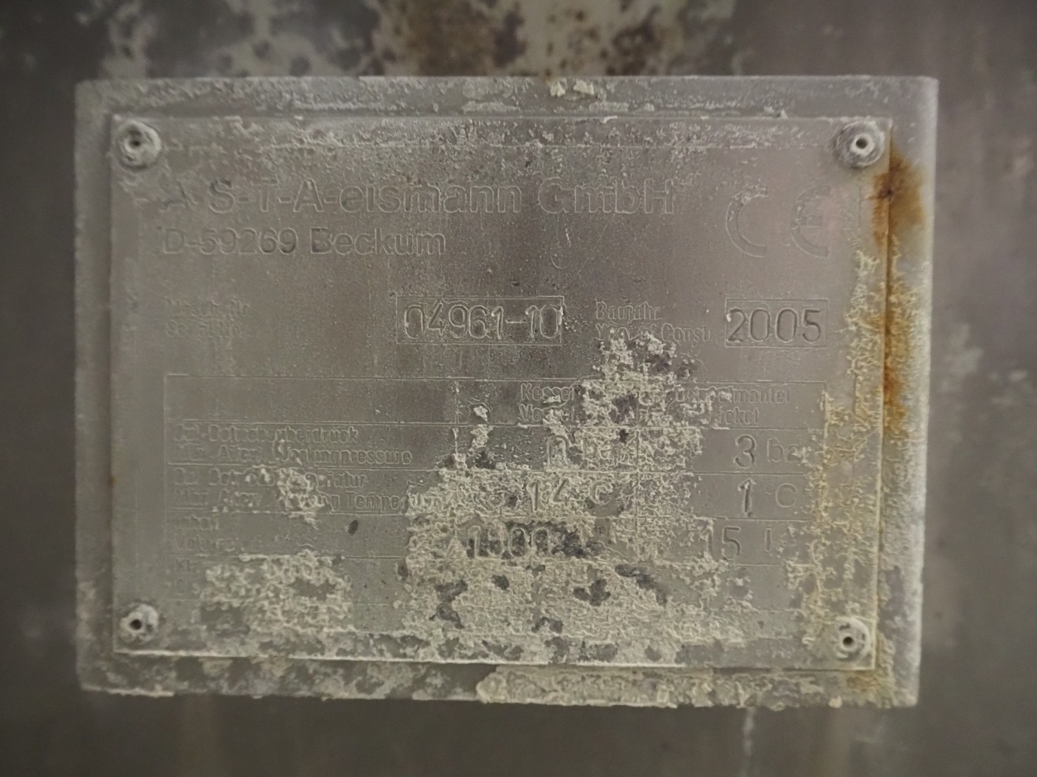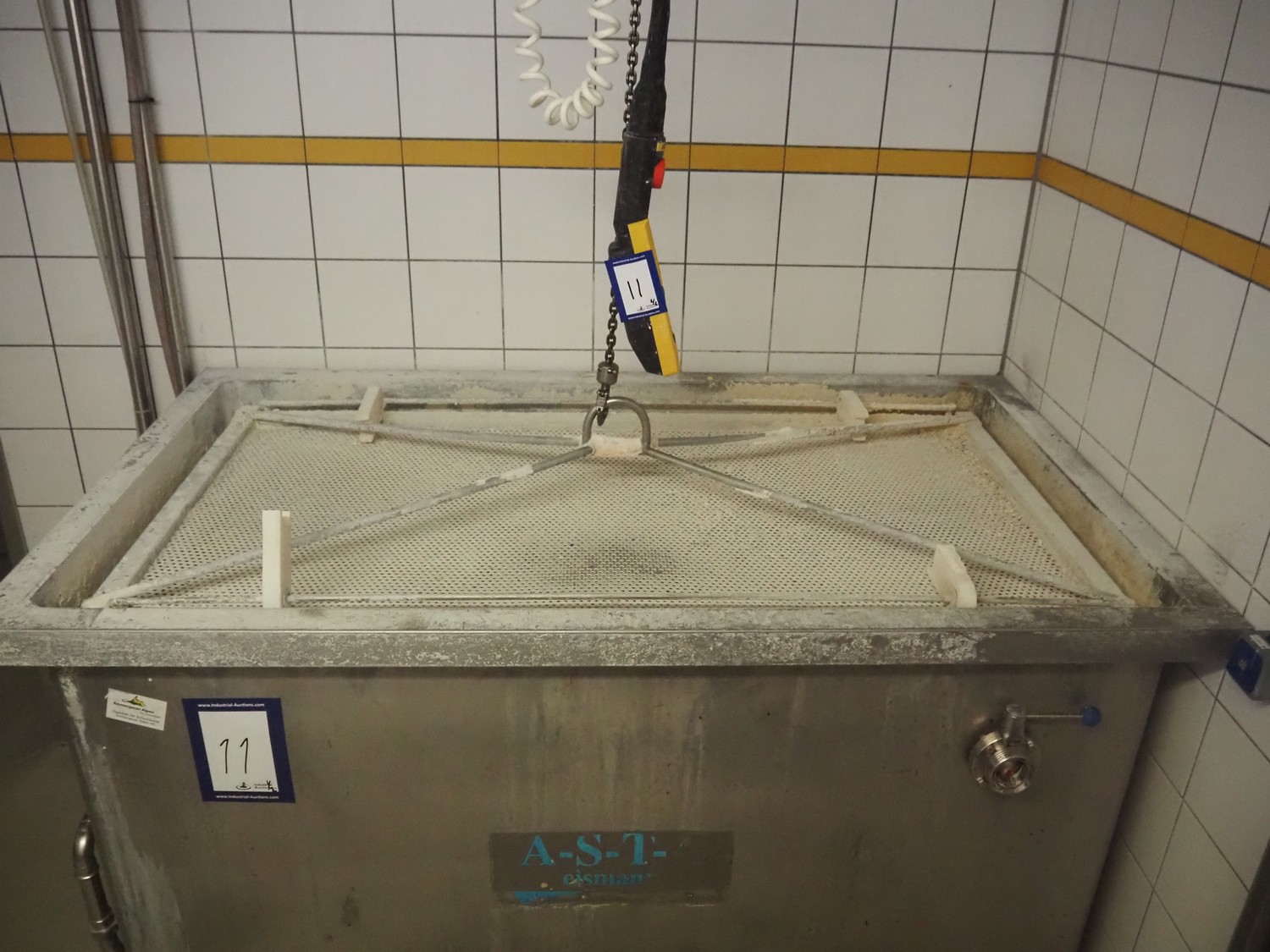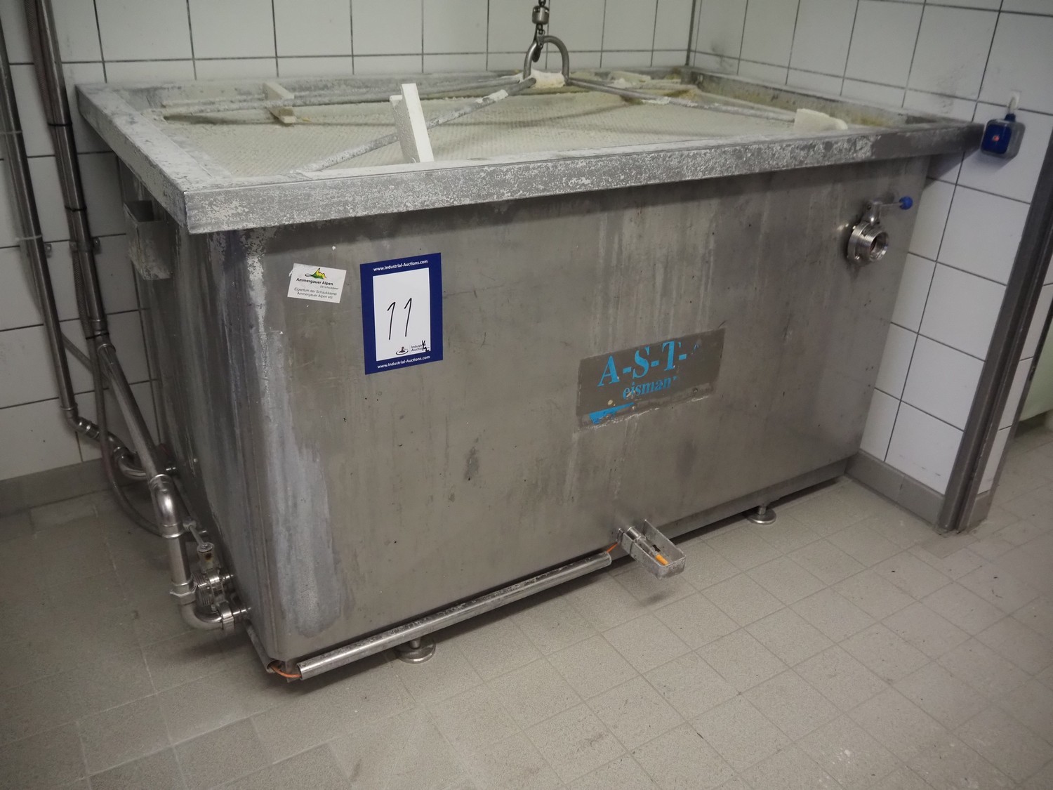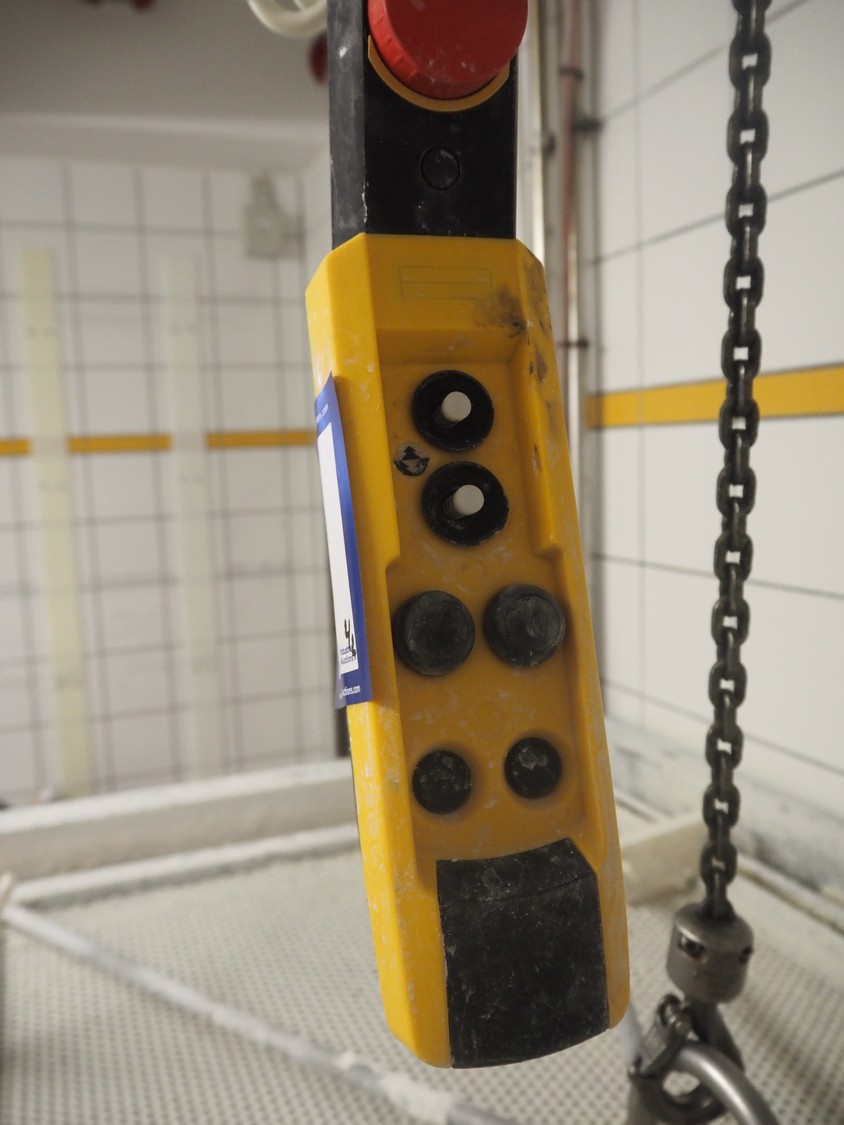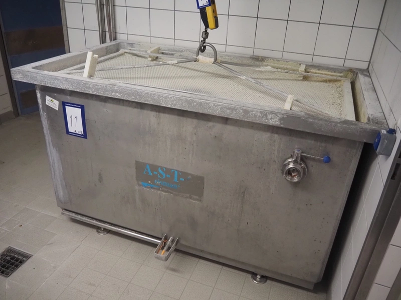 ASTA eismann s/s double jacketed brine tank, serial number: 04961-10, year of construction: 2005, volume: 1500 liter, dimensions: 1900 mm x 1070 mm x 1100 mm. Including Abus chain hoist, type: GM 4 500 8-1, serial number: 220-008912, year of construction: 2005, 400 V, 50 Hz, 2.1 A, 0.22 / 0.9 kW, capacity: 500 kg.