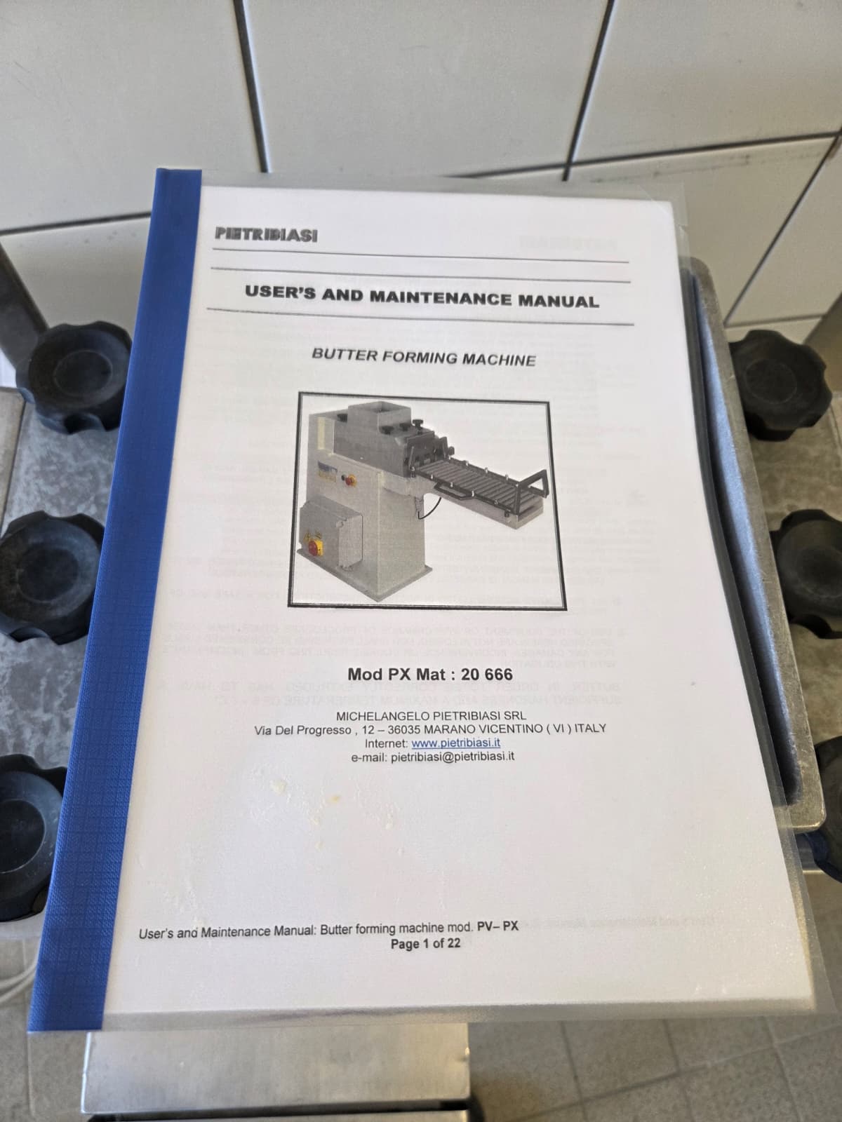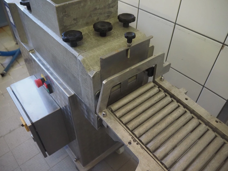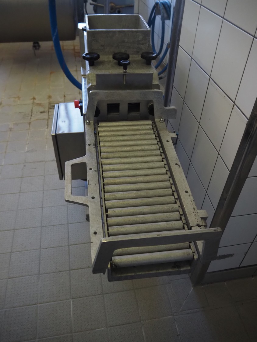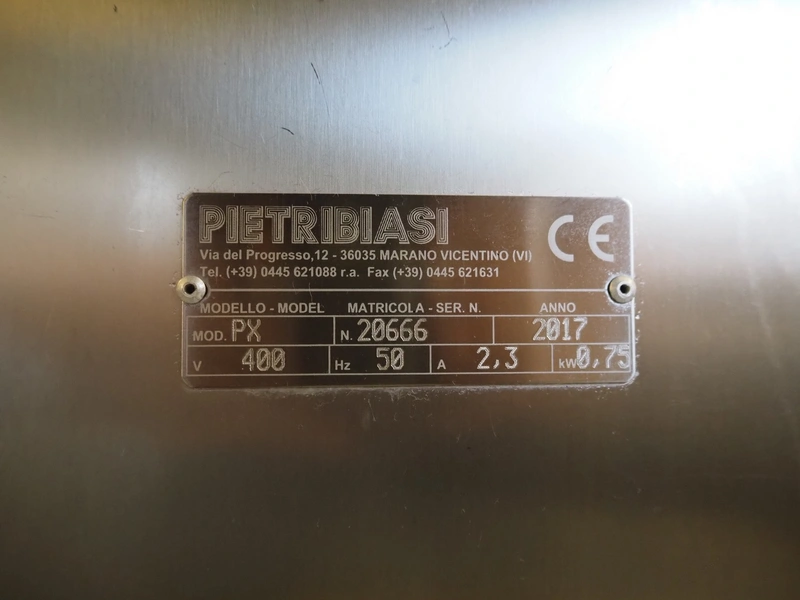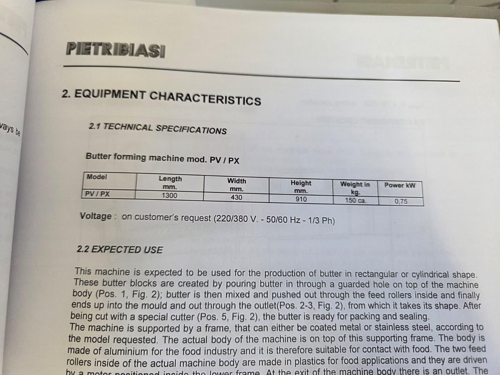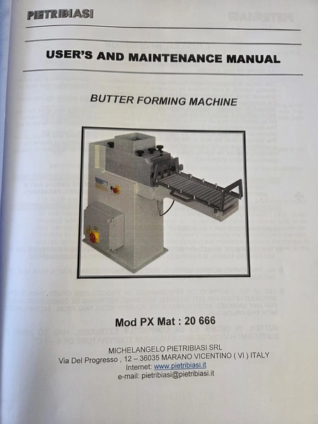 Pietribiasi mobile butter forming machine, model: PX, serial number: 20666, year of construction: 2017, 400 V, 50 Hz, 2.3 A, 0.75 kW, clearance infeed: 200 mm x 200 mm, outfeed: (2x) 40 mm x 60 mm and 80 mm x 80 mm, s/s rollers, roller width: 190 mm, total dimensions: 1270 mm x 500 mm x 1070 mm.