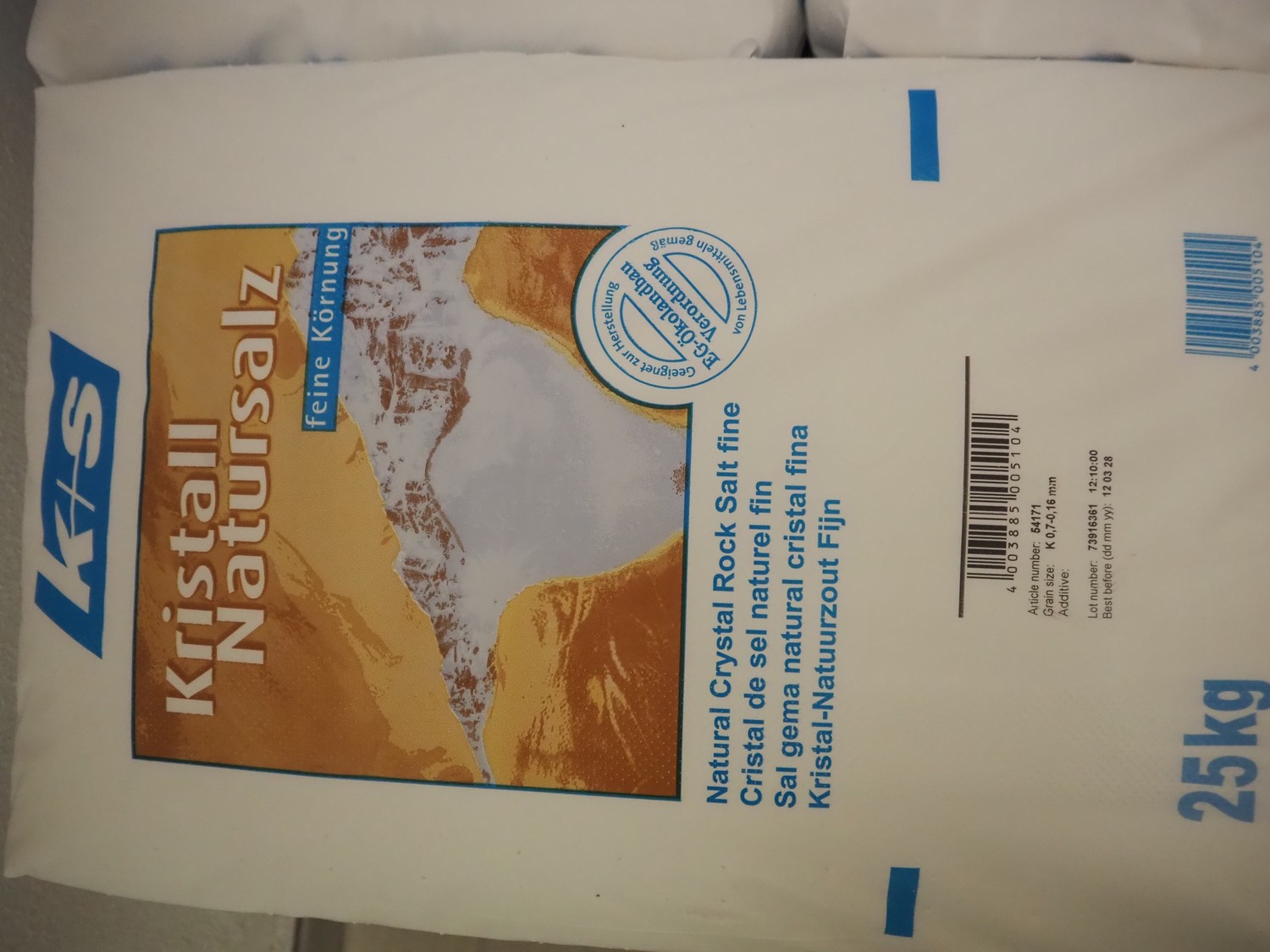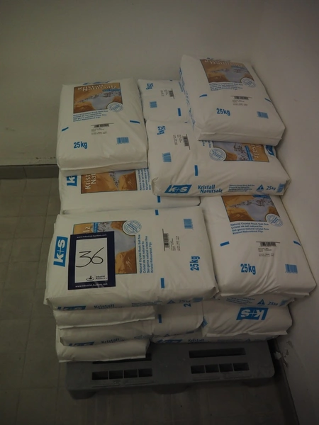 23 bags with K+S natural crystal rock salt fine, 25 kg in each bag, total dimensions: 1200 mm x 800 mm x 700 mm.