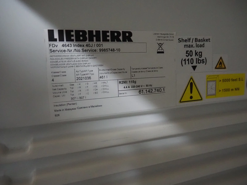 Liebherr refrigerator, type: 2021036, serial number: 61.142.740.1, 220 / 240 V, 50 Hz, 4.4 A, volume: 461 liter, dimensions: 770 mm x 670 mm x 2000 mm.
