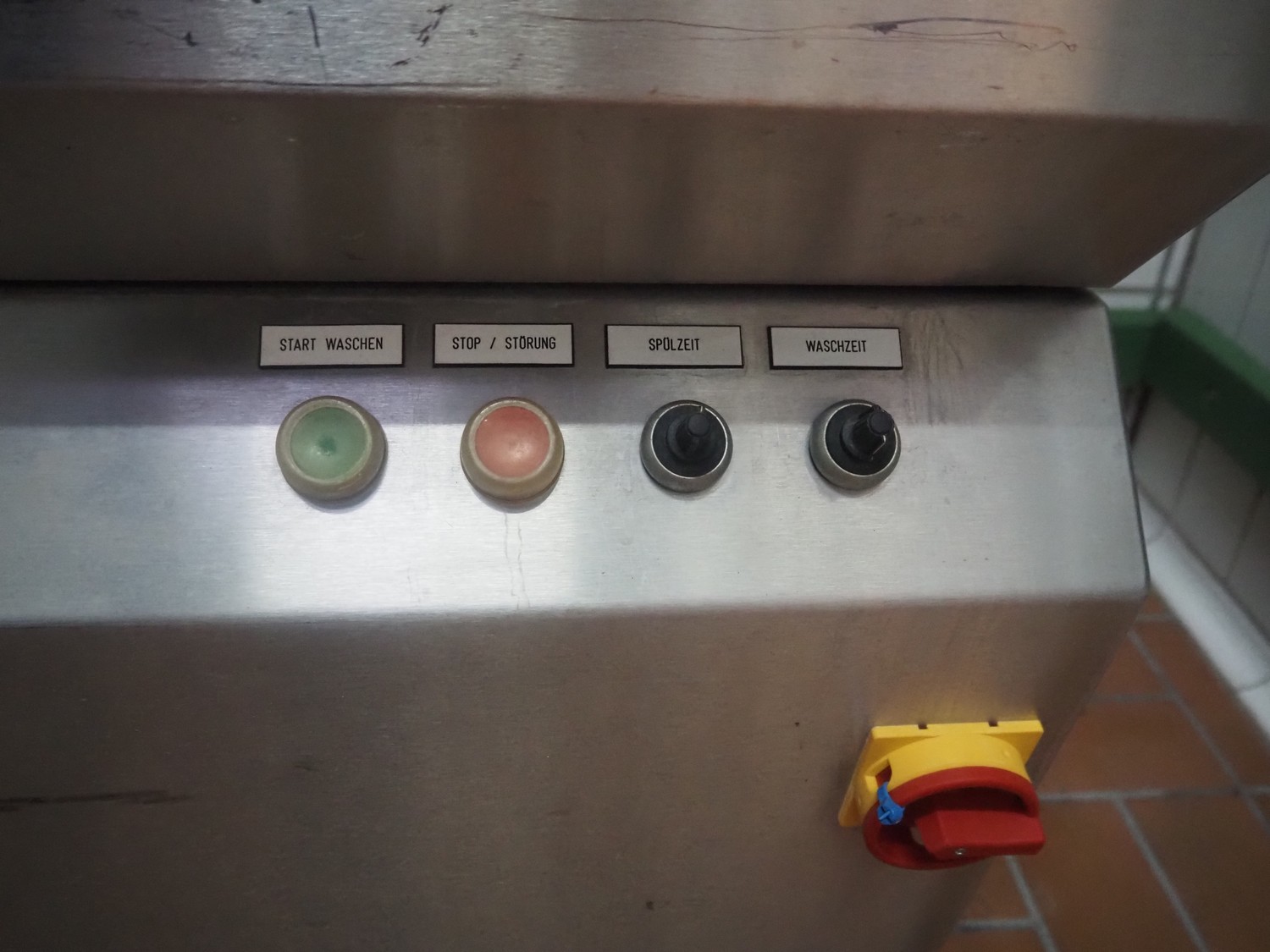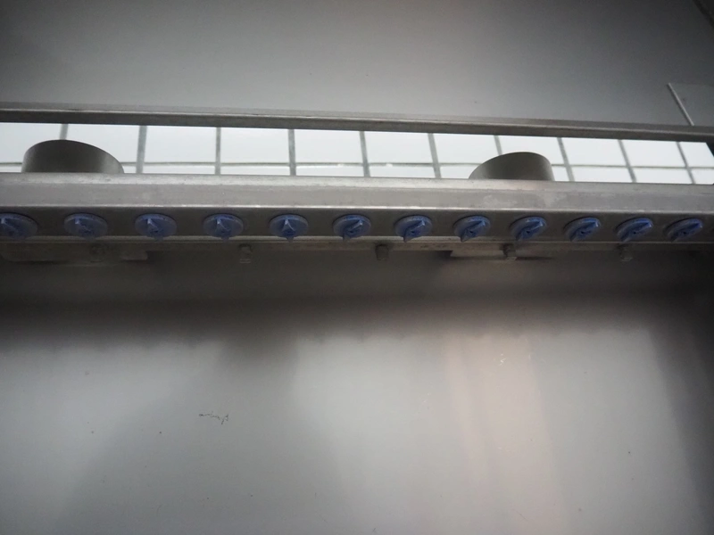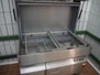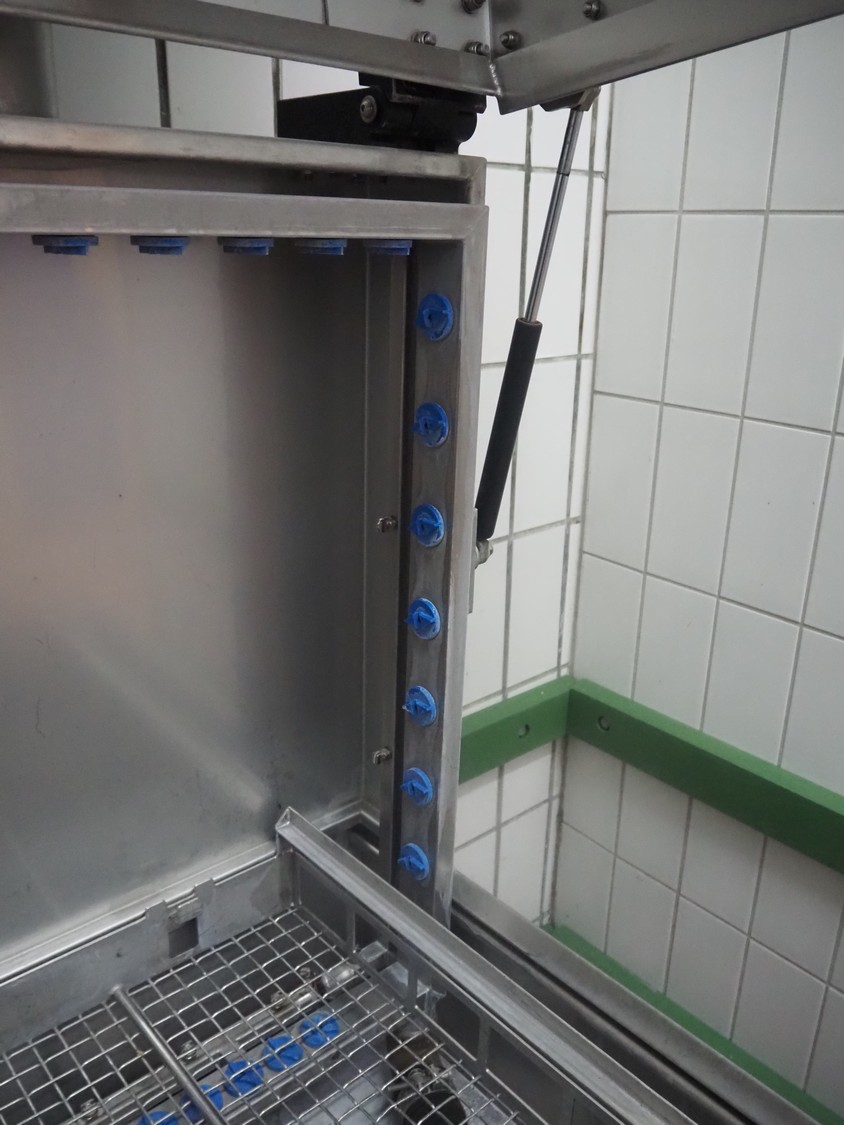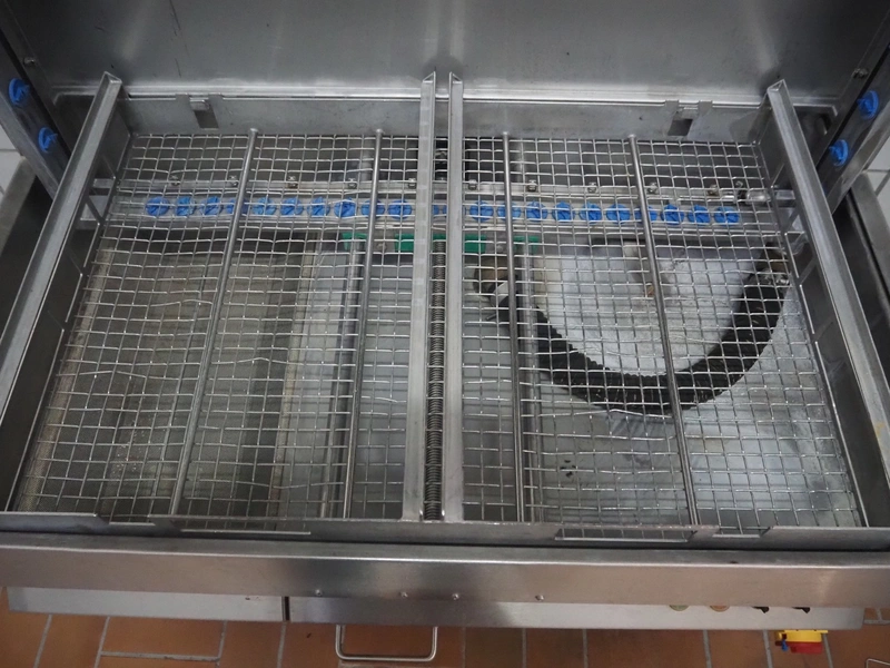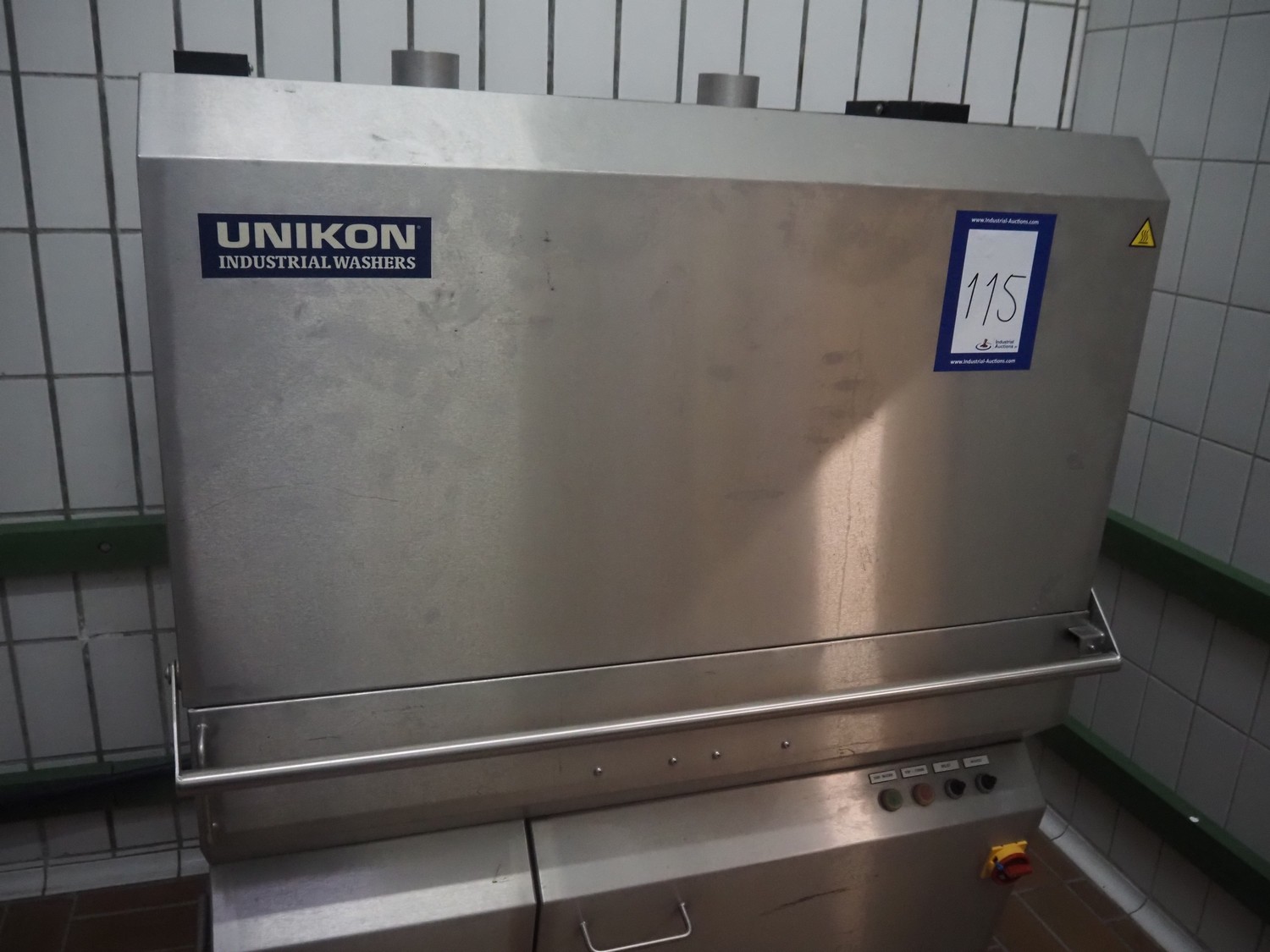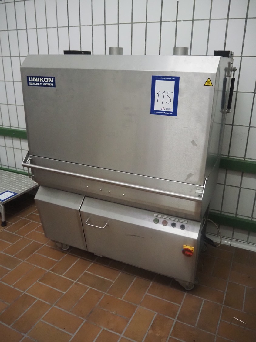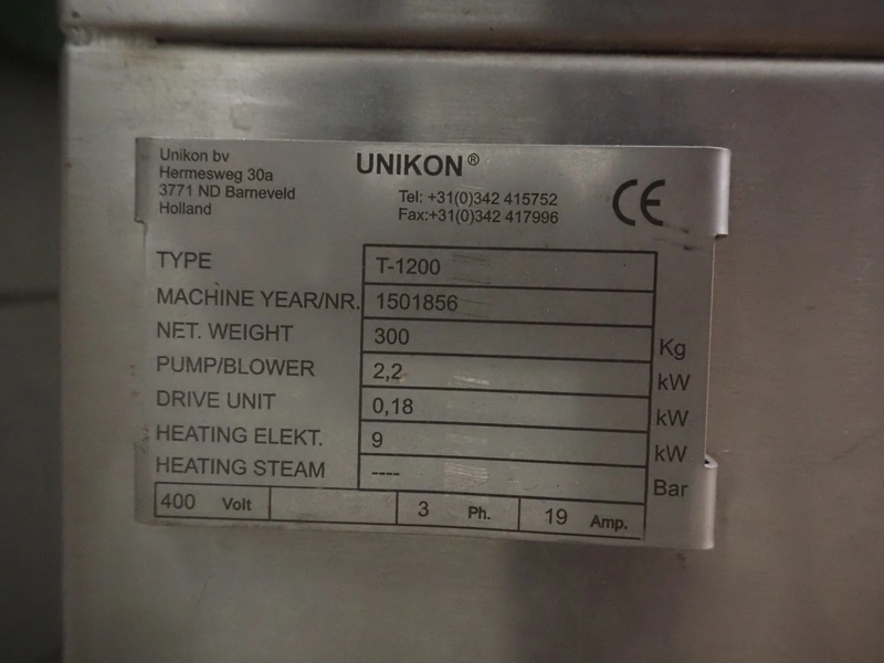 Unikon dishwasher, type: T-1200, machine number/year of construction: 1501856, 400 V, 3 Ph, 19 A, 0.18/2.2 kW, machine weight: 300 kg, clearance: (2x) 640 mm x 440 mm, total dimensions: 780 mm x 1230 mm x 1580 mm.