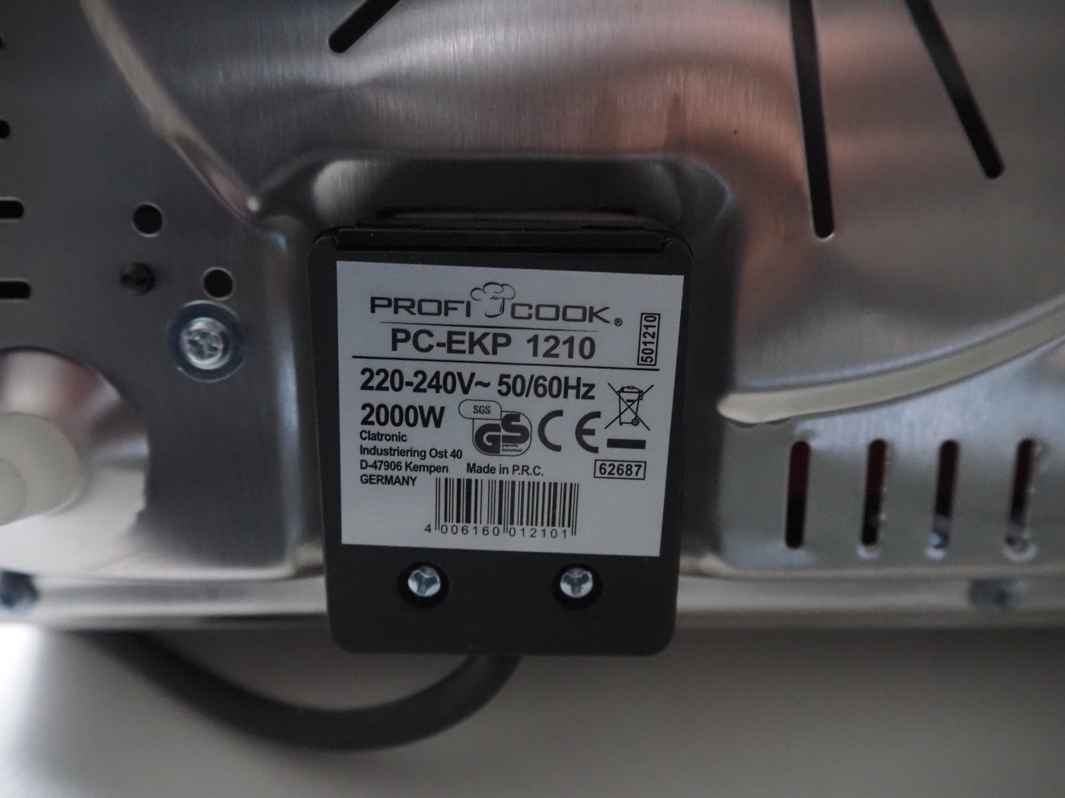 Profi Cook induction cooktop, model: PC-EKP 1210, number: 62687, 220/240 V, 50/60 Hz, 2000 W, diameter cooktop: 210 mm, total dimensions: 300 mm x 380 mm x 80 mm.